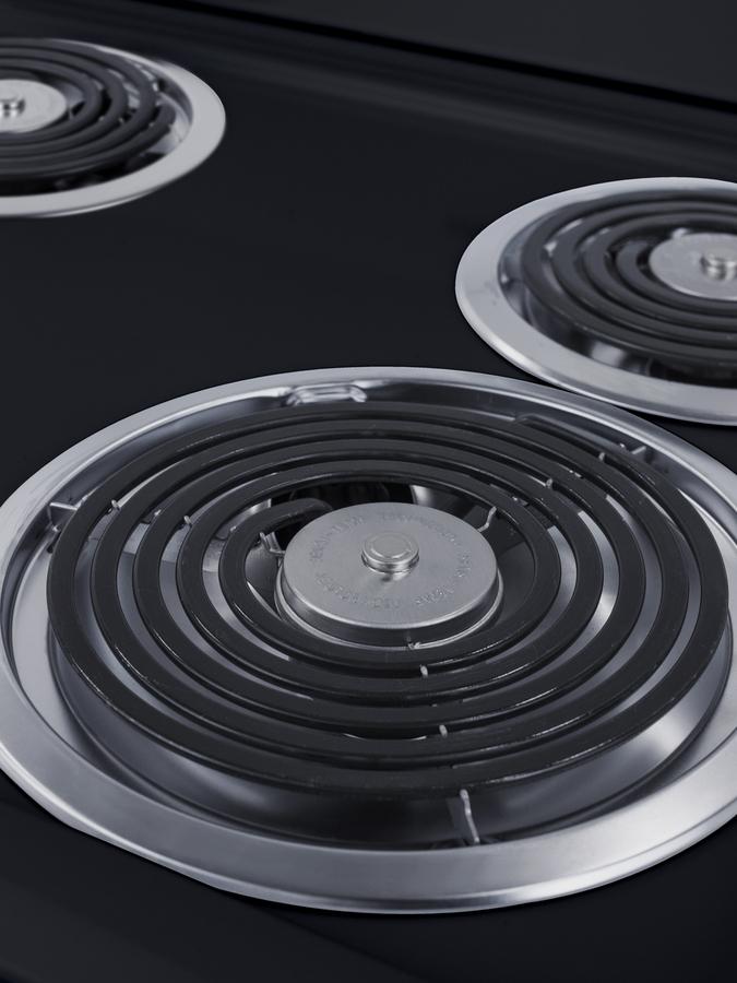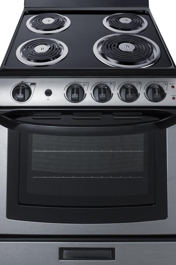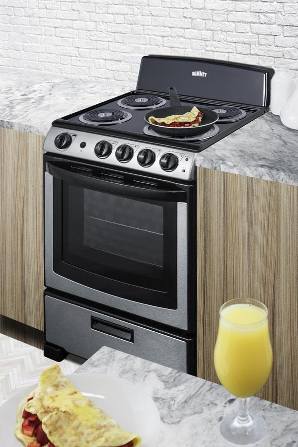 Summit brings outstanding value to small kitchens with fully featured electric ranges in 24" wide fits. Made in North America, the PROEL24SS is a 240V electric range designed for 24" wide spaces. One 8" and three 6" coil burners include removable chrome drip pans for easy cleaning. For added safety, each coil is equipped with a sensor that will automatically cycle the element off if it reaches dangerous flashpoint temperatures. Heating will resume automatically. All cooking controls are located upfront on push-to-turn knobs for safe and easy use. Indicator lights illuminate when the burners and oven are on. The PROEL24SS features a large oven window with an interior light to make it easy for users to monitor their cooking. Inside, the 2.9 cu.ft. interior is made from durable porcelain and includes two adjustable racks. The waist-high broiler is conveniently located inside, letting you finish your cooking without transferring contents to an inconvenient drop-down compartment on the floor. The unit's lower compartment is a slide-out storage drawer for added convenience. The PROEL24SS comes with a stainless steel exterior door with a jet-black handle and knobs for a contemporary kitchen design. With its slim fit and user-friendly features, this unit is the ideal choice for space-challenged kitchens on a budget. For this unit in a 20" width see model PROEL20SS. For this unit in white see model RE2411W. Summit also manufactures smooth-top ranges and gas units. Browse our website to explore the complete cooking collection.