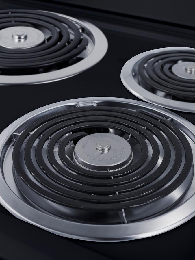 Summit brings unmatched value and convenience to apartments, tiny homes, and other small kitchens with fully featured electric ranges in 20" wide fits. Made in North America, the RE2031B is a 240V electric range designed for 20" wide spaces, featuring one 8" and three 6" coil burners. For added safety, each coil is equipped with a sensor that will automatically cycle the element off if it reaches dangerous flashpoint temperatures. Heating will resume automatically. All cooking controls are located upfront on push-to-turn knobs for safe and easy use. Indicator lights illuminate when the oven is in use. The RE2031B features a large 2.3 cu.ft. oven made from durable porcelain, with two adjustable racks. The waist-high broiler is conveniently located inside, letting you finish your cooking without transferring contents to an inconvenient drop-down compartment on the floor. The RE2031B comes in a black exterior finish with a color-matched handle and knobs. With its slim fit and quality design, this unit is the ideal choice for space-challenged kitchens on a budget. For this unit in white or stainless steel, see models RE203W and PROEL20SS. Summit also manufactures 24" wide choices, smooth-top ranges, and gas units. Browse our website to explore the complete cooking collection.