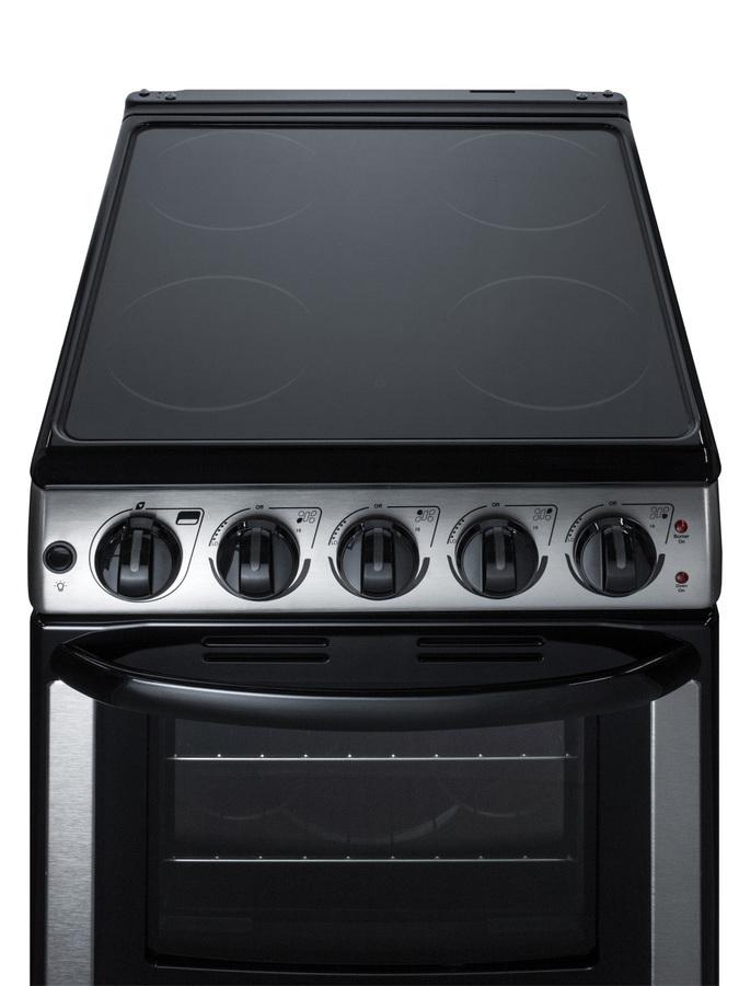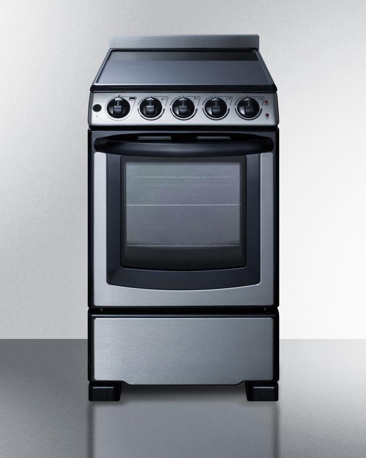 Summit's White Pearl series of North American ranges offers full cooking convenience for apartments and other settings with smaller kitchen spaces. The REX2071SSRT is a 220V electric range sized at just under 20" wide. The front manifold, oven door, and lower panel feature a stainless steel finish, with a black trimmed oven window and handle for a modern look. The versatile design includes a removable 2" high stainless steel backguard, allowing you the choice of a standard range style or a slide-in look with a flat surface that allows you to better integrate the unit with your own backsplash design. The smooth ceramic glass surface includes four 1200W 6 1/2" elements, with a hot surface indicator light for added safety. Inside, the REX2071SSRT features a large 2.3 cu.ft. oven made from durable porcelain enamel. The waist-high broiler function is easy to use, with slide-out oven racks that can be adjusted in four different glide positions for the best fit. We include a small two-piece porcelain broiler tray with a grill cover. The large oven window and interior light make it easy to monitor your cooking. Designed and constructed in North America, the REX2071SSRT is the perfect choice for smaller kitchens with full cooking needs. Additional choices are available in 24" wide fits. Browse our website to view our complete collection.