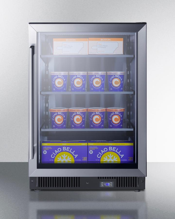 Summit's commercial series of undercounter freezers offers an attractive display for maximizing impulse sales and keeping products under reliable cold storage conditions. The SCF475 is a frost-free freezer with an easy-fitting 24" footprint and a front-breathing design ideal for built-in installation under counters. The stainless steel trimmed door features triple-pane tempered glass that is vacuum insulated with a low-e coating, helping to improve energy efficiency and ensure items are on full display. LED lighting in the side walls helps to provide attractive illumination. For increased security, the unit features a factory-installed lock in the kickplate. The digital thermostat is externally located for easy temperature management. The door is user-reversible to best suit your space, with a pro style handle included. Inside, the SCF475 features 5.14 cu.ft of storage space and stainless steel construction for improved durability and sanitation. A commercial-grade cantilevered shelving system allows flexible storage. Three perforated steel shelves are designed to hold up to heavy duty commercial use and ensure proper cold air circulation. This freezer includes a SuperFreeze setting, which is great for freezing newly loaded foods quickly. Additional features include an open door alarm, high-temperature alarm, and Sabbath mode setting that lets you disable some of the electrical elements during periods of observance. The SCF475 is ETL-S listed to NSF-7 for use in commercial settings. With its deluxe style, user-friendly features, and low maintenance frost-free operating system, this freezer offers premium value for bars, restaurants, hotel marketplaces, and other commercial environments. Create a matching set by pairing this with the SCR610BL, our 24" wide stainless steel beverage center.