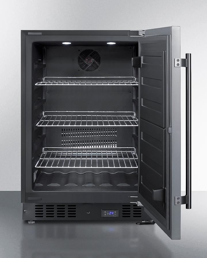 SUMMIT's SCFF53B Series brings quality and convenience under the counter with a fully featured lineup of built-in frost-free all-freezers. Sized with a convenient 24" footprint, the SCFF53BSS freezer can be used built-in or freestanding. It has a black cabinet with a sealed back for easy cleaning. The door comes with a European style fully articulating hinge on the stainless steel door, with a pro style handle and factory-installed lock included. Inside, the SCFF53BSS utilizes frost-free operation with fan-forced cooling to ensure low maintenance and even temperature distribution. Recessed LED lighting offers an attractive yet efficient look. The digital thermostat makes it easy to manage the interior temperature. This unit includes adjustable chrome shelves for flexible storage. Additional features include an open door alarm, high temperature alarm, and Sabbath mode setting that lets you disable some of the electrical elements during periods of observance. The SCFF53BSS freezer is ETL-S listed to NSF-7 commercial standards. With its deluxe style and user-friendly features, this unit is the perfect choice for home or commercial kitchens. For a matching frost-free all-refrigerator, see the FF64BSS.