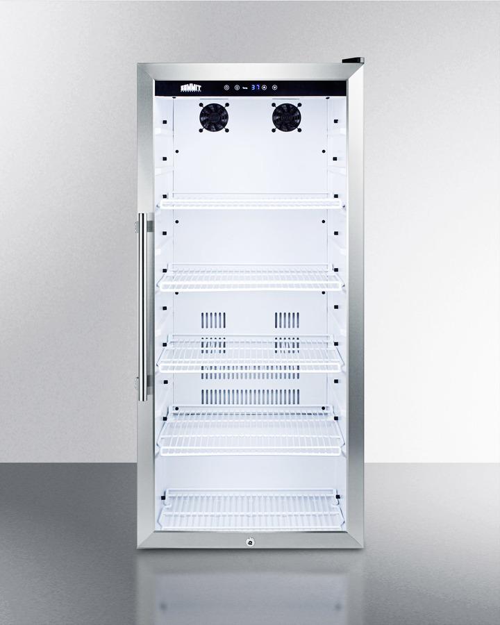 Summit Commercial offers a quality line of slim-fitting beverage merchandisers designed for long-lasting use in busy commercial settings. Sized with a unique 21 1/4" W x 22 1/2" D footprint, the SCR1006 offers a full 9 cu.ft. storage capacity with a full display from top to bottom. The user-reversible double pane tempered glass door includes a factory installed lock and attractive stainless steel trim. This unit has a finished white cabinet for freestanding use. Inside, the SCR1006 utilizes automatic defrost for easy maintenance, with fan-forced cooling that ensures the temperature is evenly distributed from top to bottom. A digital thermostat allows for precise temperature control and offers a readout in Celsius or Fahrenheit. Interior LED lighting keeps all items in view and includes an on/off button on the exterior control panel for added convenience. Five adjustable wire shelves allow users to store a variety of bottles and cans, with nine glide positions to adjust the size as needed. With its slim dimensions and user-friendly, features, the SCR1006 is a great choice for commercial establishments looking to maximize sales of stored beverages. This unit is ETL-S listed to NSF-7 commercial standards. NOTE: This unit replaces SCR1005.
