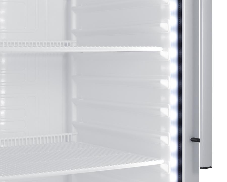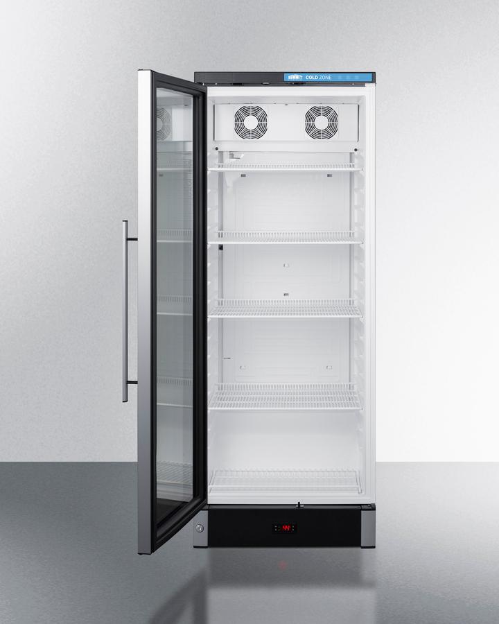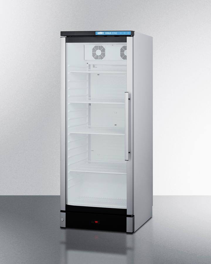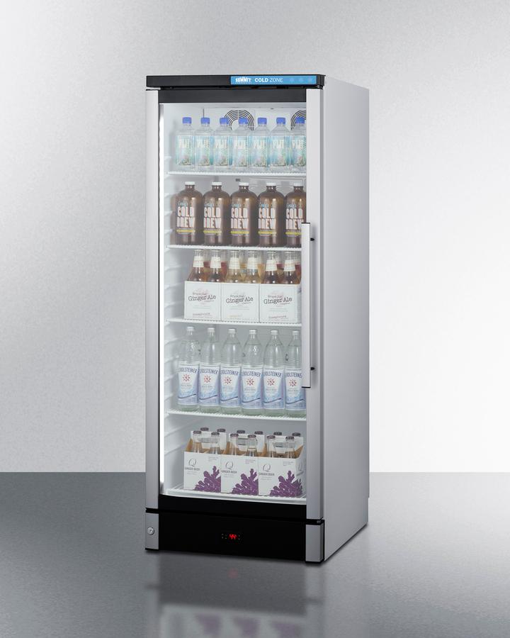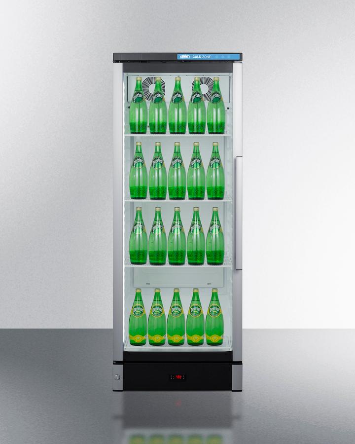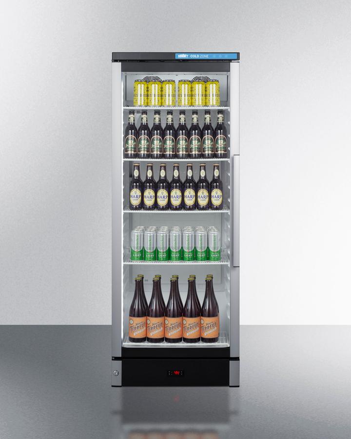 Summit Commercial manufactures a full selection of slim-fitting European beverage centers designed for durable service, convenient use, and attractive presentation. Made in Denmark, model SCR1154LHD is a 24" wide 9.9 cu.ft. upright beverage merchandiser sized with a space-saving 25.25" depth. The double pane tempered glass door includes built-in LED lighting to create an attractive and energy efficient presentation of stored items, helping to promote impulse buys. A factory-installed lock allows users to secure the door as needed. Digital controls ensure easy and intuitive operation. This unit ships with a left hand door swing. Inside, the SCR1154LHD features a bright white interior for full product visibility. Four adjustable wire shelves let you rearrange your storage to accommodate a variety of sizes. Each shelf has a generous 79 lb. storage tolerance. We include one additional shelf to raise items off the floor. The automatic defrost system with a cold wall interior helps to keep beverages cold and minimize user maintenance, while powerful fan-forced cooling helps to evenly distribute airflow and promote fast temperature recovery in busy commercial environments. The SCR1154LHD is ETL-S listed to NSF-7 commercial standards and utilizes environmentally-friendly hydrocarbon refrigerant to comply with CARB guidelines. For a slightly taller version of this unit, see the SCR1301LHD.