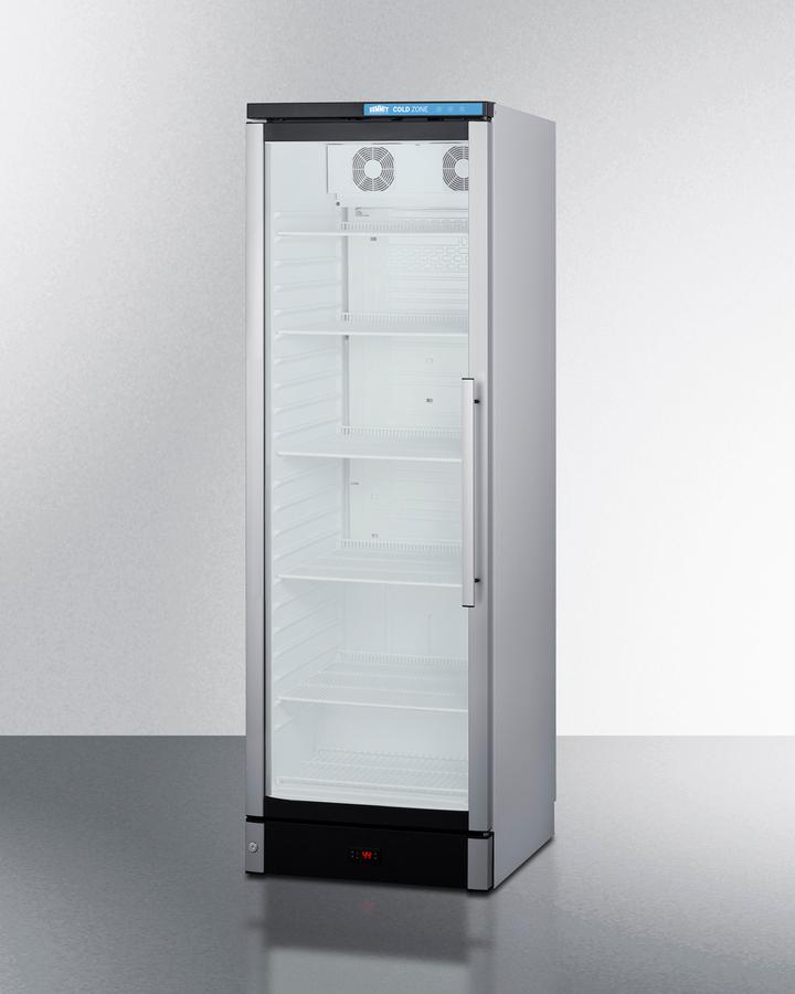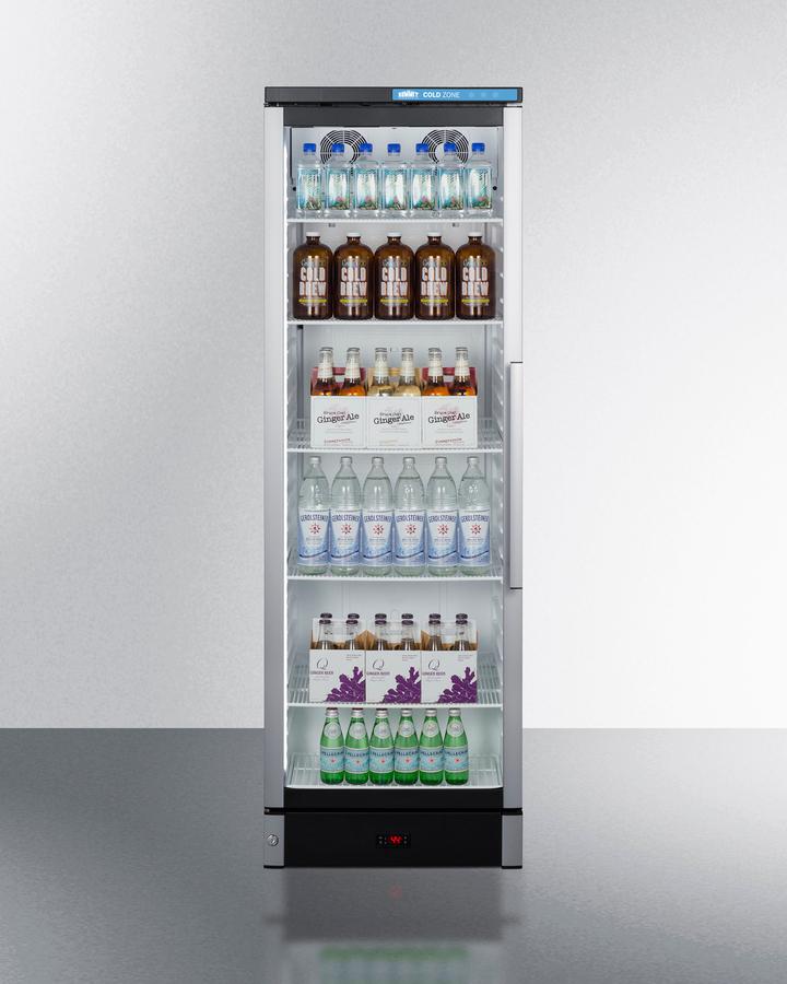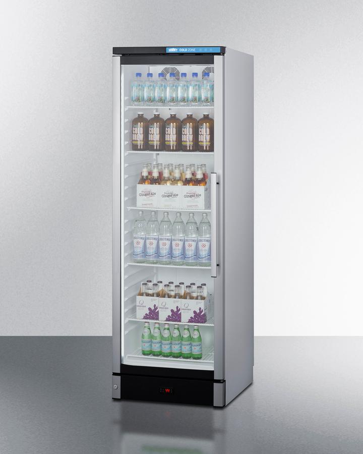 Summit Commercial manufactures a full selection of slim-fitting European beverage centers designed for durable service, convenient use, and attractive presentation. Made in Denmark, model SCR1301LHD is a 24" wide 12.4 cu.ft. upright beverage merchandiser sized with a space-saving 25 1/4" depth. The double pane tempered glass door includes built-in LED lighting to create an attractive and energy efficient presentation of stored items, helping to promote impulse buys. A factory-installed lock allows users to secure the door as needed. Digital controls ensure easy and intuitive operation. This unit ships with a left hand door swing. Inside, the SCR1301LHD features a bright white interior for full product visibility. Five adjustable wire shelves let you rearrange your storage to accommodate a variety of sizes. Each shelf has a generous 79 lb. storage tolerance. We include one additional shelf to raise items off the floor. The automatic defrost system with a cold wall interior helps to keep beverages cold and minimize user maintenance, while powerful fan-forced cooling helps to evenly distribute airflow and promote fast temperature recovery in busy commercial environments. The SCR1301LHD is ETL-S listed to NSF-7 commercial standards and utilizes environmentally-friendly hydrocarbon refrigerant to comply with CARB guidelines.