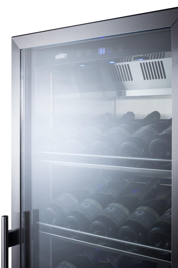 Summit Commercial offers a unique selection of wine cellars designed for optimum storage and bottle presentation. The SCR1401CH is an upright wine cellar built to meet NSF-7 commercial standards. The slim 24 inch footprint takes up minimum floor space, while the large 12.6 cu.ft. The self-closing stainless steel trimmed door includes a pro style handle and factory-installed lock for added security. This model comes with a right hand door swing. For a left hand version, see the SCR1401LHCH. This unit has a front-breathing cooling system that allows built-in installation, and a fully finished exterior that also enables freestanding use. Inside, the SC1401CH includes stainless steel shelving specially designed to hold champagne and sparkling wine bottles at a slight angle, providing a full display of the label. The interior walls and floor are constructed from stainless steel for lasting durability in busy commercial settings. This unit is illuminated through the rear walls with efficient LED lighting in a striking blue hue. The digital control panel offers a wide 36 to 68 F temperature range that allows you to program the optimum settings for red, white, or sparkling wine. Additional features include an audible high temperature alarm, open door alarm, temperature memory function, and sabbath mode setting. The SCR1401CH comes with a fully finished jet black cabinet. Additional choices are available in stainless steel, as well as alternate sizes. Browse our website to explore our full lineup of commercially approved wine cellars.