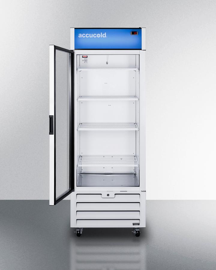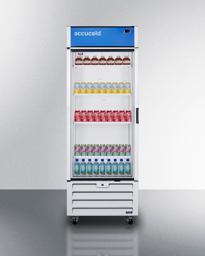 Made in North America, Accucold Commercial products offer the ideal display and storage conditions for foodservice settings, with a TAA compliant design and durable construction for busy commercial environments. Model SCRR261GLH is an upright all-refrigerator with a full 21.34 cu.ft. storage capacity. It comes in a clean white cabinet to suit any space, with a double pane tempered glass door to provide a full display of stored items. LED lighting inside the door panel helps to boost impulse sales, while the self-closing feature protects beverages by ensuring they're not accidentally left exposed to ambient room temperatures. This unit includes a factory-installed keyed lock for security as needed. Inside, the SCRR261GLH utilizes fan-forced cooling for fast temperature recovery and even cold air distribution. Adjustable cantilevered shelving makes it easy to accommodate any sized item. This model uses automatic defrost operation for easy user maintenance, with audible high/low temperature alarms to warn if the unit goes out of range. The SCRR261GLH is UL-S listed to NSF-7 commercial standards. Eco-friendly R290a refrigerant helps to ensure a greener footprint compliant with the latest CARB regulations. For a matching freezer with a right hand door swing, see the SCFF262GRH. In addition to this model, Accucold Commercial's North American line includes larger and smaller sizes to best fit your space. Explore the full selection or contact our product specialists for more information. Note: This unit ships with a left hand door swing. For the same model with a right hand swing, see the SCRR261G.