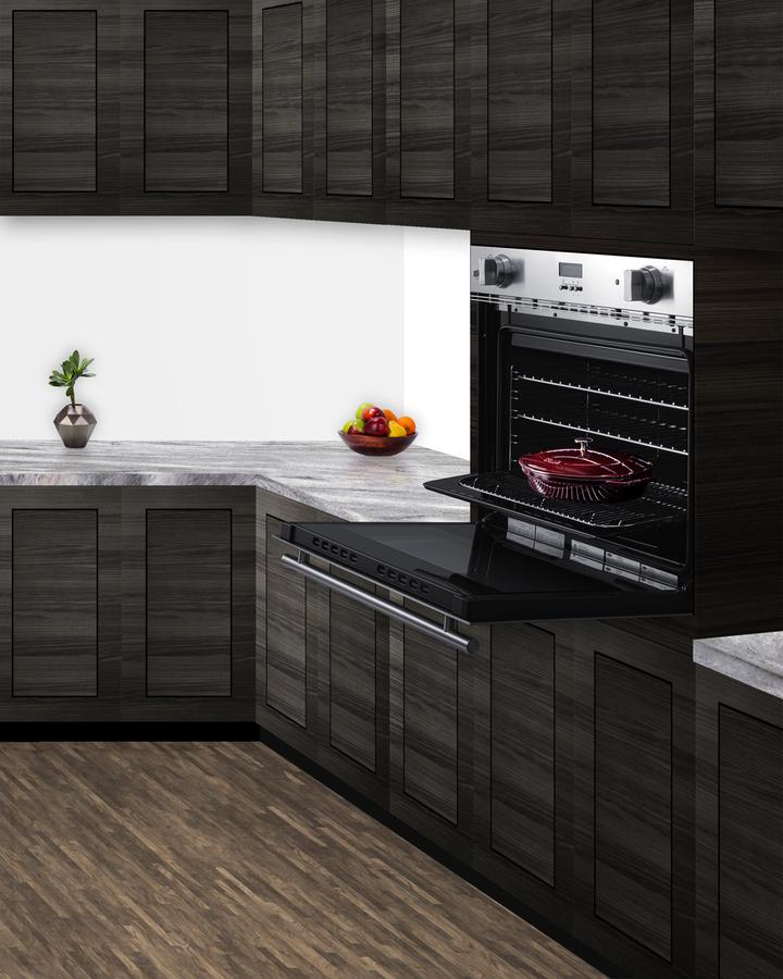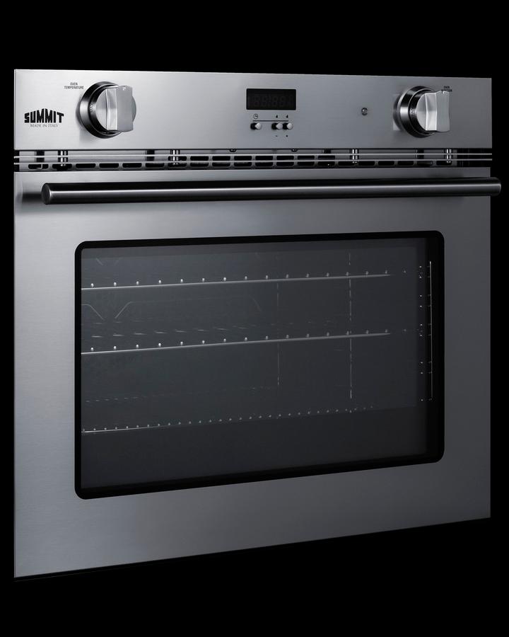 Summit's Made In Italy cooking lineup combines user-friendly function, elegant style, and lasting durability to create the ultimate luxury for home kitchens. Model SGWOGD27 is just over 27" wide, designed for installation in cabinets with a minimum cutout size of 23.125" H x 26.625" W x 24" deep. The exterior is fully constructed from stainless steel in a brushed horizontal grain, with a thick towel bar handle and modern oversized knobs to create a statement look. The extra large glass oven window and interior light ensure you have a full view inside the oven when cooking. The manifold includes a digital clock with a countdown timer for additional convenience. Inside, the SGWOGD27 features porcelain construction to hold up to everyday use. Three adjustable shelves can be positioned on five glides. We also include a broiler tray with a removeable metal grate. The powerful 12,000 BTU oven includes settings to bake and broil, with a convection fan that can be used with either function to ensure even heating on your dishes. The SGWOGD27 ships preset for natural gas but includes an LP conversion kit to adjust to propane connections. This unit utilizes spark ignition and features a pre-installed cord with a 3-prong plug. The regulator is included. With its versatile functions and stunning design, the SGWOGD27 brings European elegance to the home. Matching Italian gas cooktops are also available in 24", 27", 30", and 36" sizes. Browse the full Summit assortment to explore your options.