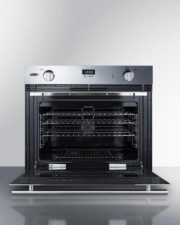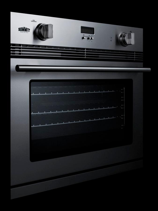 Summit's Made In Italy cooking lineup combines user-friendly function, elegant style, and lasting durability to create the ultimate luxury for home kitchens. Model SGWOGD30 is a 30" wide gas wall oven designed for installation in 26 5/8" H x 28" W x 24" D wall cutouts. The exterior is fully constructed from stainless steel in a brushed horizontal grain, with a thick towel bar handle and modern oversized knobs to create a statement look. The extra large glass oven window and interior light ensure you have a full view inside the oven when cooking. The manifold includes a digital clock with a countdown timer for additional convenience. Inside, the SGWOGD30 features porcelain construction to hold up to everyday use. Three adjustable shelves can be positioned on five glides. We also include a broiler tray with a removeable metal grate. The powerful 12,000 BTU oven includes settings to bake and broil, with a convection fan that can be used with either function to ensure even heating on your dishes. The SGWOGD30 ships preset for natural gas but includes an LP conversion kit to adjust to propane connections. This unit utilizes spark ignition and features a pre-installed cord with a 3-prong plug. The regulator is included. With its versatile functions and stunning design, the SGWOGD30 brings European elegance to the home. Matching Italian gas cooktops are also available in 24", 30", and 36" sizes. Browse the full Summit assortment to explore your options.