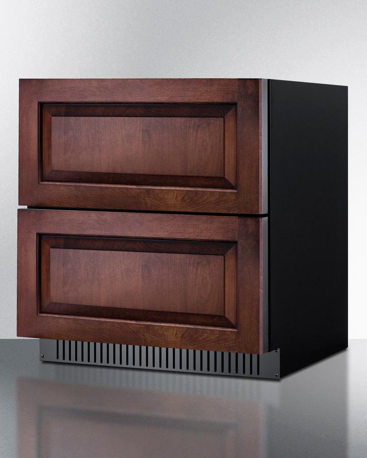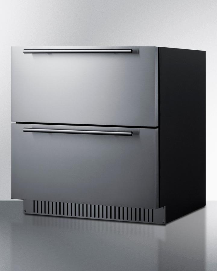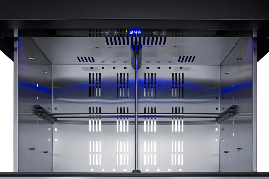Summit is expanding its popular lineup of built-in undercounter ADA compliant refrigeration with new luxury choices for 30" wide spaces in residential or commercial kitchen indoor and outdoor spaces. Model SPR3032DADA is a 30" wide 2-drawer all-refrigerator sized just under 32" high for an easy fit under lower ADA compliant counters. It comes in a shallow depth just under 24" for added space savings. Stainless steel drawer construction ensures lasting durability and a stunning look to suit any setting, with a set of pro style handles included. The fully finished drawer fronts can also accept overlay panels for a custom look to blend into your own cabinetry. The front-breathing design allows built-in installation, while the fully finished black cabinet also enables freestanding use. The sealed back and right angle plug help to ensure an easy fit. With a generous 5.42 cu.ft. interior capacity, the SPR3032DADA is perfect for keeping a variety of items in easy reach. Each drawer includes a removable divider that lets you create four adjustable sections inside to help organize the interior. The intuitive digital control panel features a wide range from 34 to 65 F, allowing you to adjust your storage conditions for standard food items or beverages better held at warmer temperature. The temperature display can be switched from Fahrenheit to Celsius for added convenience. Both drawers feature LED lighting in a striking blue finish for elegant illumination. Frost-free operation minimizes maintenance and internal fans help to maintain an evenly cooled interior. Additional features include open drawer alarms, a child lock to prevent changes to the controls, an eco mode setting, and a 96 hour sabbath mode to disable certain features for periods of observance. The SPR3032DADA features weatherproof construction for safe installation in outdoor kitchens. It is ETL-S listed to NSF-7 commercial standards and also complies with residential regulations for home use. In addition to this refrigerator, we also manufacture the same style in a 27" fit. Browse Summit's extensive selection of built-in undercounter refrigeration to discover the perfect fit for virtually any kitchen space.