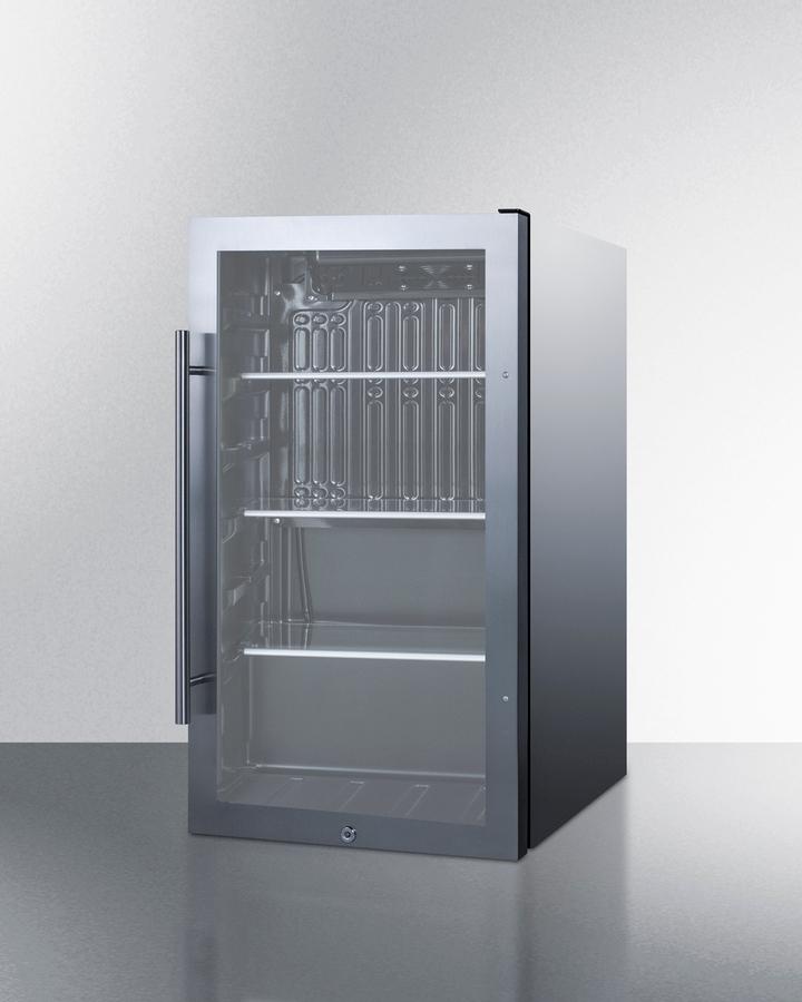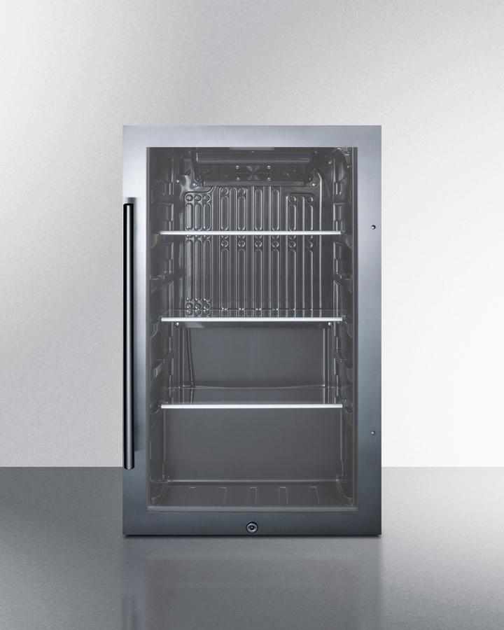Summit's line of outdoor appliances includes slim-fitting display beverage centers designed for optimum storage and product presentation. The SPR488BOSCSS features a versatile design that meets NSF-7 and UL-471 commercial standards, but is also approved for residential use. Sized at just 19 inches wide and 17 inches deep, it features a stainless steel cabinet with a sealed back for safe installation in the outdoors. The user-reversible double pane tempered glass door includes a seamless stainless steel trim and a pro-style handle. A factory-installed lock offers added security, while the space-saving right-angle plug and integrated hinge provide added flexibility in unit placement. Two leveling legs keep the unit level on uneven surfaces. Inside, the SPR488BOSCSS utilizes an internal fan to ensure the interior is evenly cooled from top to bottom, while the automatic defrost system allows for minimal user maintenance. LED lighting allows full visibility of stored items in the jet black interior. Three adjustable glass shelves with six positions provide optimal storage capacity inside the 3.1 cu. ft. interior. The dial thermostat, with seven temperature settings, is located in the upper-right corner for easy temperature management. The SPR488BOSCSS can be installed indoors or outdoors and is designed for built-in or freestanding use. For this unit with a panel-ready door, see the SPR488BOSCSSPNR.