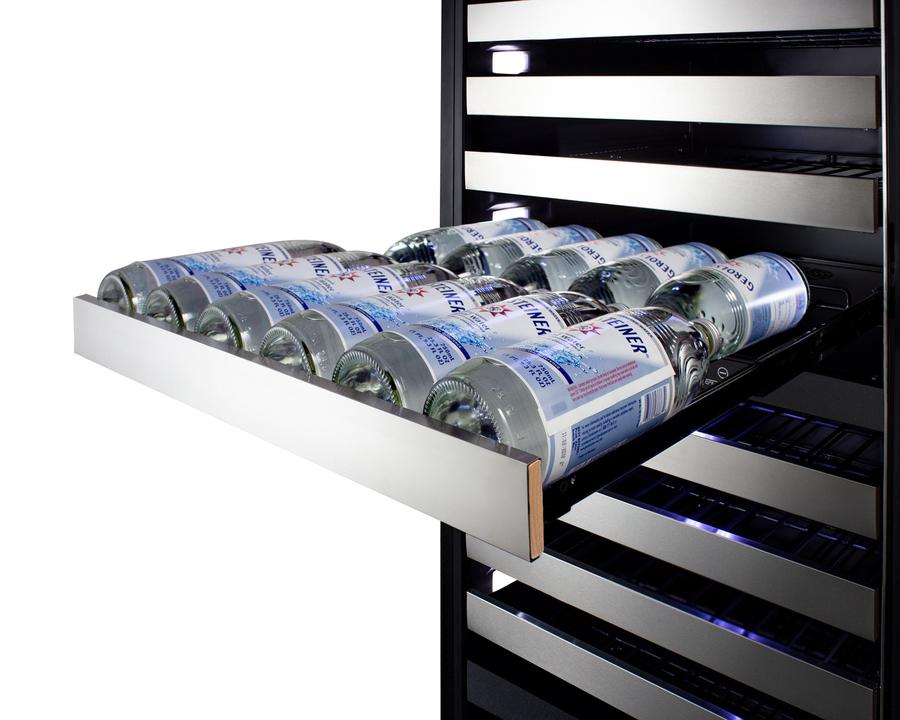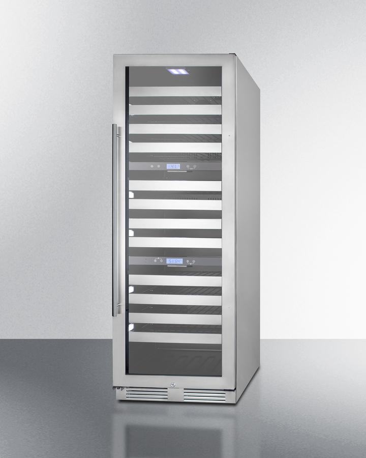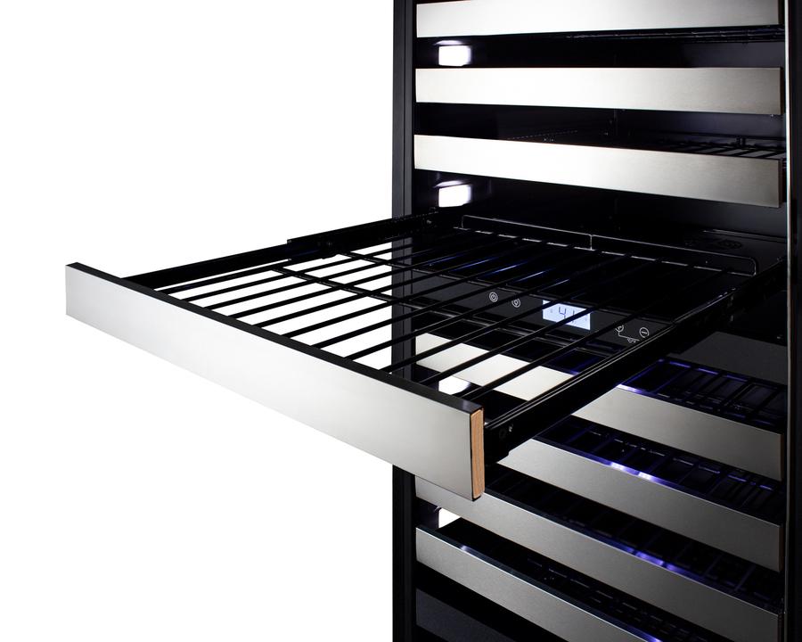 Summit offers a unique selection of built-in capable full-sized wine cellars with a versatile luxury design ideal for residential or commercial use. The SWCP1988TCSS is a 24" wide triple zone wine cellar that is ETL-S listed to NSF-7 commercial standards. It features a front-breathing design for built-in installation, with a fully finished stainless steel cabinet that also allows freestanding use. Sized just under 27" deep, this unit has a sealed back and right angle plug for added depth savings. The luxury exterior features a double pane tempered glass door with a seamless stainless steel trim. A stainless steel kickplate provides added elegance, while the pro-style handle completes the look. This unit includes a factory-installed keyed lock for added security and powerful magnetic gaskets to ensure a proper seal in high-traffic commercial settings. Three temperature zones allow you to accommodate red, white, or sparkling wine, as well as non-alcoholic bottled beverages. The upper zone temperature can be set between 41 and 65(degree)F for versatile storage, with more space on the top shelf to accommodate champagne bottles. A rubber sealing strip prevents air in the upper zone from affecting the air temperature in lower compartments. The middle zone can operate between 41 and 54(degree)F, while the lower zone is best suited for preserving red wine with a range of 54-65(degree)F. Two separate cooling systems (one for the upper zone and one for the middle and lower zones) ensure proper cooling. Inside, the SWCP1988TCSS includes 12 full-extension black wire shelves, four in each zone, positioned on ball bearing glides for smooth loading. Stainless steel fronts offer a modern touch. Optimal storage capacity accommodates up to 149 standard 750ml Bordeaux bottles (note: your capacity may vary depending on the bottle style). For wider Burgundy style bottles (typically used for Pinot Noir and Chardonnay), the SWCP1988T can hold up to 102 bottles. 13 white LED lights are positioned on the sides and top of the unit to attractively illuminate your collection for a stylish display. A charcoal filtration system keeps the interior odor-free. Additional features include an open door alarm and high/low temperature alarm that sound if the unit temperature goes out of range. With its convenient size, advanced features, and luxury design, the SWCP1988TCSS is perfect for restaurants, bars, wineries, and homes seeking full capacity wine storage with a modern presentation.