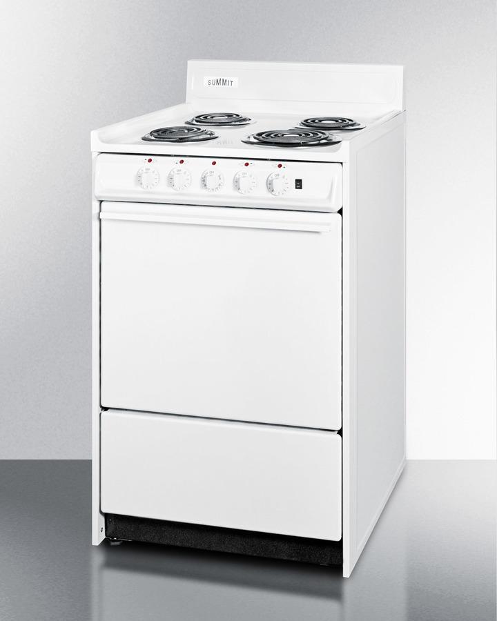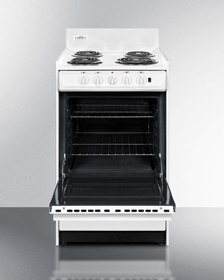 Summit Appliance offers a wide selection of American-made household ranges built for long-lasting durability in space-challenged kitchens. The WEM1171Q is an apartment-sized 220V electric range featured to meet ADA guidelines and ideal for use in senior living facilities, HUD applications, and other types of community living with added safety needs. It includes a pre-installed 3-prong line cord, as well as individual indicator lights for each cooking element and an interior oven light with an exterior on/off rocker switch. Sized at just 20" wide, it has a full-sized 2.46 cu.ft oven interior that can accommodate large trays. Two adjustable oven racks are included. The waist-high broiler is located inside the oven, allowing you to switch functions without moving contents to a separate compartment on the floor. The lower drop-down storage compartment is ideal for keeping pots and pans out of the way in small kitchens. Designed to meet the most current UL safety standards, this unit features one 8" 950W and three 6" 650W coil elements. These operate at lower wattage than standard electric ranges, allowing for a slow but steady heating process that will not cycle off. Upfront push-to-turn knobs offer additional protection, ensuring users won't reach over hot burners to adjust the heat. This unit complies with ADA guidelines. The WEM1171Q comes in a classic white finish to suit any kitchen setting. It has a recessed oven door and is conveniently sized at just 24" deep for a better fit in galley in L-shaped kitchens, where every inch counts. Porcelain and steel construction help the unit hold up to years of daily use. We include an anti-tip bracket for added safety. With its classic style and quality construction, Summit's made in the USA cooking line offers reliable cooking for smaller homes. Additional choices are available in 24", 30", and 36" wide fits.