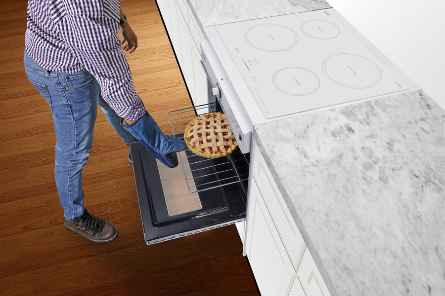 Enjoy the ease, speed, safety, and efficiency of induction cooking with Summit Appliance's new series of 24" wide induction ranges, made in the USA. Model WEM665W brings precise and efficient cooking to smaller kitchen spaces with a 24" footprint. The cooking surface features four induction zones, while the large electric oven offers nearly 3 cu.ft. of cooking space for baking and broiling. This unit comes in a classic white finish and no rear backguard for a slide-in look. It has a recessed oven door and is conveniently sized at just 24" deep for a better fit in galley in L-shaped kitchens, where every inch counts. A towel bar handle in brushed stainless steel provides an added touch of style to the oven door. This range requires professional installation with a standard 40 amp 3 or 4-prong cord. Unlike radiant heating, induction technology utilizes magnetized energy that starts inside the cookware, meaning the temperature of the actual cooktop surface does not get nearly as hot as traditional gas or electric elements. Most of the heat is retained inside your cookware, making induction technology the most efficient heating method for your kitchen. The surface is constructed from smooth EuroKera white glass to create a modern, easy-to-clean surface. The front left and rear right elements are sized at 8 1/4", ideal for boiling large pots of water or cooking with woks and other large cookware. The smart burner layout helps provide plenty of room so that larger cooking vessels are spaced apart, making it easier to use all four elements without cookware colliding. Touch controls allow intuitive operation. The digital display shows which elements are in use and their power setting. Audible beeps sound when the touch controls are activated. A timer function lets you program a power level and cook time (up to 99 minutes) that can either turn the unit off when complete, or serve as a visual countdown with an audible alert when the set time has been reached. Safety features include automatic shutdown, child lock, overheat protection, and overflow protection, which will temporarily disable the power if boiling liquid touches the control panel. This model's oven includes an interior light and window to keep your cooking in view. Two adjustable racks make it easy to accommodate a variety of sizes. The waist-high broiler is located inside the oven, allowing you to switch functions without moving contents to a separate compartment on the floor. Under the oven is a lower drop-down compartment ideal for storing cookware. Summit's American-made induction ranges are ADA compliant, with the cooktop controls located upfront and the oven knob centered on the front manifold for easy and accessible use. With its slim fit and safety-conscious design, this series is perfect for apartments, senior living, ADUs, and other kitchens with smaller footprints. Additional choices are available in stainless steel (TEM665BW) and jet black (TEM665CW), as well as traditional coil and radiant stoves in this size. Browse the full Summit collection for more choices.