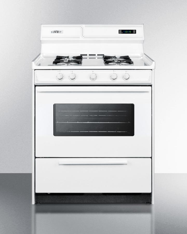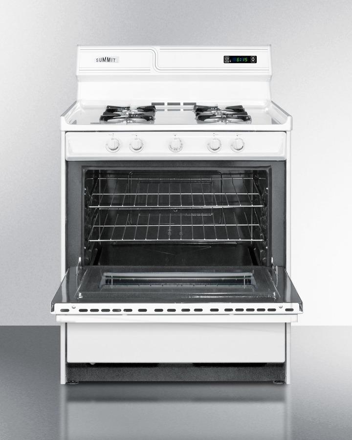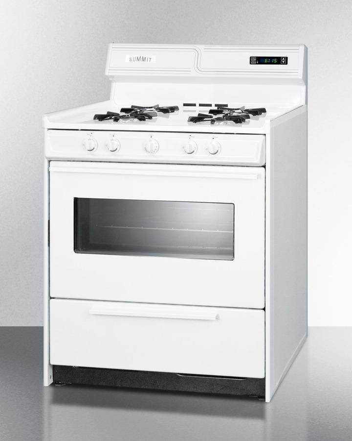 Summit Appliance offers a wide selection of American-made household ranges built for long-lasting durability in space-challenged kitchens. The WNM2307KW is a gas range sized at 30" wide, with a generous 3.7 cu.ft oven interior that can accommodate large trays. Two adjustable oven racks are included. An oven window and on/off interior light allow you to easily keep watch over your cooking. The broiler is located below the oven in a drop-down compartment. Four open 9000 BTU gas burners accommodate most of your stovetop heating needs, with upfront push-to-turn knobs that let you adjust your cooking without reaching over hot burners. This unit utilizes an electronic ignition system for added safety. The WNM2307KW comes in a classic white finish, with a high backguard that includes a digital clock and timer. This unit has a recessed oven door and is conveniently sized at just 24" deep for a better fit in galley in L-shaped kitchens, where every inch counts. Constructed from porcelain and steel, the WNM2307KW offers lasting durability. We include an anti-tip bracket for added safety. With its classic style and quality construction, Summit's made in the USA cooking line offers reliable cooking for smaller homes. Additional choices are available in 20", 24", and 36" wide fits. This unit ships ready for natural gas connections. To use with propane, add the Kit LP.