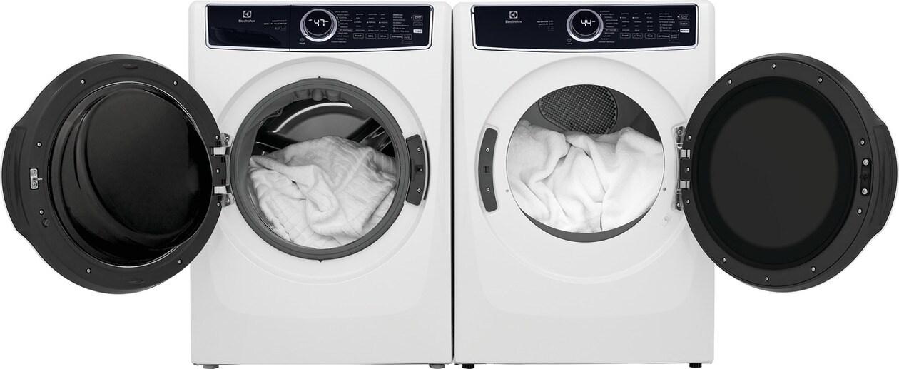 The Electrolux ELFW7637AW is a 4.5 Cu. Ft. Front Load Washer designed to provide efficient and effective cleaning performance. Its innovative SmartBoost® technology premixes water and detergent before the cycle begins, maximizing the cleaning power and ensuring thorough stain removal. The washer offers an Optic Whites™ cycle that prevents the redeposit of dirt and residues, keeping white fabrics whiter than the normal cycle with bleach. The Pure Rinse™ option removes detergent residues and fragrances that can irritate sensitive skin, rinsing cleaner than the extra rinse option without using more water. For those in need of quick cleaning, the 15-Minute Fast Wash cycle deep cleans the items you need most in a short time. The LuxCare® Plus Wash System provides a thorough clean with even distribution of detergent and additives, improved wash actions, temperature control, and smart load sensing. Additionally, the StainSoak™ option starts by premixing water, detergent, and stain remover before the cycle begins to create a powerful yet gentle cleaning solution, optimizing the temperature, tumbling actions, and time based on the selected stain for optimal results.