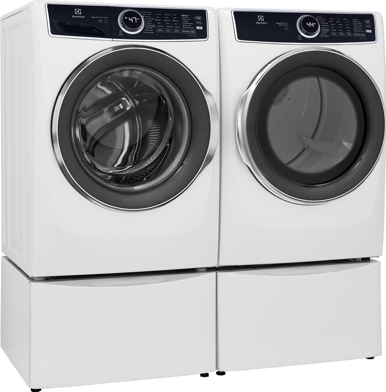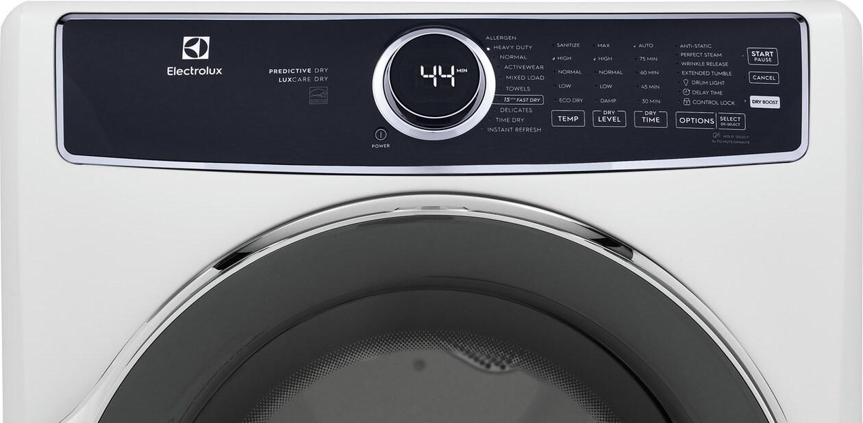 The Electrolux ELFE7537AW is an 8.0 Cu. Ft. Front Load Electric Dryer designed to provide efficient and precise drying performance. The LuxCare® Dry System utilizes an advanced moisture sensor to detect humidity on the surface and inside items, ensuring all fabrics are treated with precision and care. The Instant Refresh cycle allows you to remove wrinkles and refresh clothing in just 10 minutes, saving time and energy. For those in a hurry, the 15-Minute Fast Dry cycle quickly dries the items you need most. The dryer also features a Perfect Steam™ option that gently releases wrinkles and reduces static to keep clothes looking their best. With a spacious 8.0 cu. ft. capacity, it accommodates large loads, making it ideal for families. The reversible door offers flexible installation options, and the stackable design allows for space-saving configurations.
