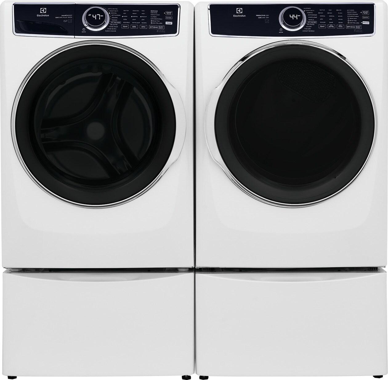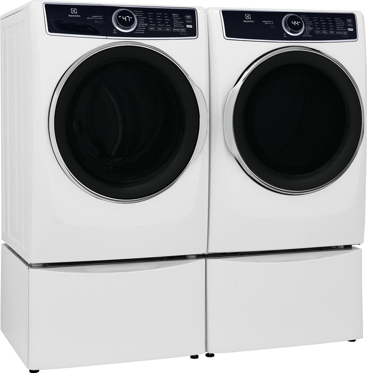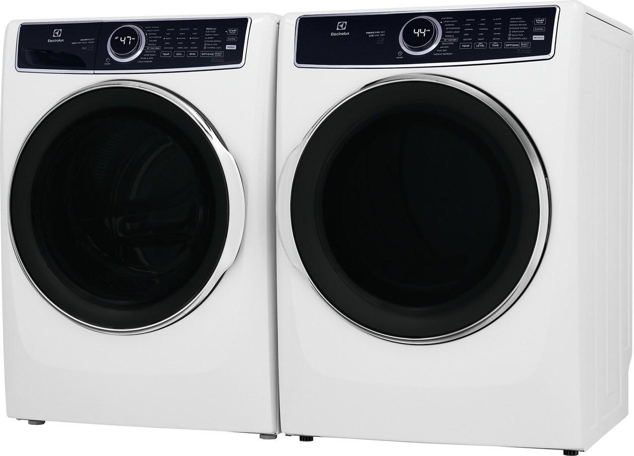 The Electrolux ELFG7637AW is an 8.0 Cu. Ft. Front Load Gas Dryer designed to provide efficient and precise drying performance. The LuxCare® Dry System utilizes advanced moisture sensors to detect humidity on the surface and inside items, ensuring all fabrics are treated with precision and care. The Instant Refresh cycle allows you to remove wrinkles and refresh clothing in just 10 minutes, saving time and energy. For those in a hurry, the 15-Minute Fast Dry cycle quickly dries the items you need most. The dryer also features a Perfect Steam™ option that gently releases wrinkles and reduces static to keep clothes looking their best. With a spacious 8.0 cu. ft. capacity, it accommodates large loads, making it ideal for families. The reversible door offers flexible installation options, and the stackable design allows for space-saving configurations.