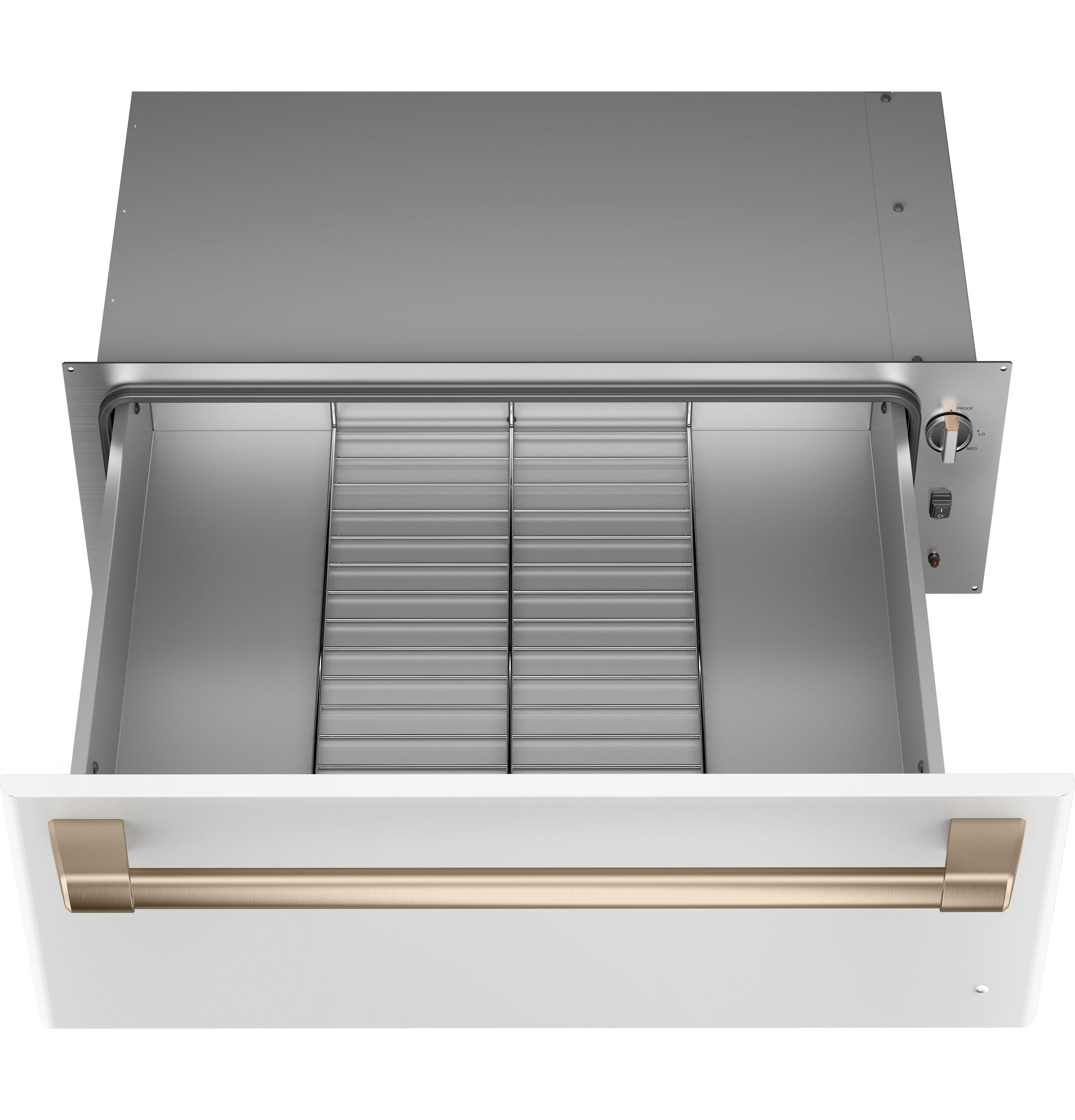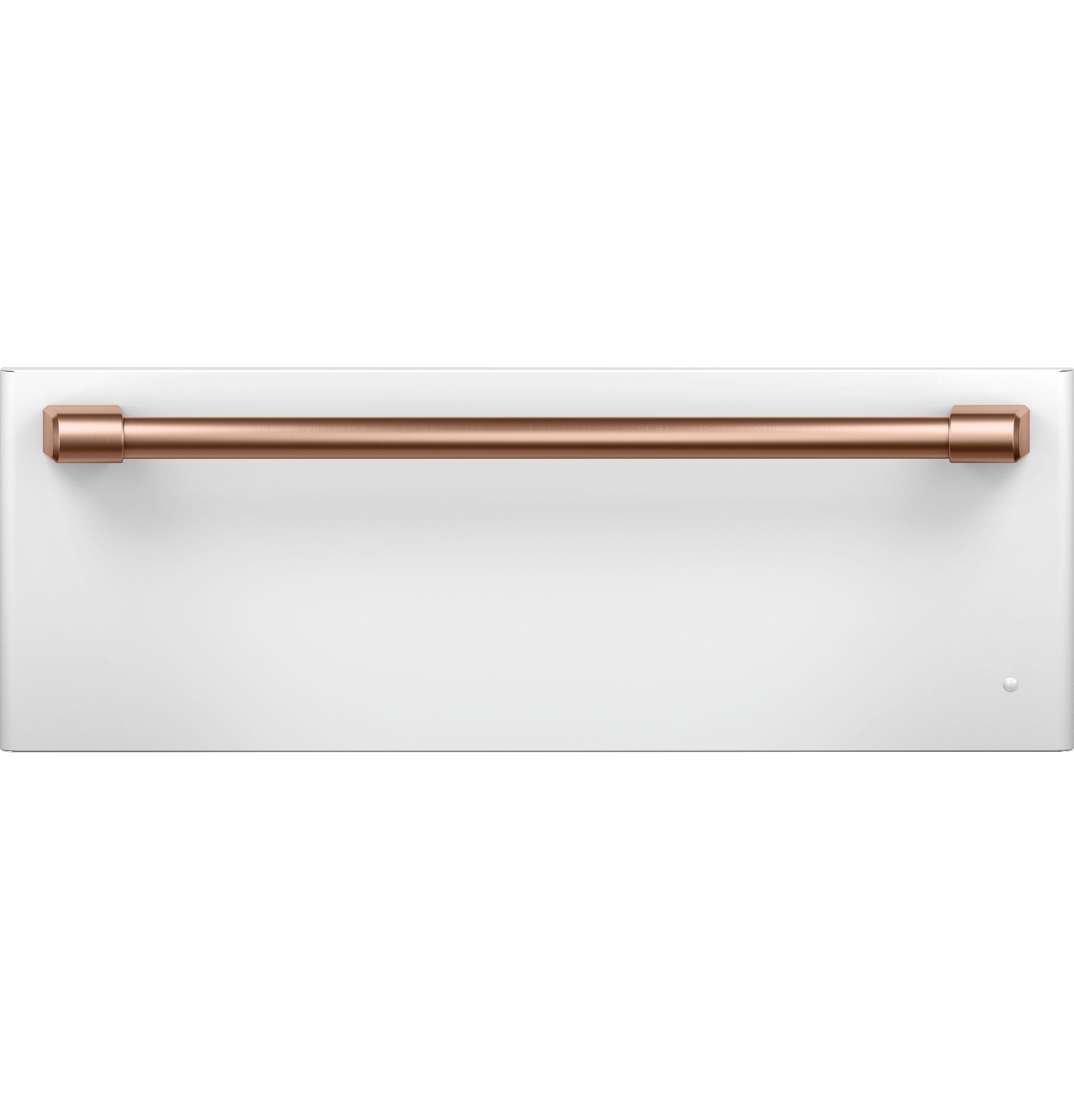 Elevate your kitchen's functionality and style with the Café™ 30" Warming Drawer. Designed to maintain the ideal temperature and texture of your culinary creations, this warming drawer features variable degree control ranging from 80°F to 210°F, allowing you to keep dishes warm or heat them up as needed. The variable humidity control ensures that your food retains its intended consistency, from crispy to tender. Its sleek, frameless front in Matte White with a Brushed Bronze Handle adds a touch of elegance to any kitchen decor. An indicator light clearly shows when the drawer is in operation, and the included half rack maximizes space, enabling you to warm multiple items simultaneously.