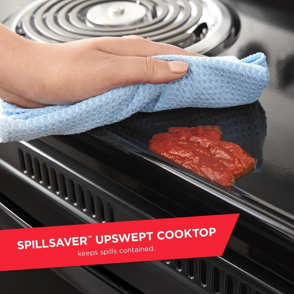 This Amana(R) electric range makes delicious meals, without difficult clean-up. Splatters won't matter with the Easy-Clean Glass Door that helps messes wipe away easily. The versatile cooktop features the SpillSaver UpSwept(TM) Cooktop, so you can go ahead and spill the beans, and the large oven capacity means there is room for dinner and dessert to cook at the same time.