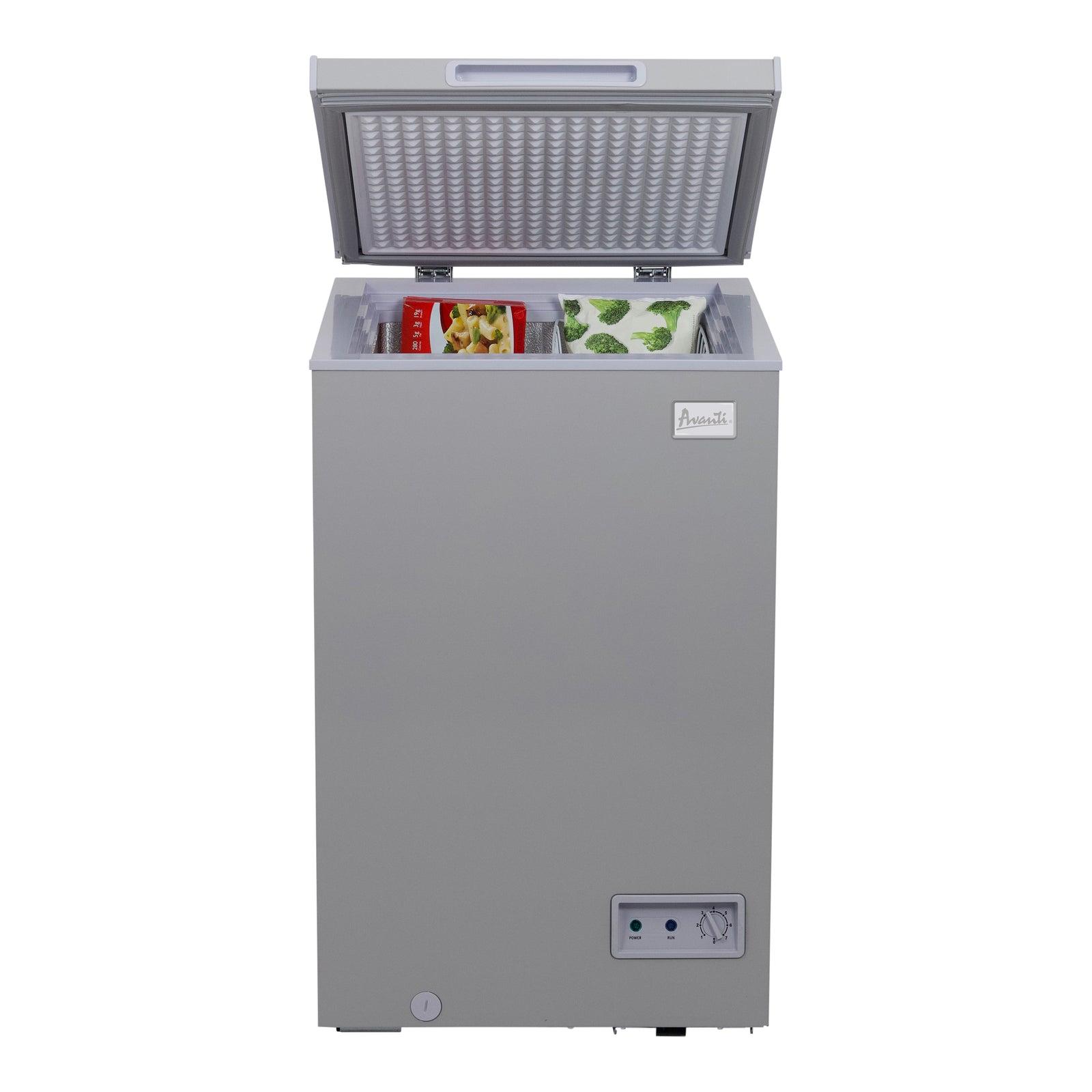 Stock up and store more of your favorite frozen foods while saving time and money with the 3.5 cubic feet deep freezer from Avanti. The garage ready chest freezer can handle hot or cold temperatures while maintaining an optimal temperature inside. The lift-up lid features an integrated handle for easy access and a streamlined look. This model features a convenient, removable storage basket so you can organize and easily find your frozen foods. The power indicator light lets you know at a glance that your freezer is keeping your items frozen. The external temperature control lets you adjust the temperature without opening the lid. Manual defrost keeps your frozen food fresher and maintains a more consistent freezing temperature, while the defrost water drain conveniently removes water during defrosting. Covered by the Avanti One-Year Limited Warranty.