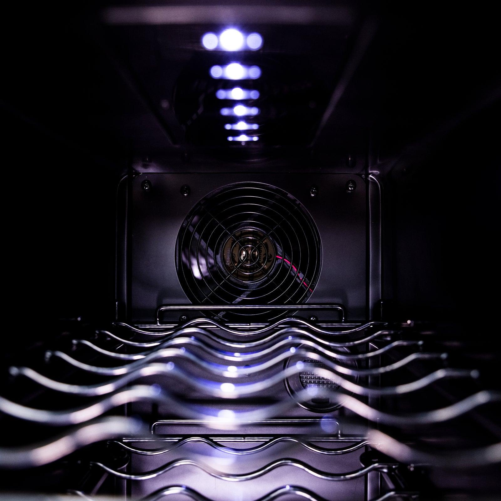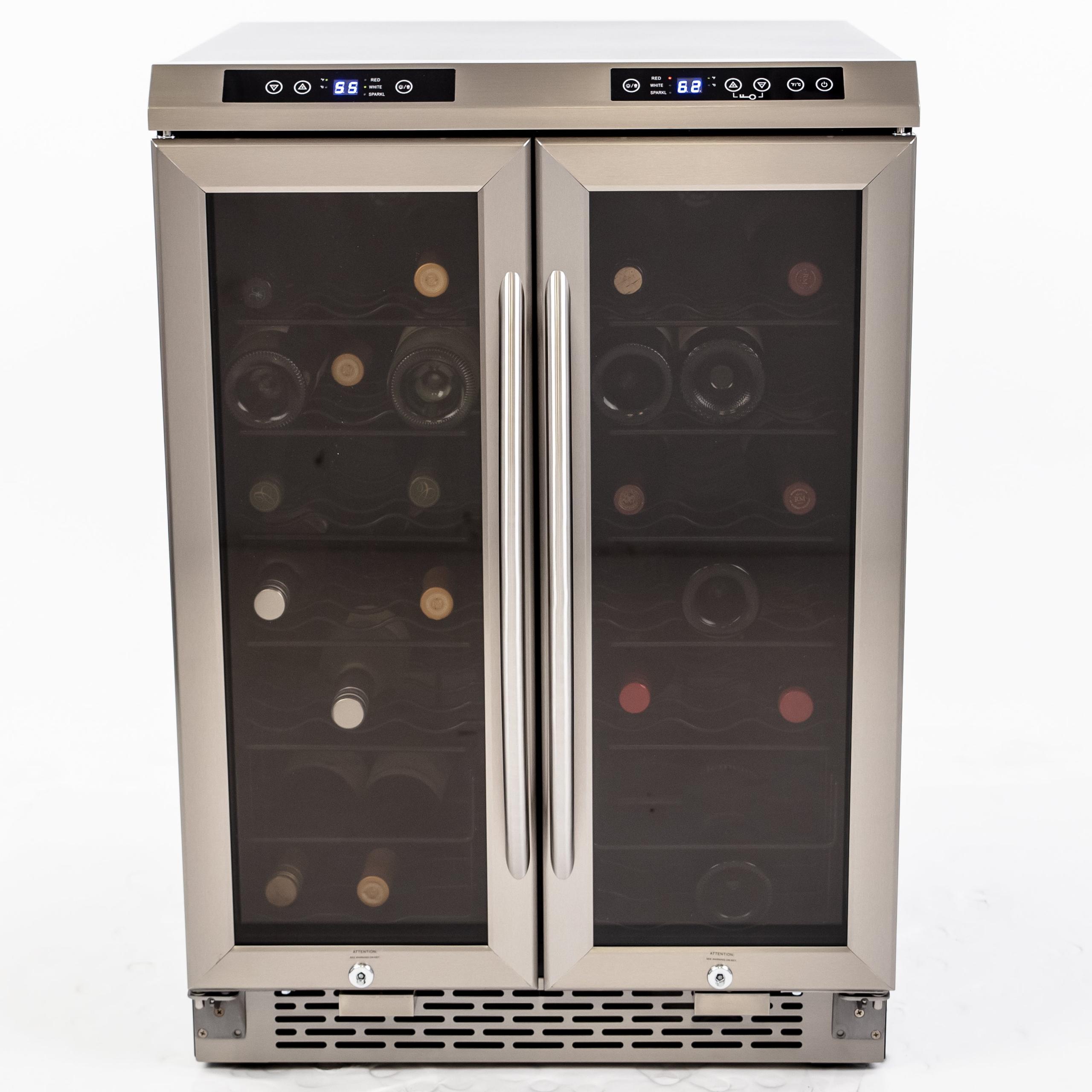 Keep wine perfectly chilled in the dual-zone, 38-bottle capacity (19 bottles in each zone) wine from Avanti. This wine fridge is ideal for the office, man cave, she-shed, bar, basement, or anywhere you want to store your wine collection. Easily view your wine choices through the French glass doors. Use slide-out shelving to arrange bottles for easy access. This compact wine cooler features automatic defrost so your wine stays perfectly chilled. Select the right settings for each zone at the touch of a button and monitor the temperature (C(degree)/F(degree)) with the temperature monitoring display, with a long life & cool led interior display lighting with on/off switch for each zone.