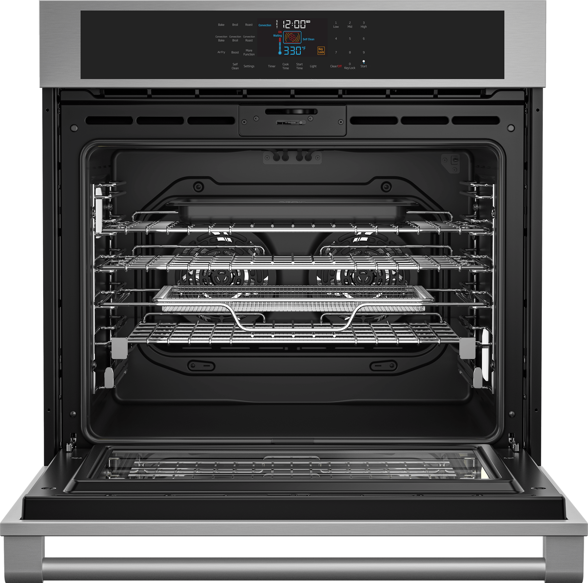 Elevate your culinary experience with the Beko WOS30200SS, a 30-inch built-in single electric wall oven that seamlessly blends professional-grade performance with sleek design. The oven boasts a generous 5.7 cu. ft. capacity, providing ample space to prepare large meals or multiple dishes simultaneously. Equipped with Twin Turbo Convection technology, it utilizes two convection fans that blow in different directions, ensuring even heat distribution and reducing cooking times by up to 25%. The innovative AirFry function allows you to achieve crispy, delicious results without the need for additional oil, promoting healthier eating habits. For added convenience, the oven features a programmable self-cleaning function, saving time and effort in maintenance. The LED control display offers intuitive operation, clearly displaying settings, temperature, and cooking times. A built-in meat probe ensures your meats are cooked to perfection, providing precise temperature readings. With its stainless steel finish, the Beko WOS30200SS adds a touch of elegance to any kitchen, making it an excellent addition for both novice cooks and seasoned chefs.