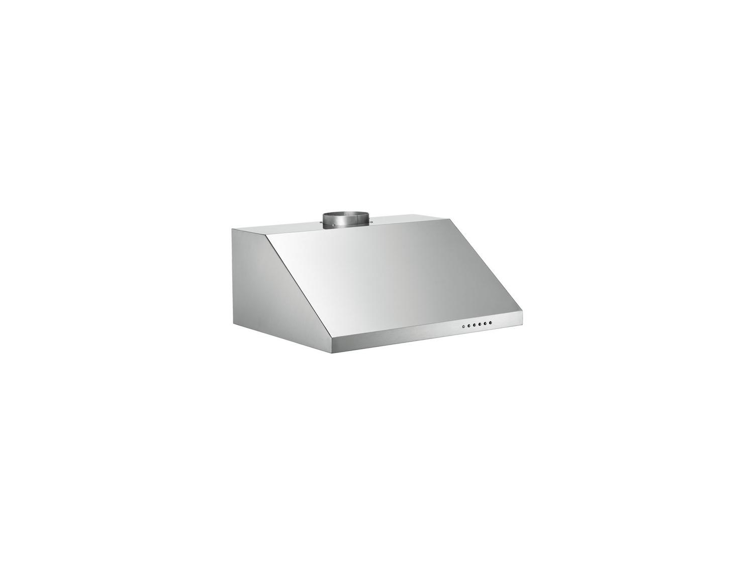 Powered by a 600 CFM motor with three power settings, this stainless steel canopy hood comes with aluminum mesh filters or optional baffle filters, all easily removable and dishwasher safe. It can be installed under a cabinet, or on the wall using a choice of duct cover accessories provided in multiple widths and heights to fit most ceiling heights. It can be vented out or recirculated.