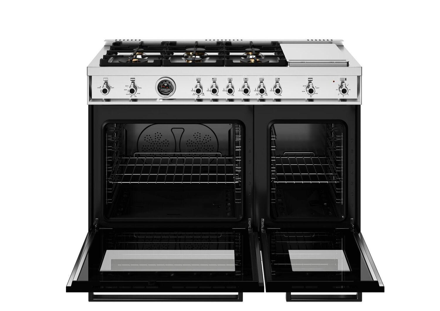 The Bertazzoni PRO486BTFGMNET Professional Series 48-inch dual fuel range offers exceptional versatility with a powerful six-burner gas cooktop and a built-in stainless steel griddle. The dual-ring high-output burner delivers rapid boiling and searing, while the simmer burners provide gentle, consistent heat for delicate sauces and slow cooking. The continuous cast-iron grates allow for seamless movement of pots and pans across the cooktop.