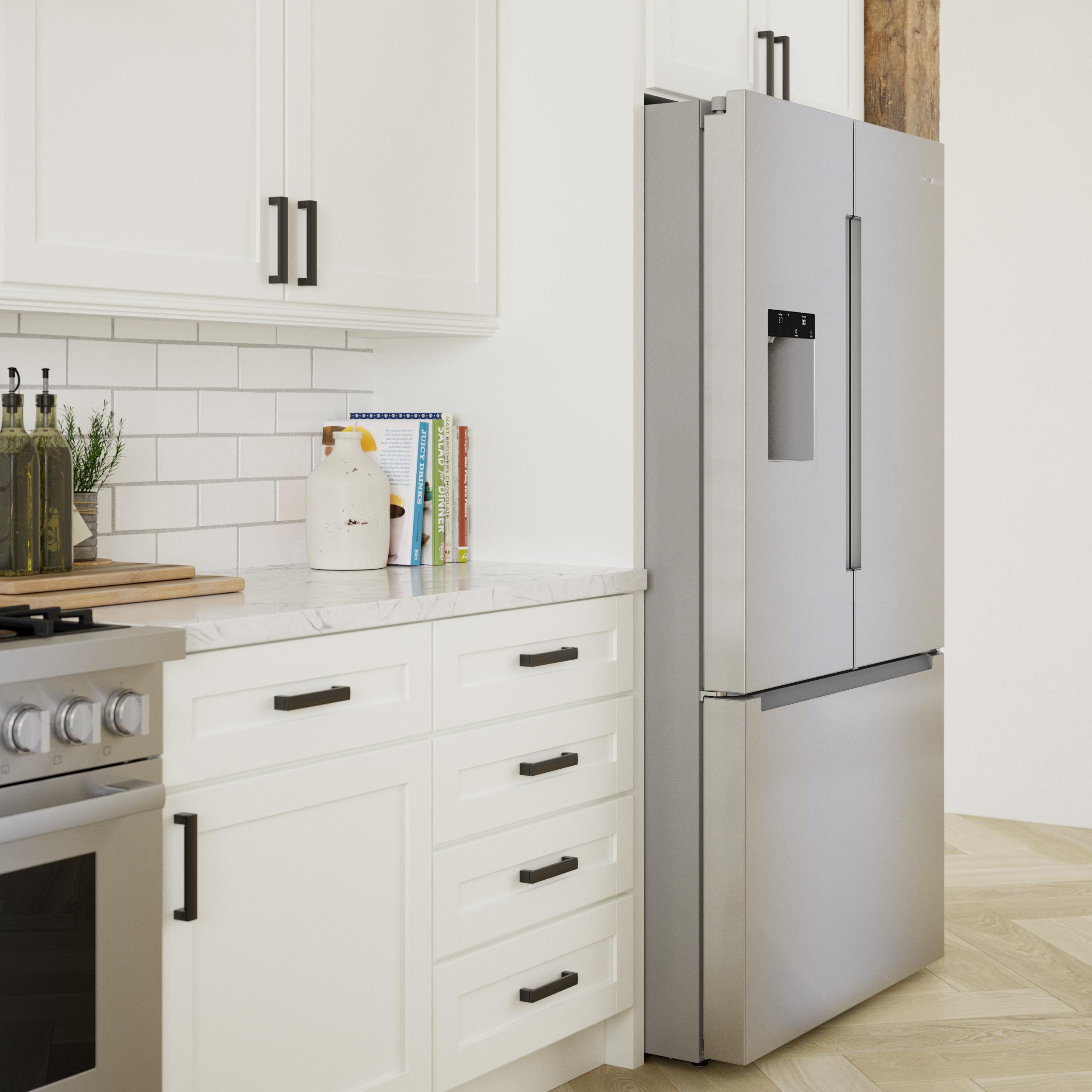 The Bosch B36FD10ENS refrigerator combines style and functionality with its anti-fingerprint stainless steel finish and recessed handles, ensuring a sleek appearance that resists smudges. Its QuickIce Pro System™ is among the fastest in its class, producing up to 8 lbs. of freshly filtered ice per day, ensuring you always have ice on hand. The UltraClarityPro® Water Filter removes over 99.9% of sediments, including harsh elements like chlorine and chloramine, providing clean and crisp water. The Bottle Fill feature allows for hands-free filling of your favorite glass or bottle, adding convenience to your daily routine. Inside, the MultiAirFlow™ system maintains consistent temperatures by evenly circulating cool air, preserving your food's freshness. The refrigerator is also equipped with Home Connect™, enabling remote monitoring and control via your smartphone or tablet for ultimate convenience. With ENERGY STAR® qualification, this refrigerator ensures energy-efficient operation, aligning with sustainable living practices.