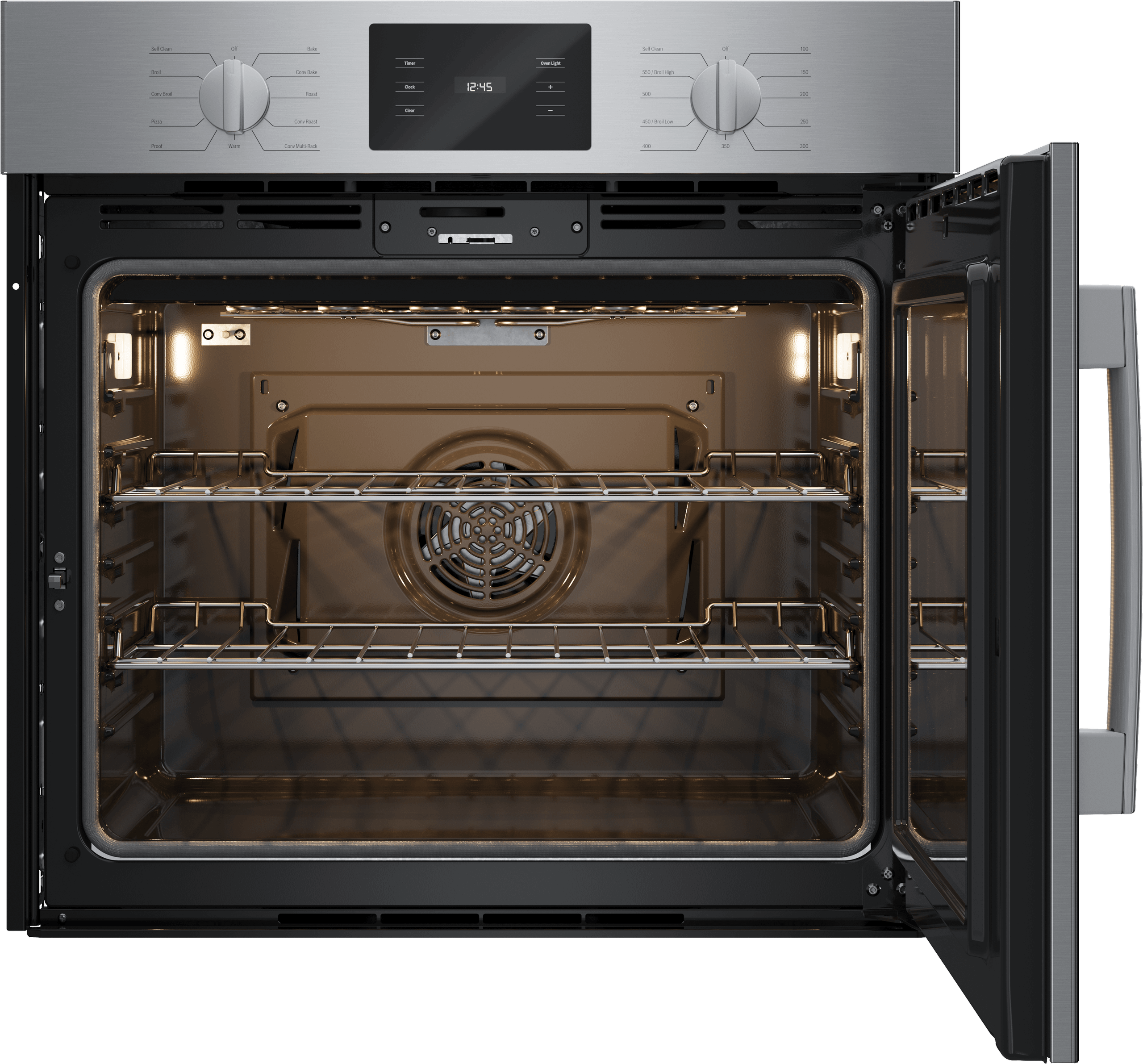 The Bosch 500 Series wall oven features an ergonomic Right SideOpening door, and heavy metal stainless steel knobs for a professional look. It's an All-in-One Oven that combines all your favorite appliances into one for less countertop clutter. It's a Broiler, Pizza Oven, Dough Proofer, Convection Oven, Roaster and more.
