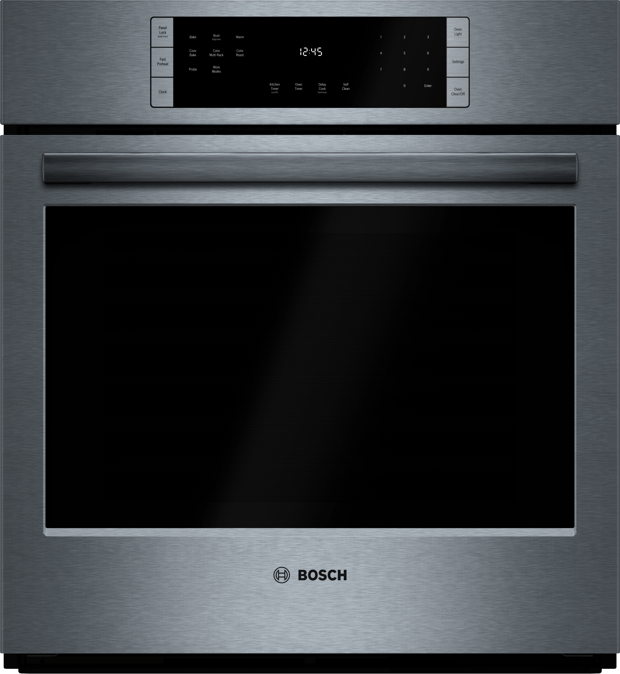 The Bosch 800 Series 27" Single Electric Wall Oven offers a spacious 4.1 cubic foot capacity, accommodating large meals with ease. Its Genuine European Convection system ensures even heat distribution for consistent baking and roasting results. The oven is equipped with a full-extension telescopic rack, providing safe and convenient access to dishes. The EcoClean™ self-cleaning feature utilizes a two-hour cycle to efficiently remove grime, reducing the need for manual cleaning. An intuitive touch control panel allows for easy operation, while the Fast Preheat function minimizes waiting time, enabling you to start cooking sooner.