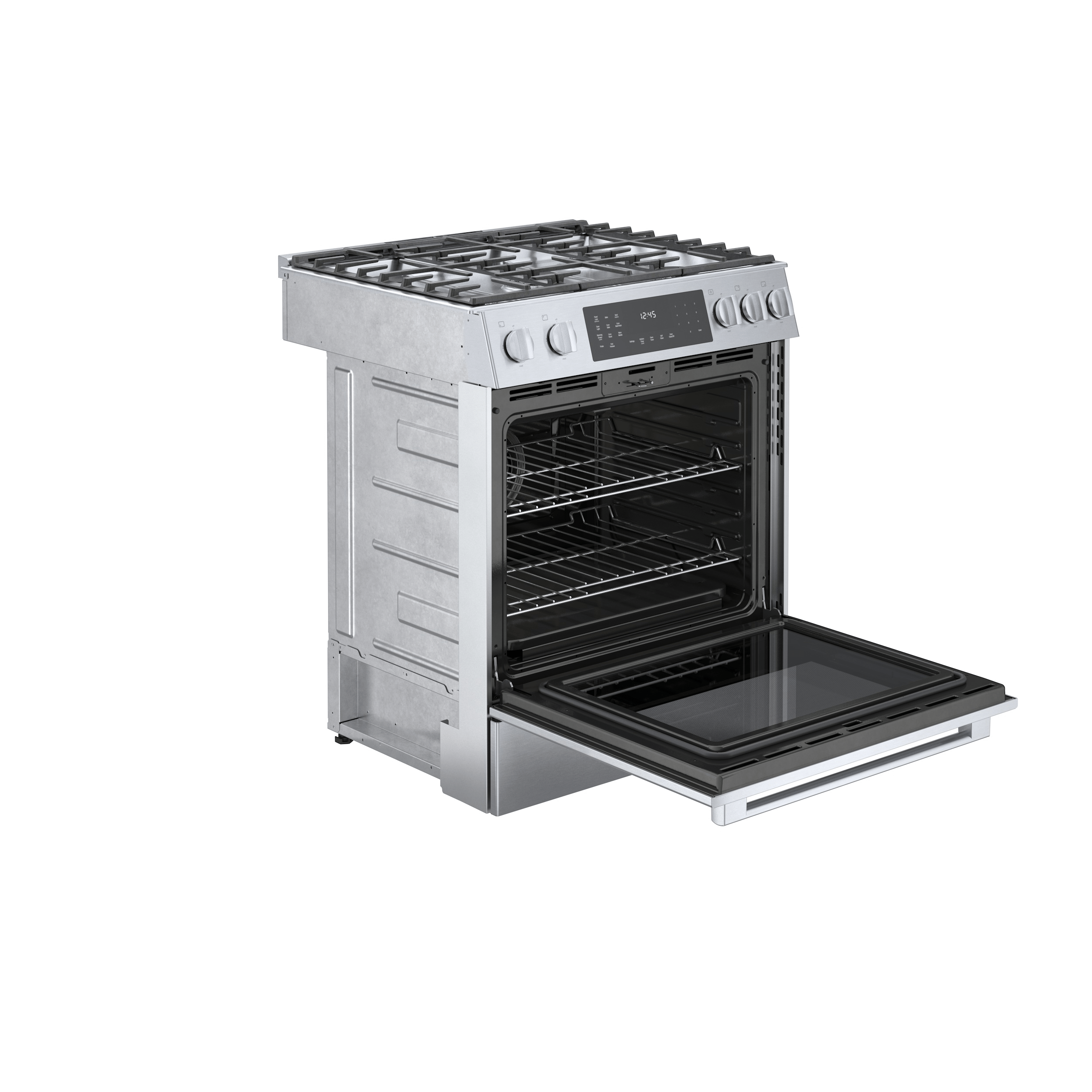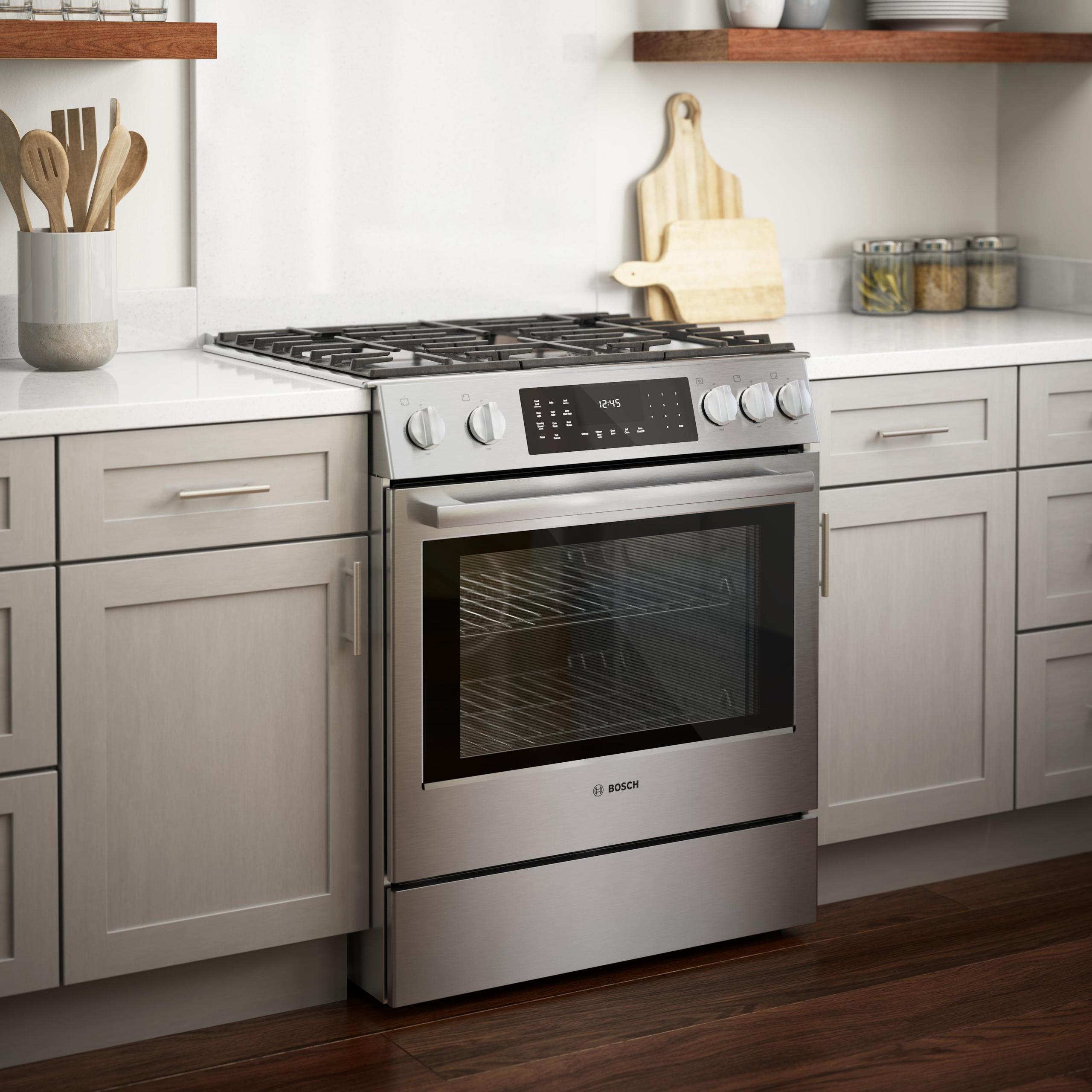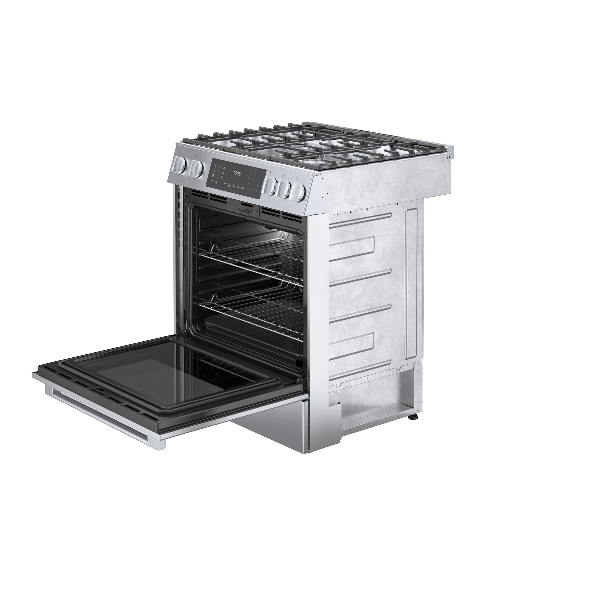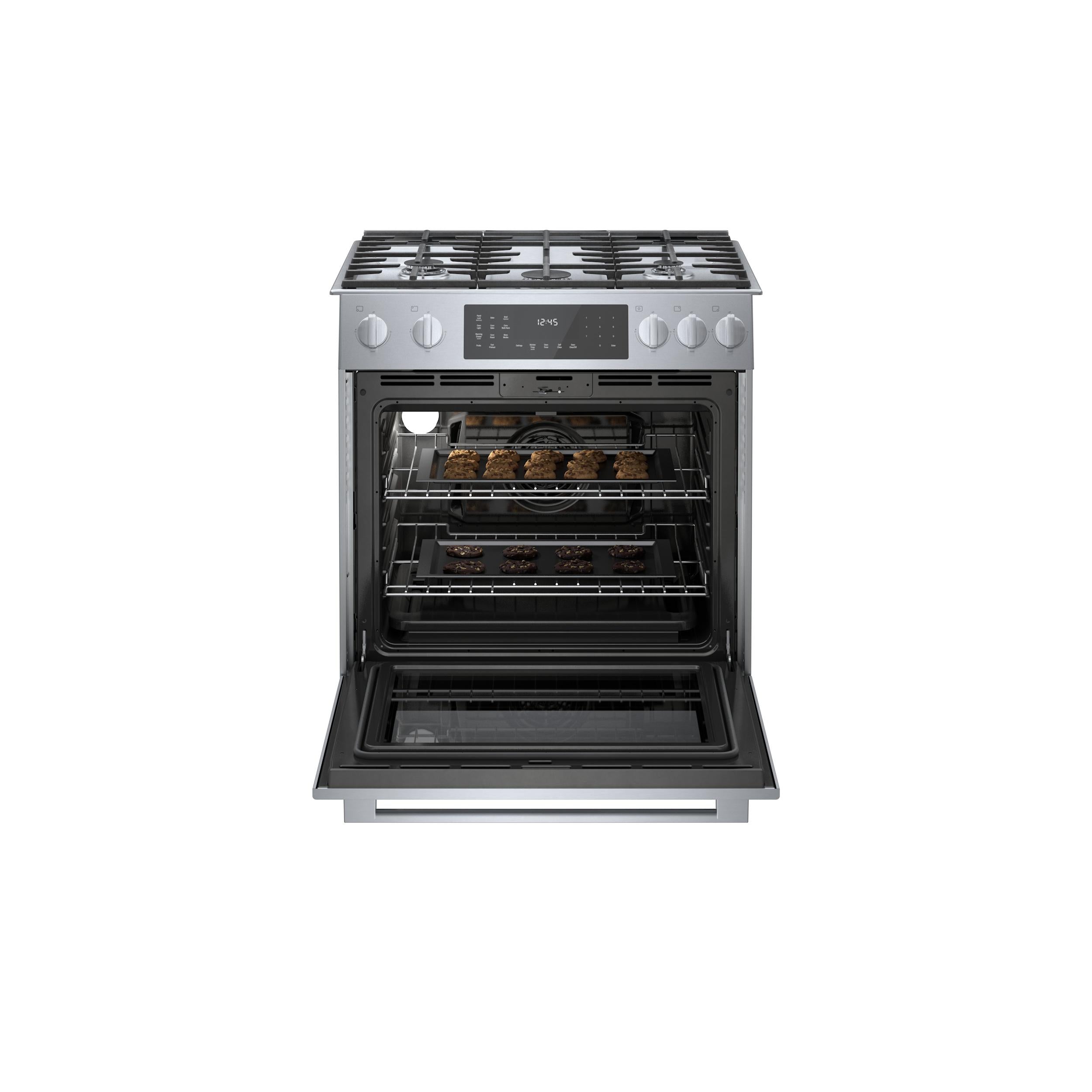 The Bosch HDI8056U is a 30-inch slide-in dual-fuel range from the 800 Series, designed for precise cooking control and exceptional versatility. The stainless steel exterior adds a premium, modern touch to your kitchen, while the dual-fuel configuration provides the best of both worlds—a gas cooktop for instant, powerful heat and an electric convection oven for precise baking and roasting.