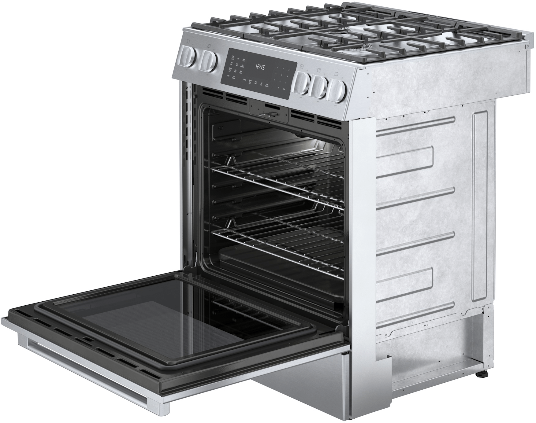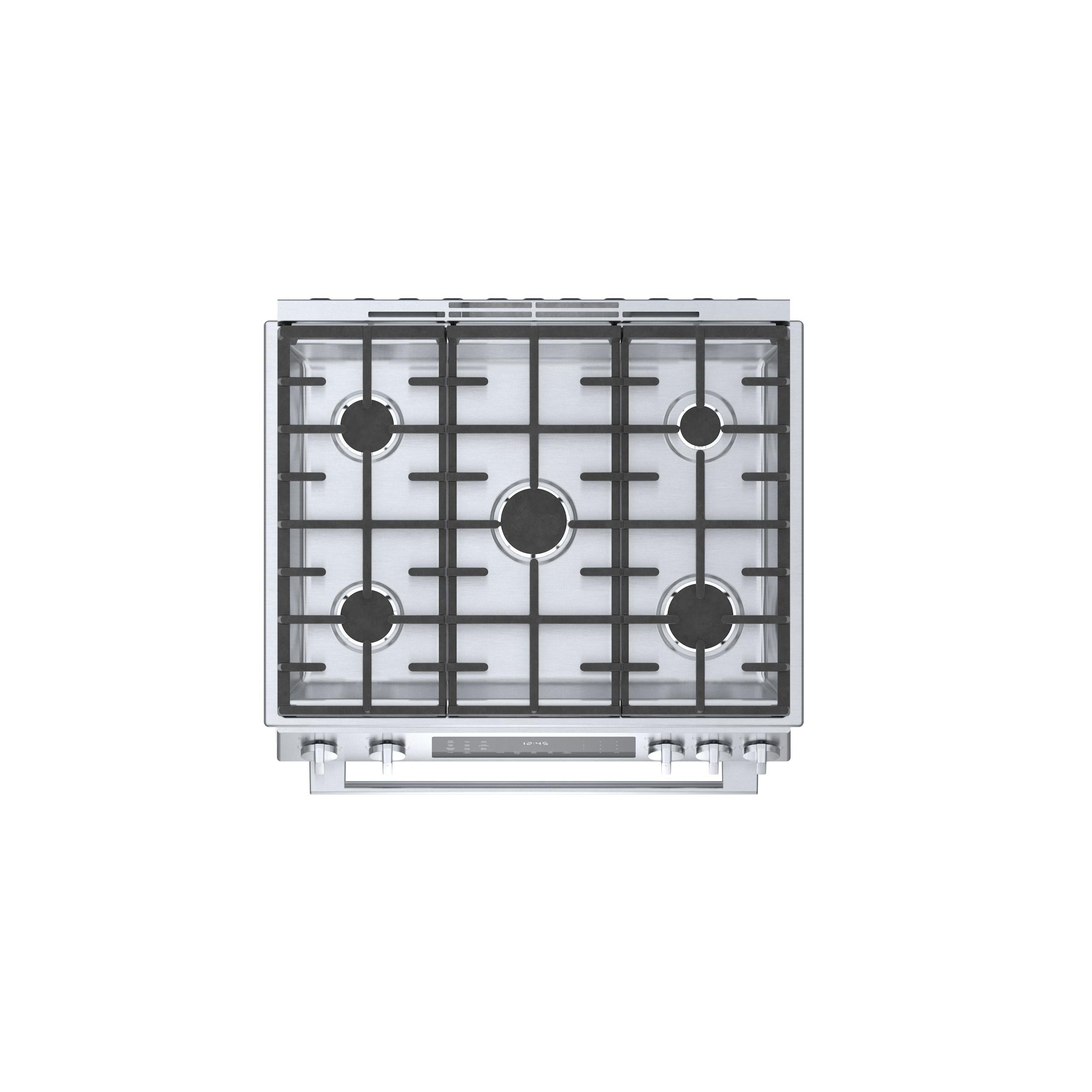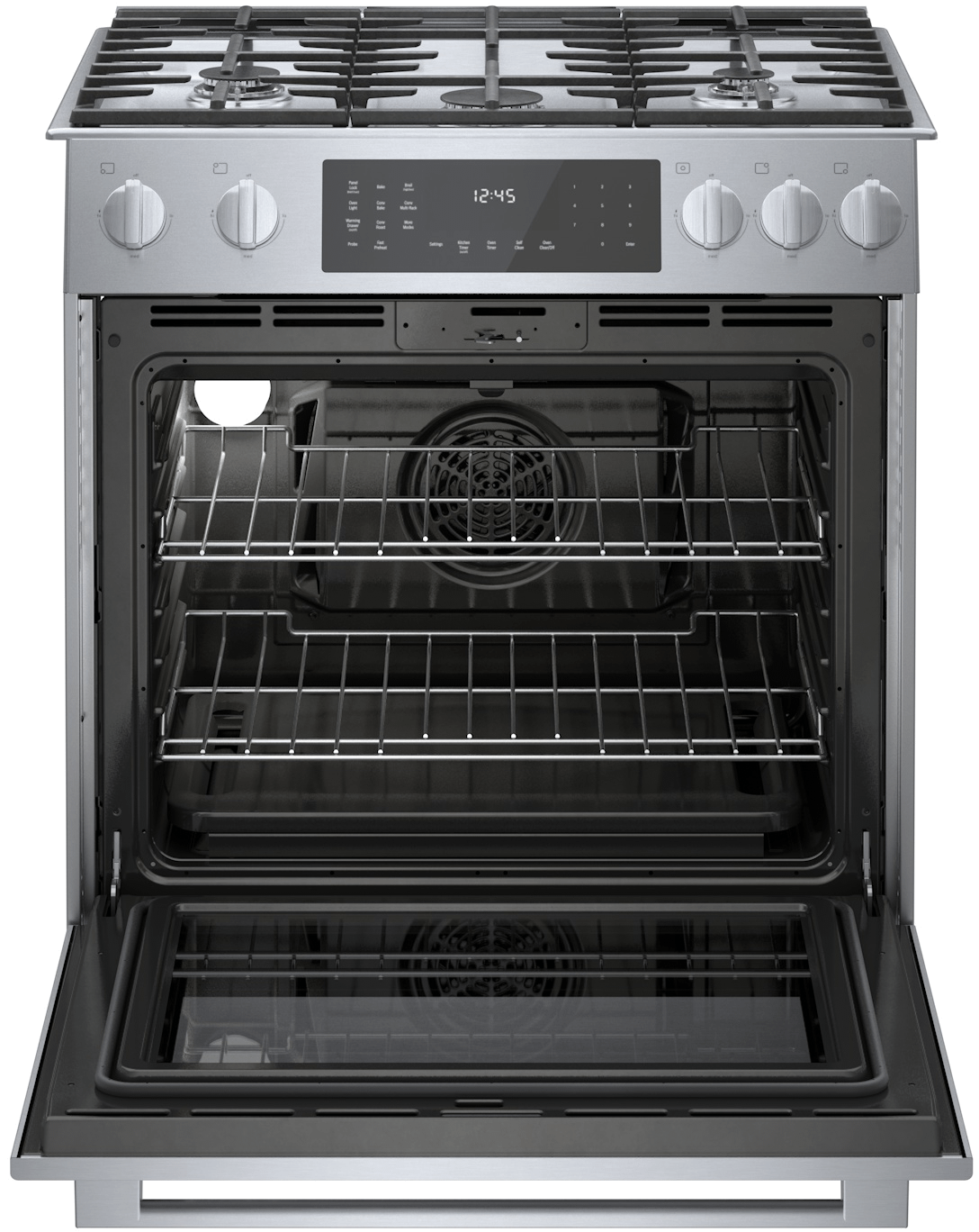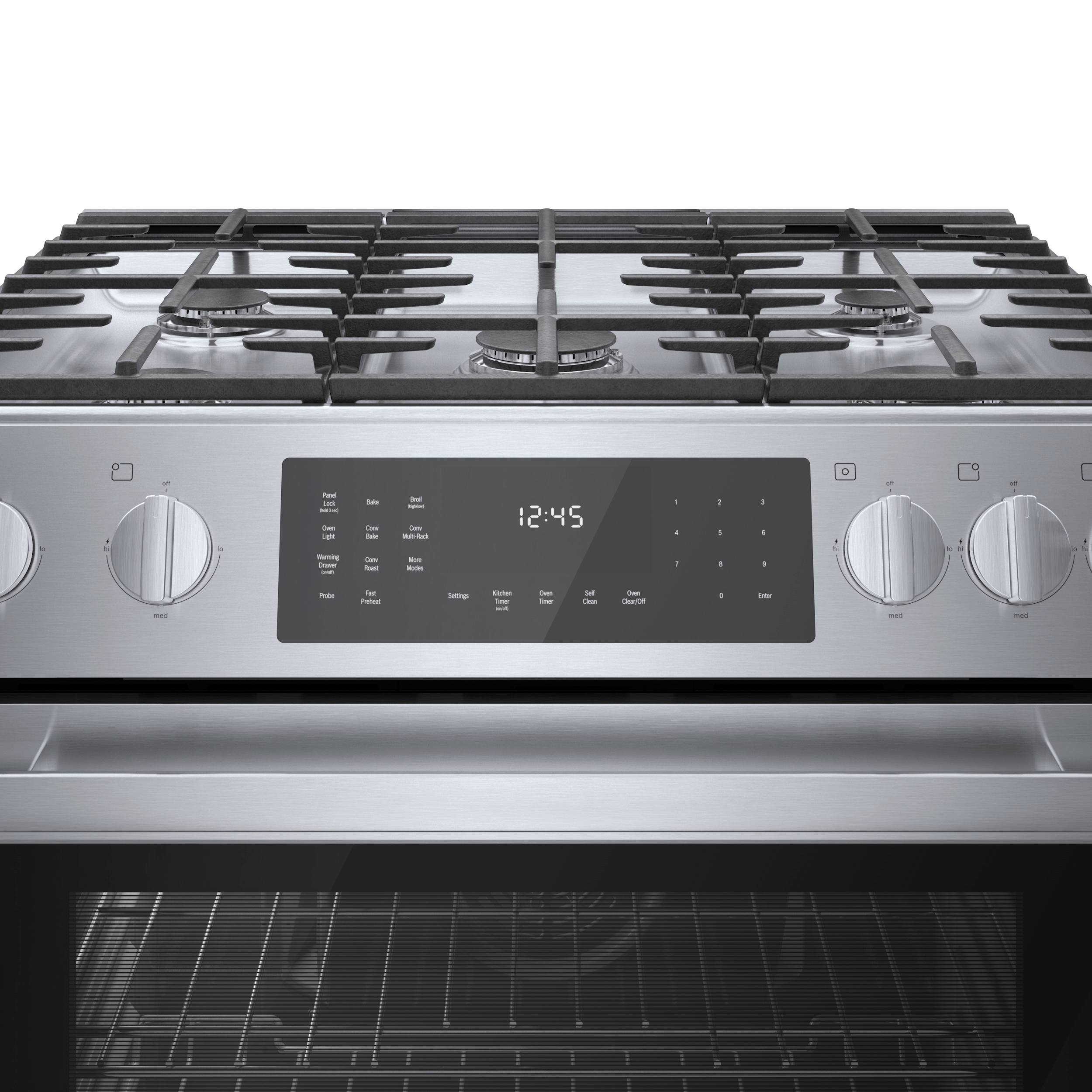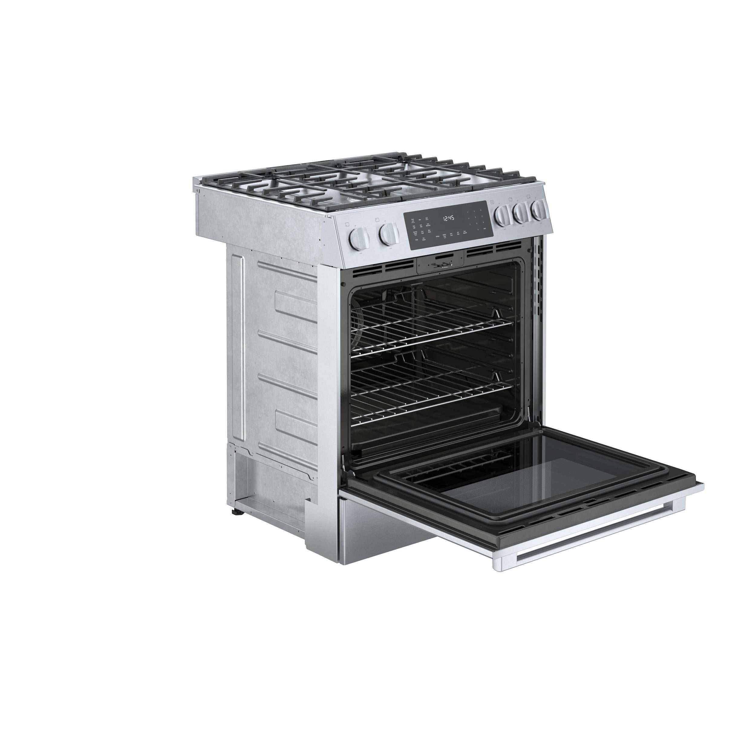 The Bosch HDI8056U is a 30-inch slide-in dual-fuel range from the 800 Series, designed for precise cooking control and exceptional versatility. The stainless steel exterior adds a premium, modern touch to your kitchen, while the dual-fuel configuration provides the best of both worlds—a gas cooktop for instant, powerful heat and an electric convection oven for precise baking and roasting.