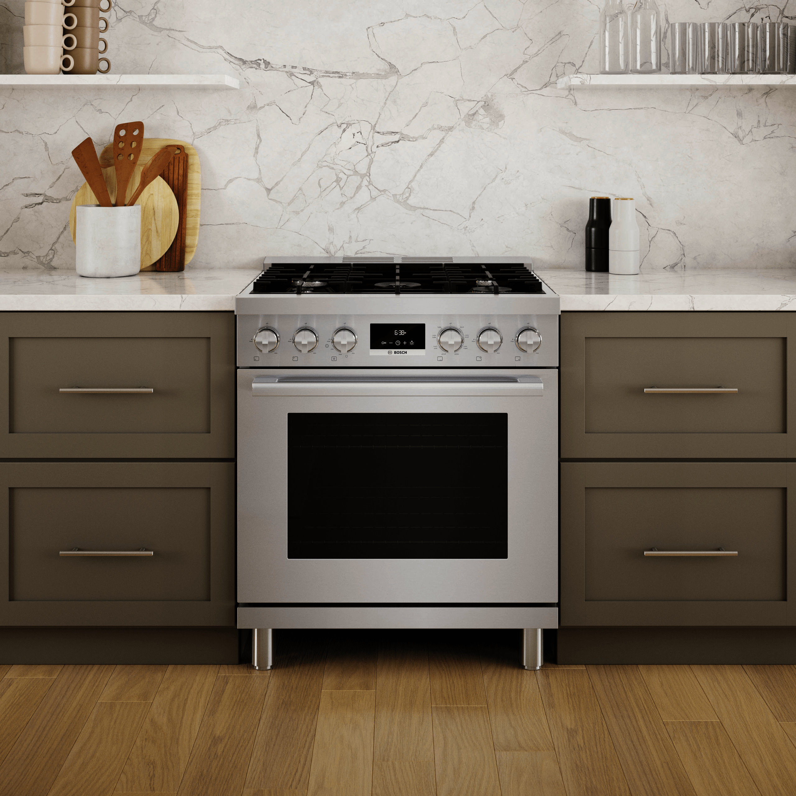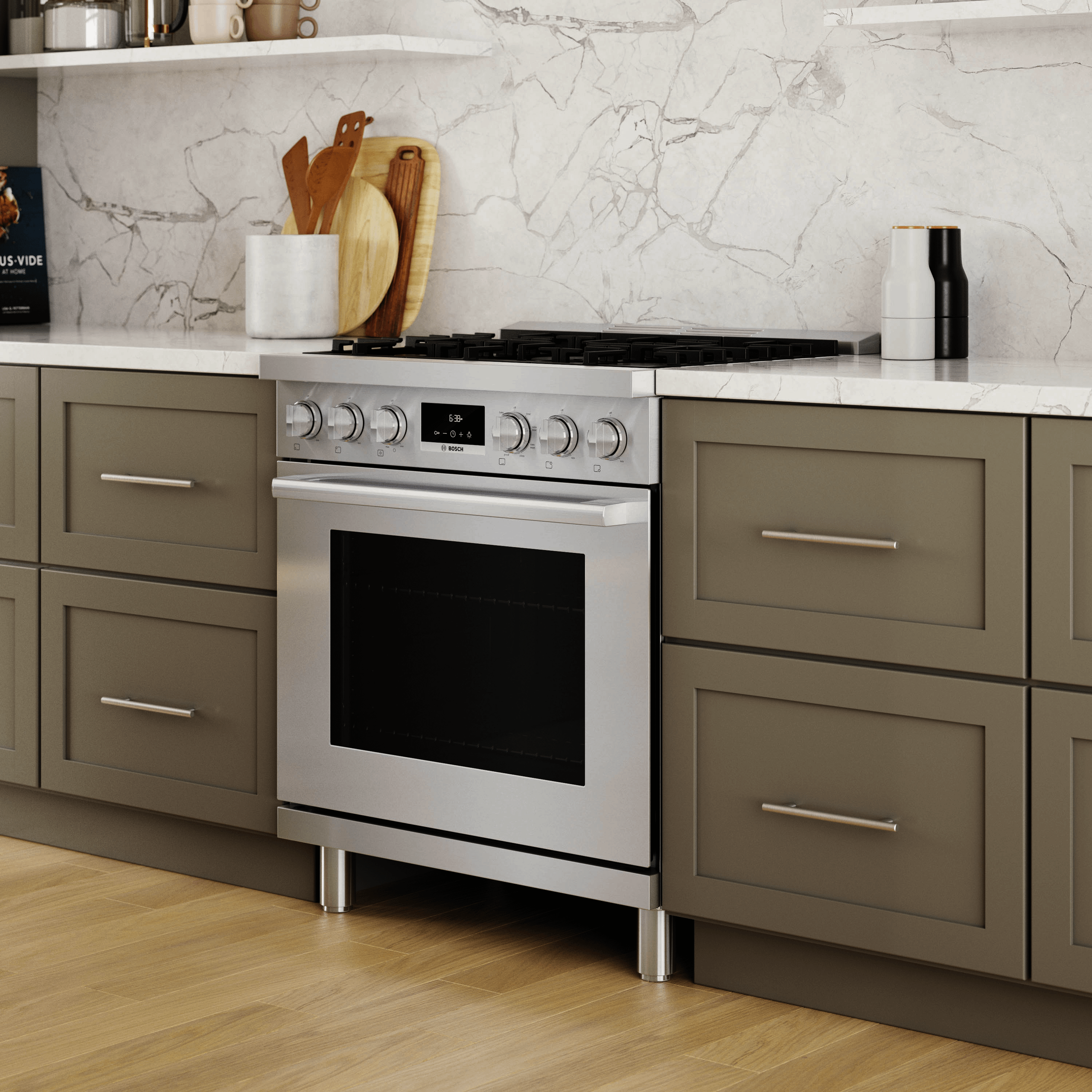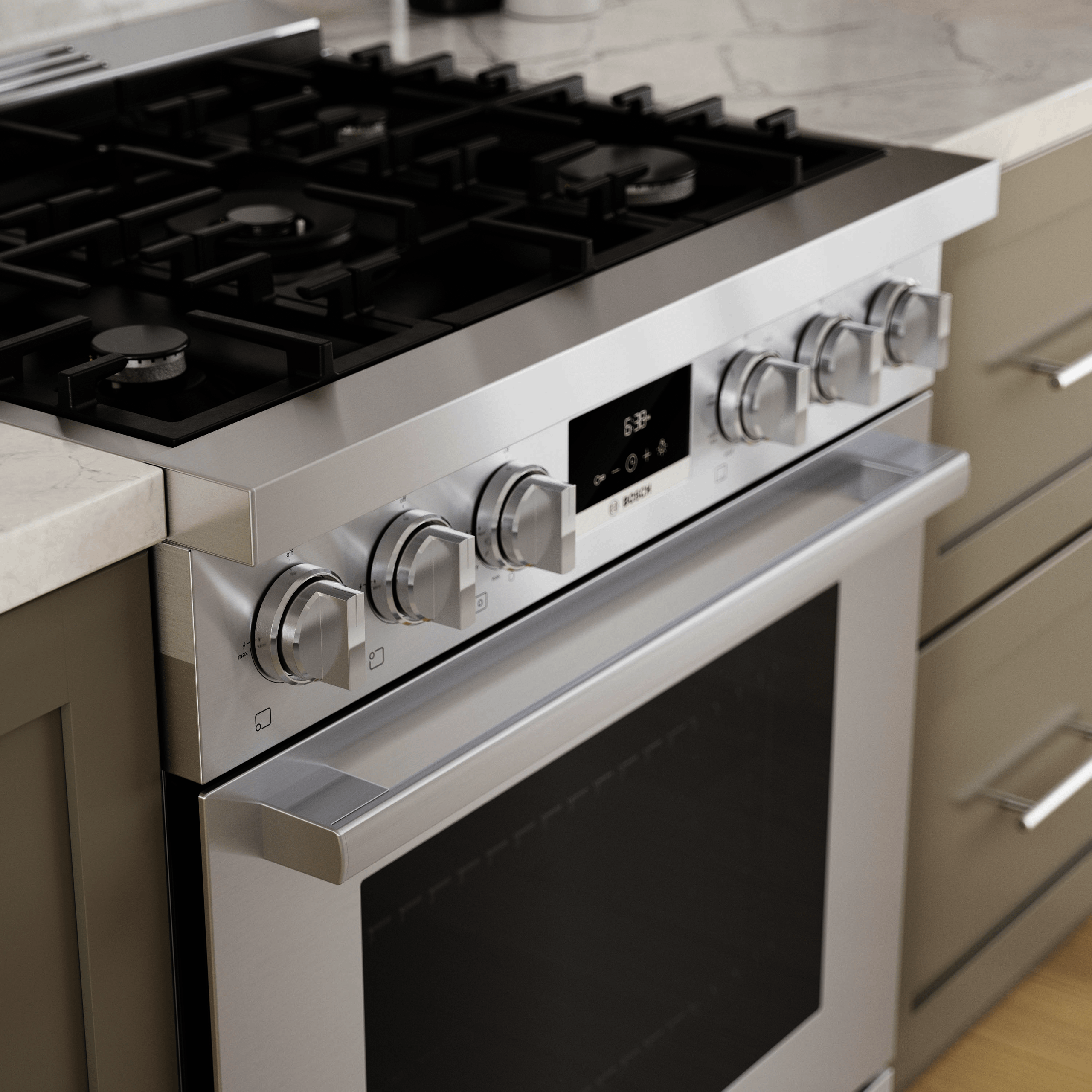The Bosch HDS8055U is a 30-inch slide-in dual-fuel range from the 800 Series, combining the precise control of a gas cooktop with the even baking performance of an electric convection oven. The stainless steel finish adds a professional touch to your kitchen, while the slide-in design provides a seamless, built-in look.