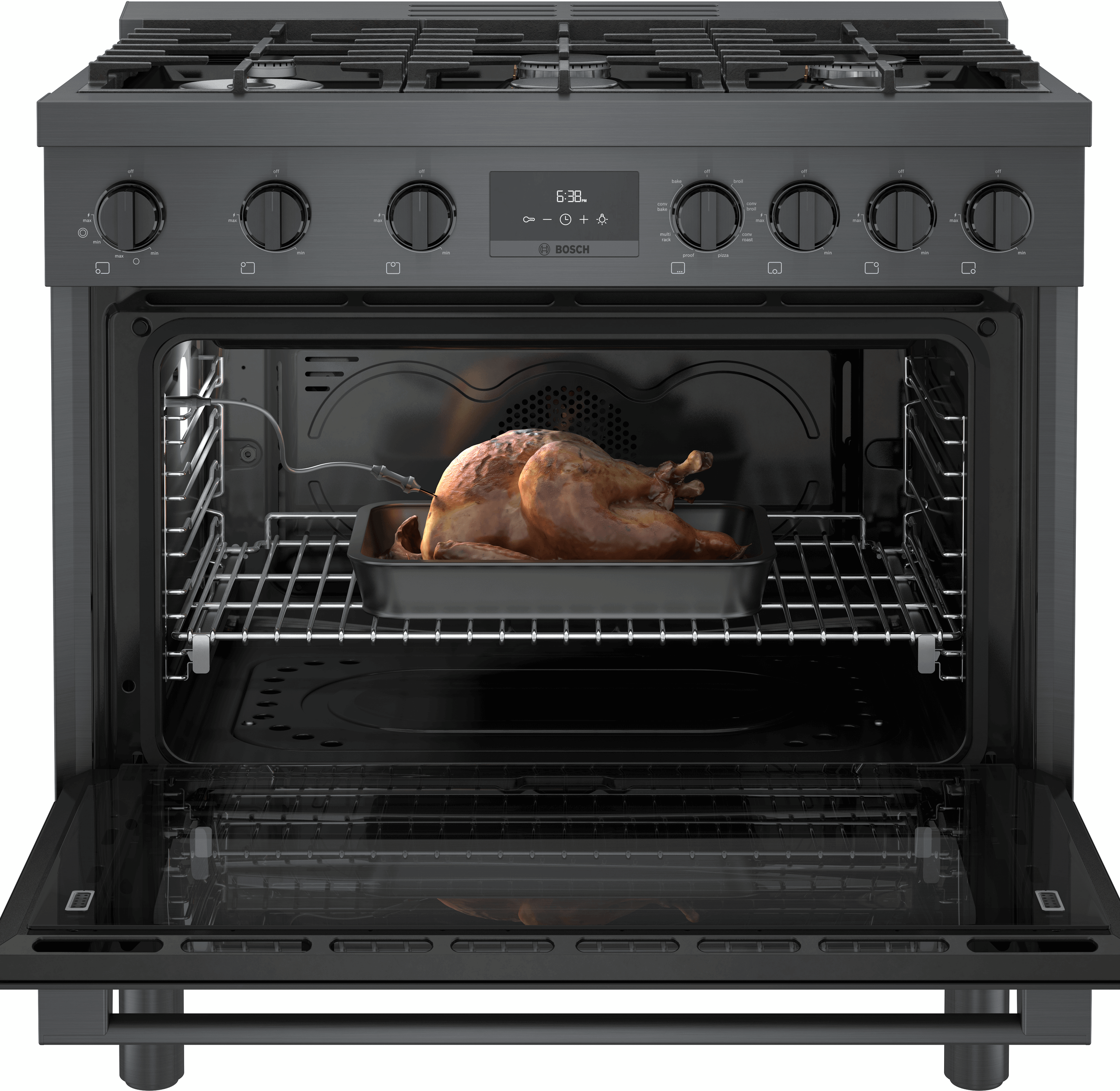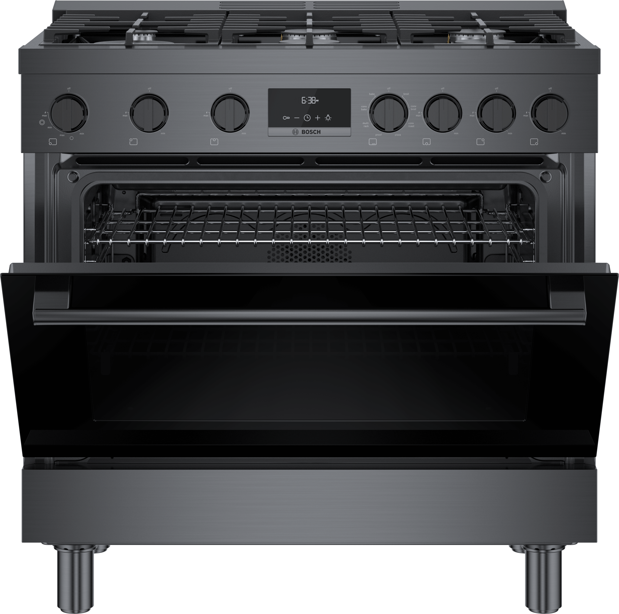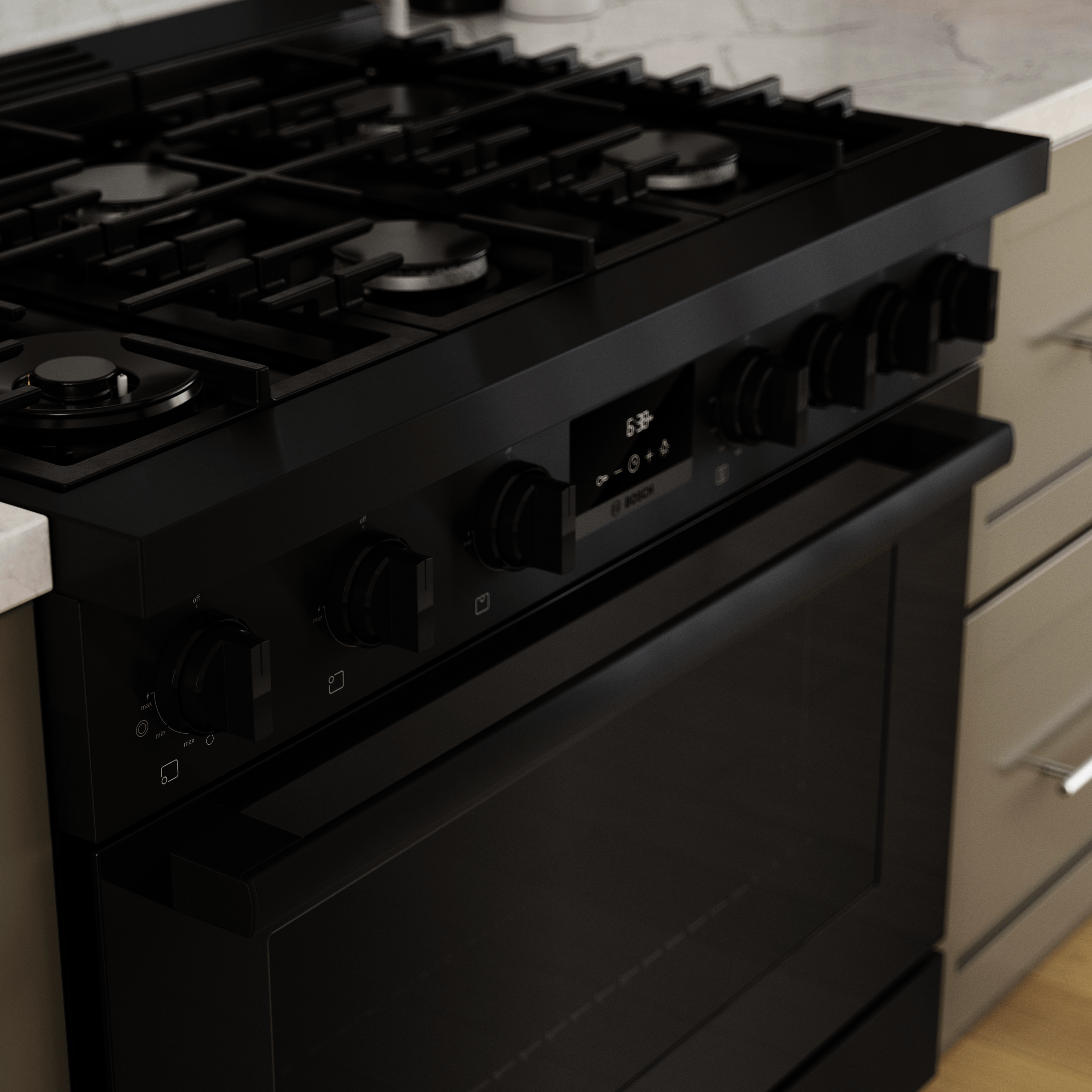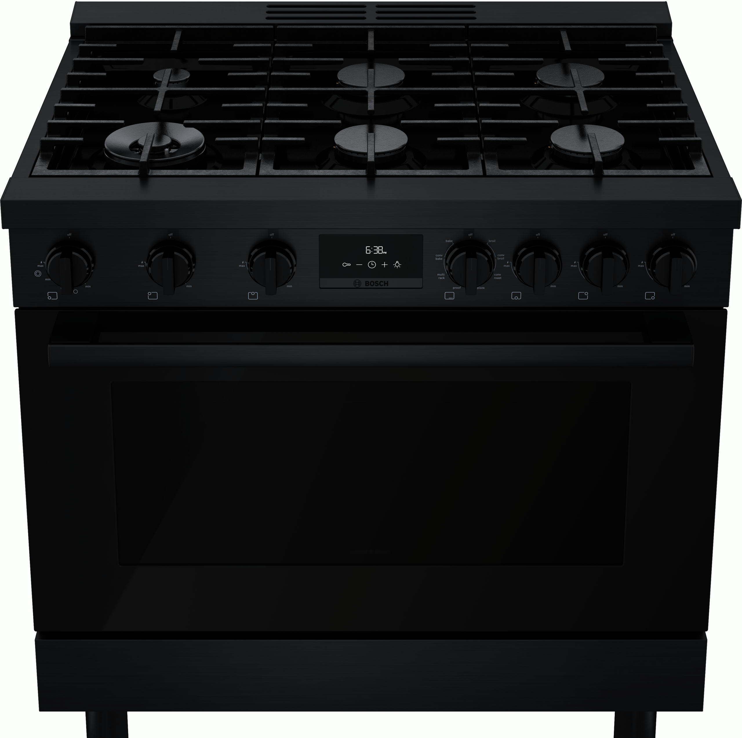 The Bosch 800 Series 36" Dual Fuel Freestanding Range (Model: HDS8645U) brings a professional touch to your kitchen with its industrial-style design and advanced cooking features. The black stainless steel finish not only provides a bold look but also helps guard against scratches and fingerprints. The cooktop is equipped with six sealed burners, including a powerful 18,000 BTU dual-ring burner for rapid boiling and high-heat cooking, and a 5,000 BTU simmer burner for delicate tasks. The 3.7 cu. ft. convection oven utilizes Genuine European Convection to ensure even baking results on multiple racks. Additional features include a Telescopic Rack that moves smoothly to support heavy dishes, a QuietClose® Door with dampened hinges for soft closing, and heavy-duty metal knobs that enhance the premium feel. The range's design allows for flush installation with cabinetry, creating a seamless and integrated kitchen appearance.
