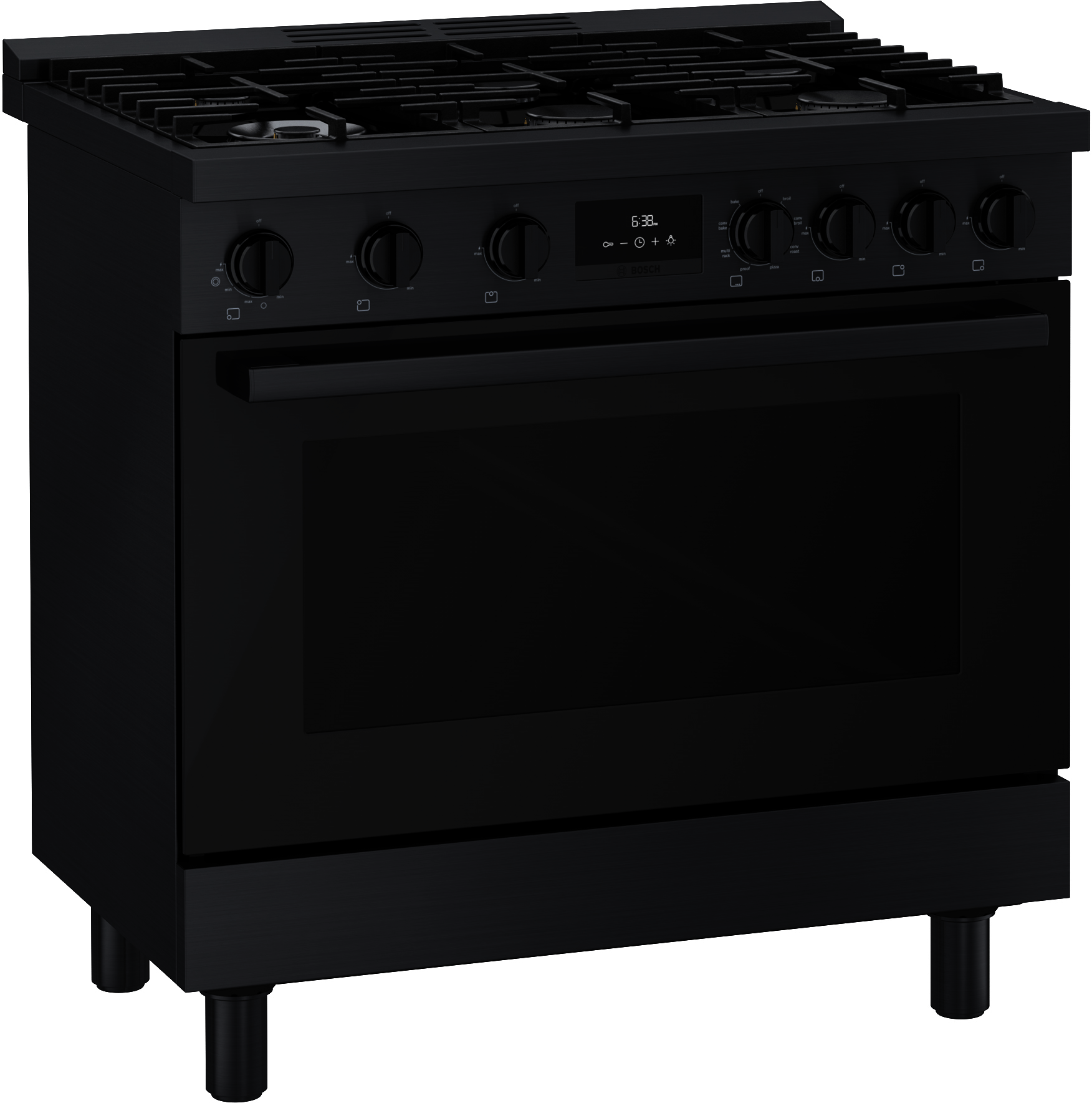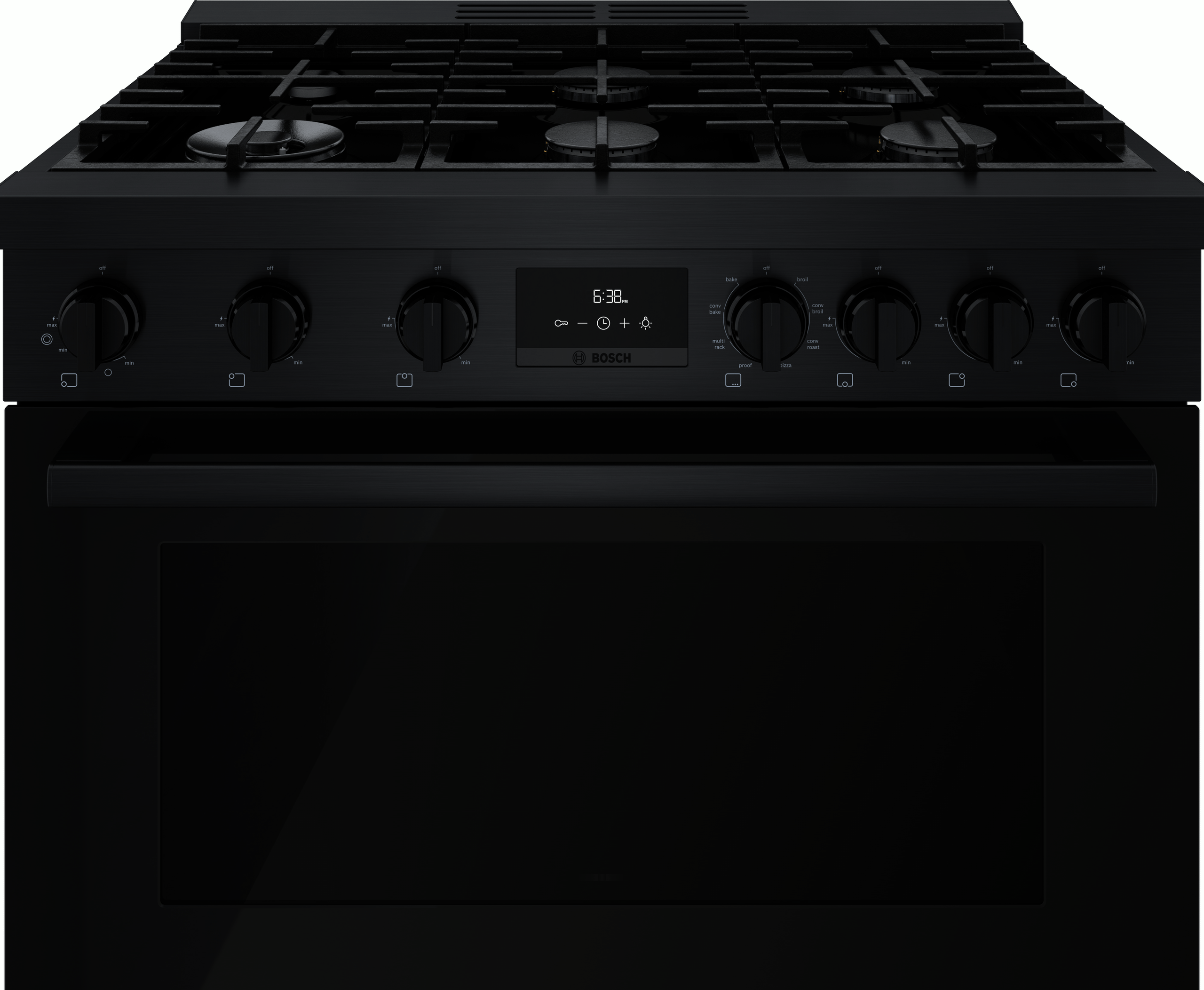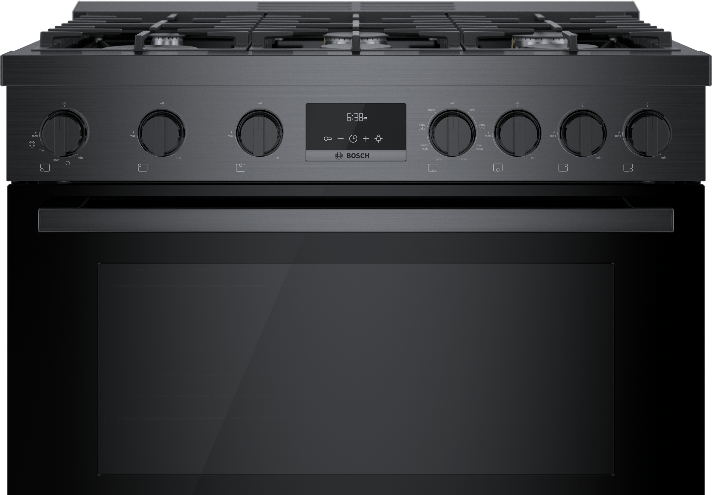 The Bosch 800 Series 36" Dual Fuel Freestanding Range (Model: HDS8645U) brings a professional touch to your kitchen with its industrial-style design and advanced cooking features. The black stainless steel finish not only provides a bold look but also helps guard against scratches and fingerprints. The cooktop is equipped with six sealed burners, including a powerful 18,000 BTU dual-ring burner for rapid boiling and high-heat cooking, and a 5,000 BTU simmer burner for delicate tasks. The 3.7 cu. ft. convection oven utilizes Genuine European Convection to ensure even baking results on multiple racks. Additional features include a Telescopic Rack that moves smoothly to support heavy dishes, a QuietClose® Door with dampened hinges for soft closing, and heavy-duty metal knobs that enhance the premium feel. The range's design allows for flush installation with cabinetry, creating a seamless and integrated kitchen appearance.
