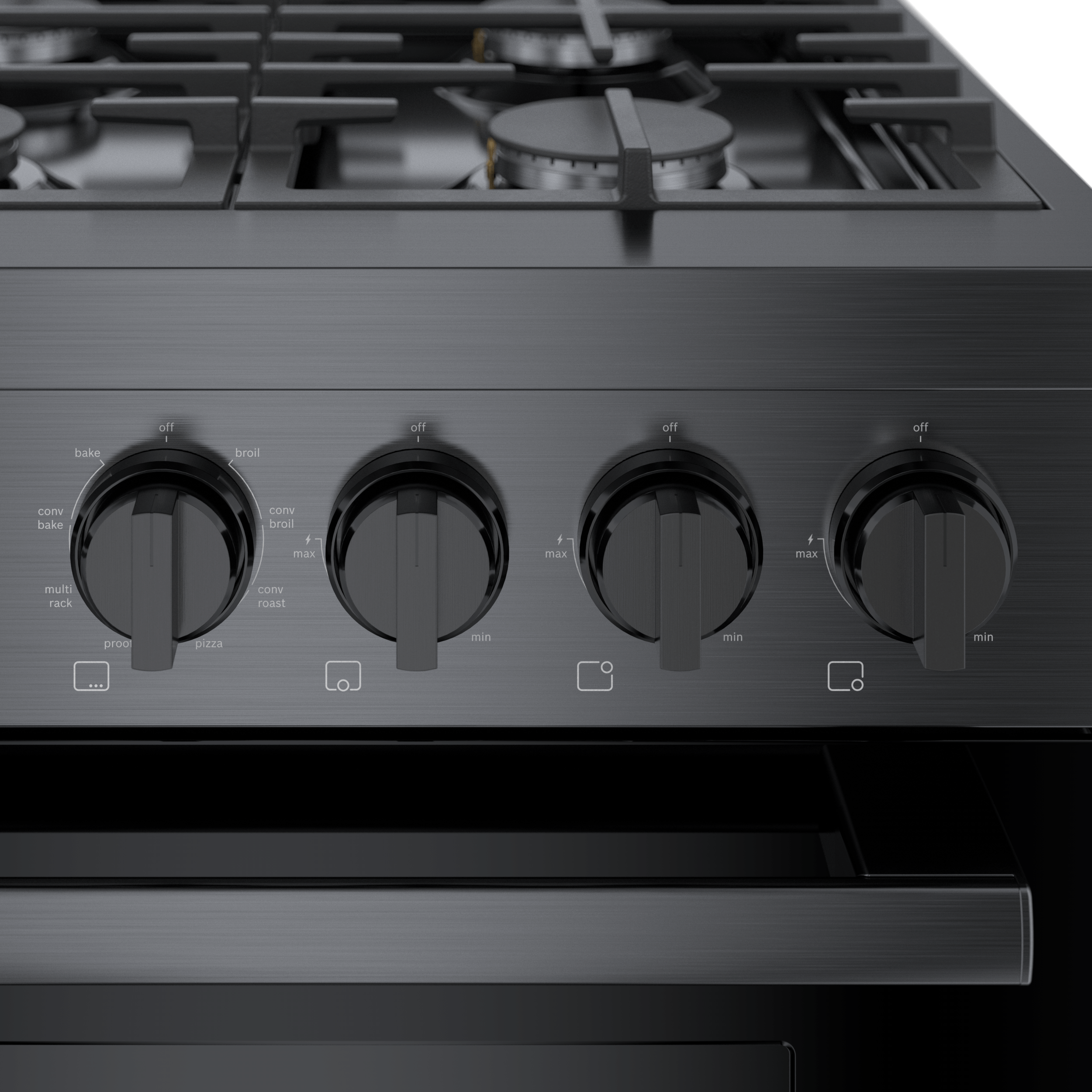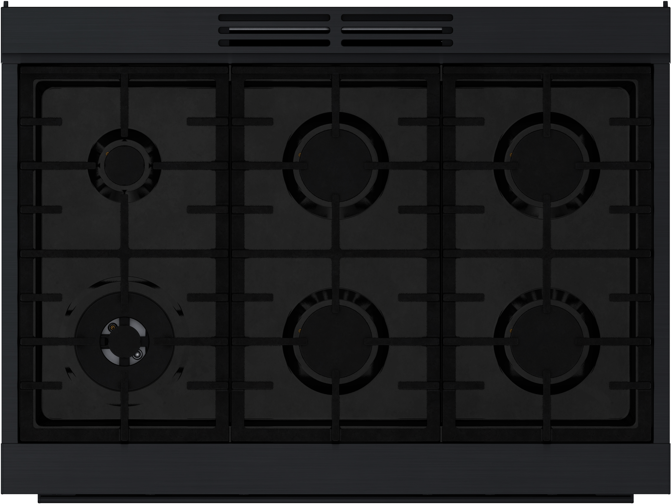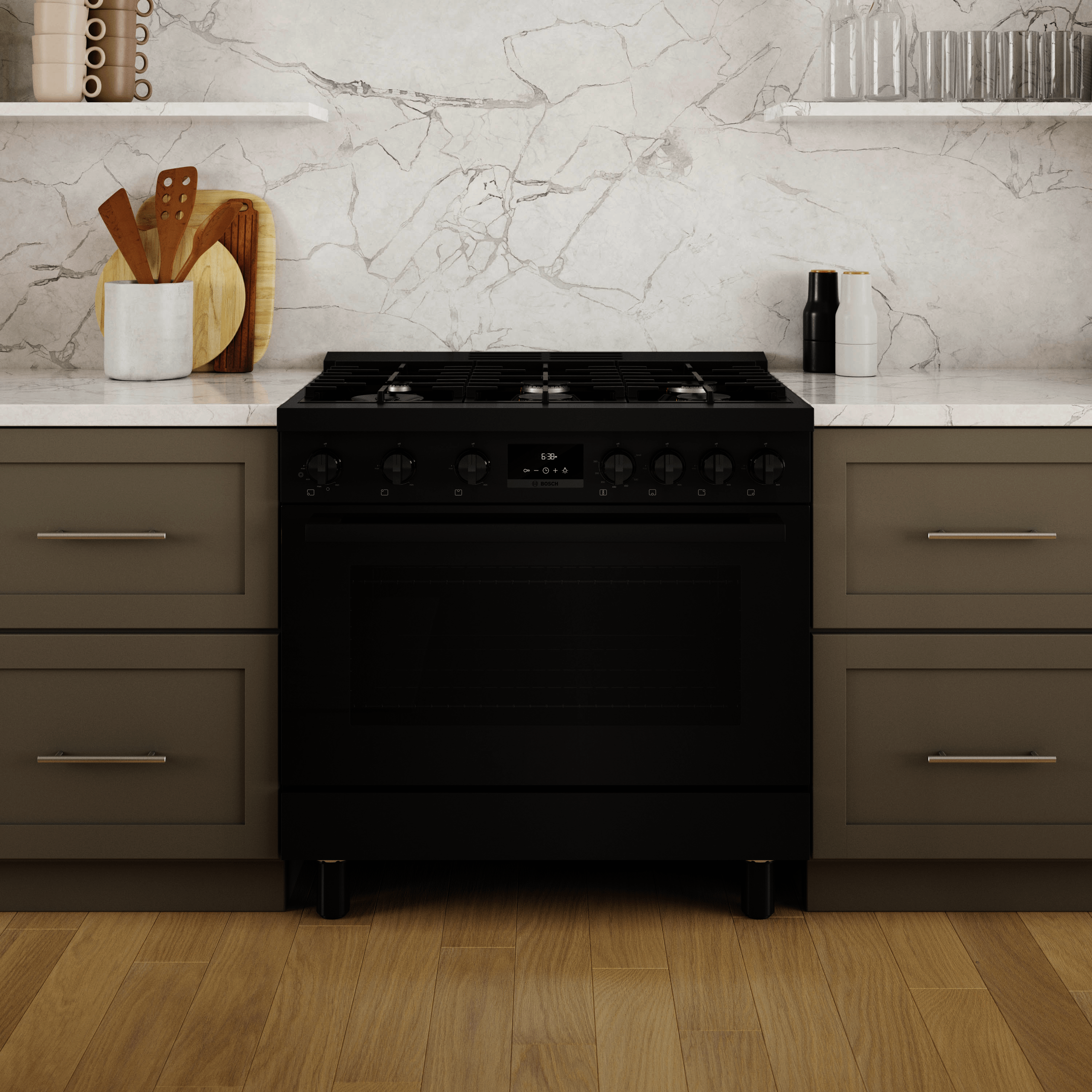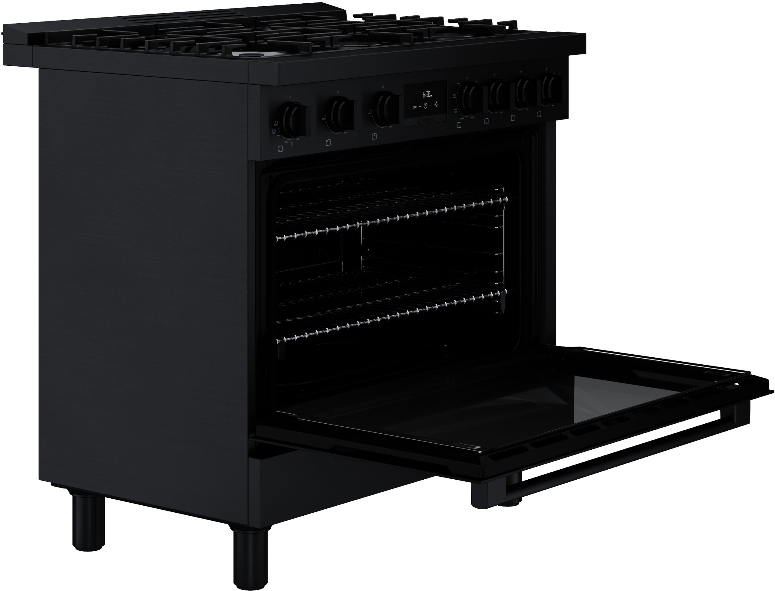 The Bosch 800 Series 36" Dual Fuel Freestanding Range (Model: HDS8645U) brings a professional touch to your kitchen with its industrial-style design and advanced cooking features. The black stainless steel finish not only provides a bold look but also helps guard against scratches and fingerprints. The cooktop is equipped with six sealed burners, including a powerful 18,000 BTU dual-ring burner for rapid boiling and high-heat cooking, and a 5,000 BTU simmer burner for delicate tasks. The 3.7 cu. ft. convection oven utilizes Genuine European Convection to ensure even baking results on multiple racks. Additional features include a Telescopic Rack that moves smoothly to support heavy dishes, a QuietClose® Door with dampened hinges for soft closing, and heavy-duty metal knobs that enhance the premium feel. The range's design allows for flush installation with cabinetry, creating a seamless and integrated kitchen appearance.