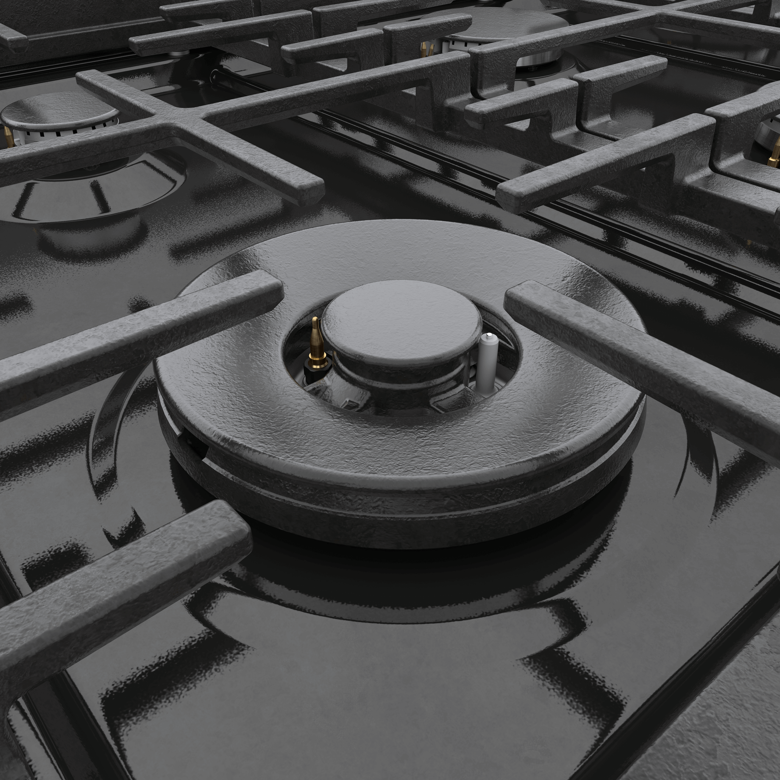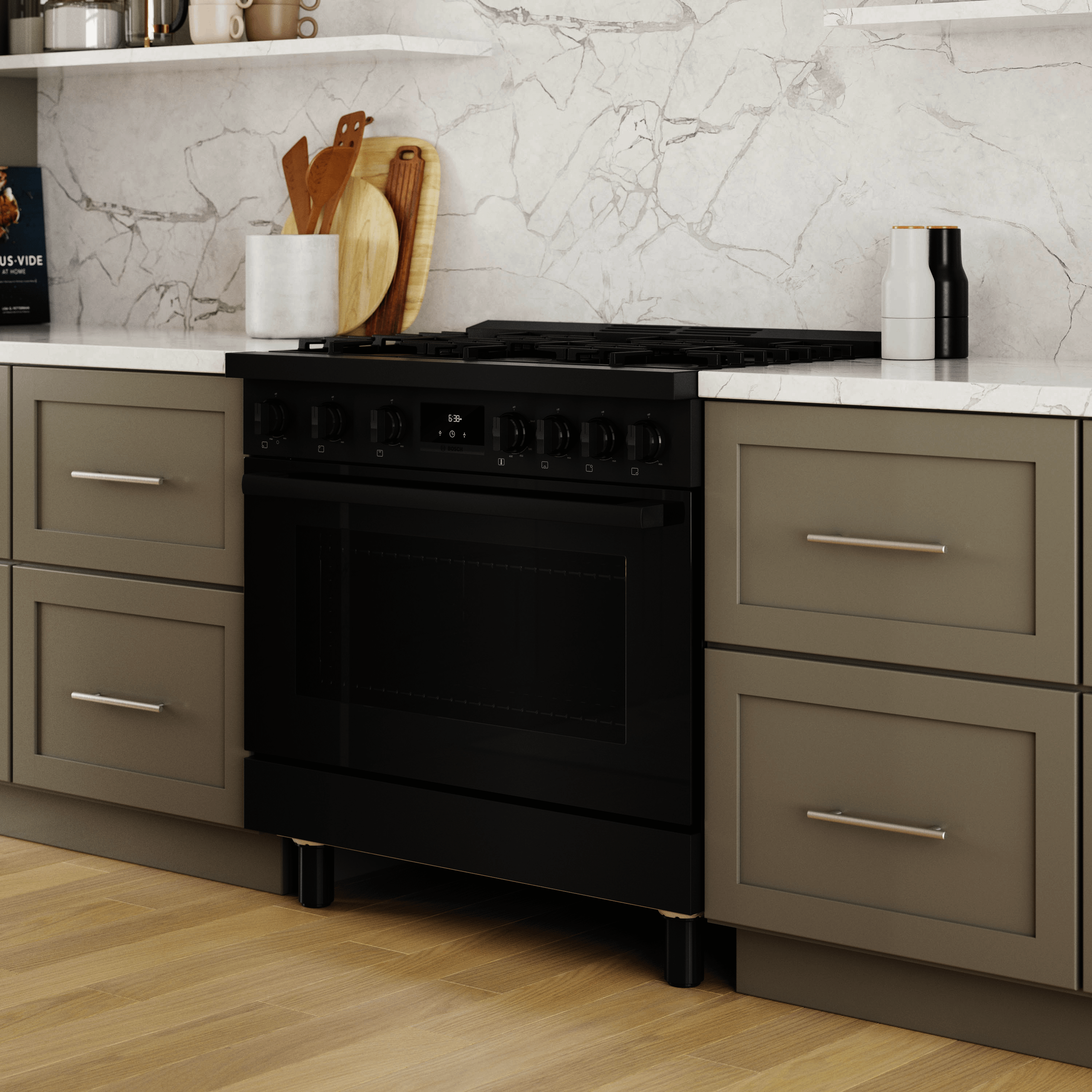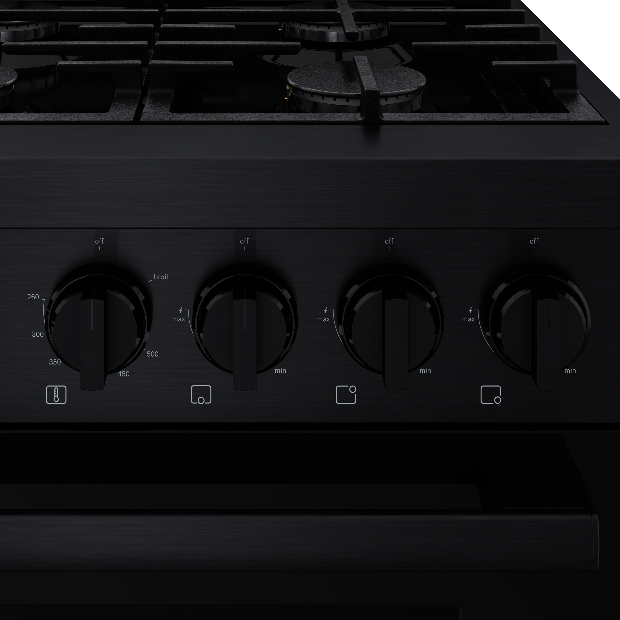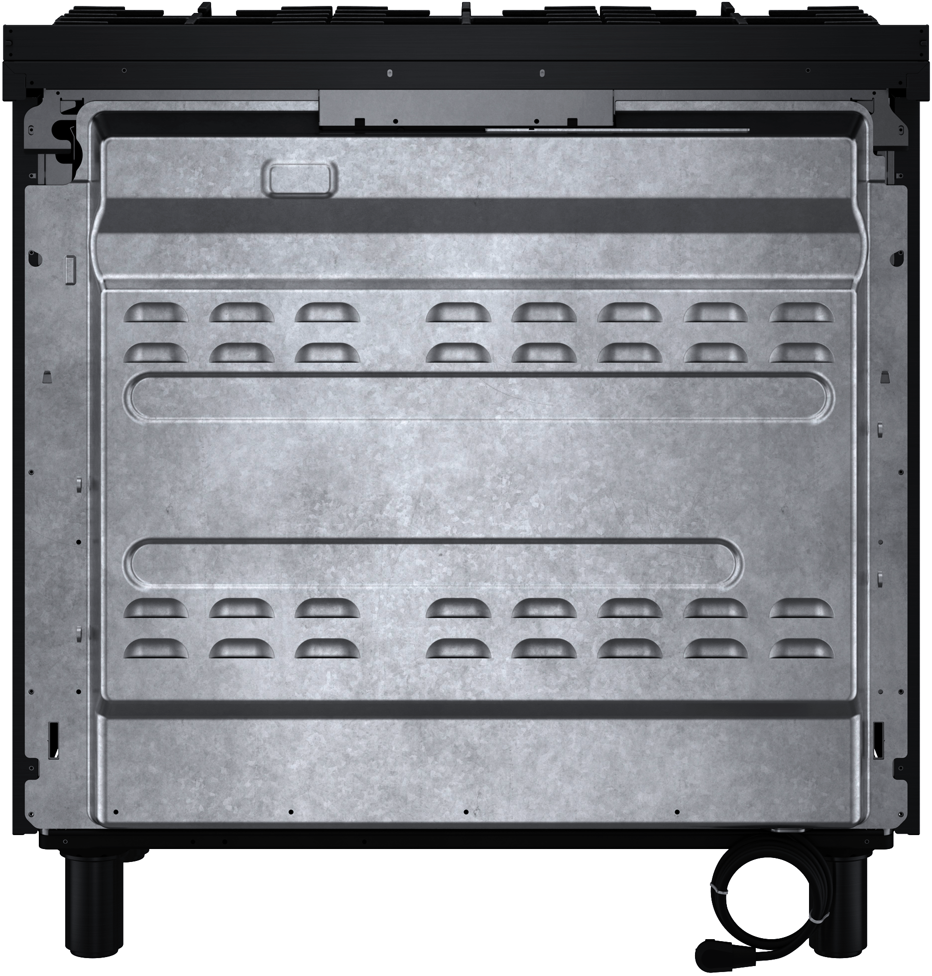 The gas cooktop features five sealed burners, including an 18,000 BTU dual-ring power burner for fast boiling, searing, and stir-frying, as well as a low simmer burner for delicate sauces. The continuous cast-iron grates make it easy to slide pots and pans across the cooktop without lifting.