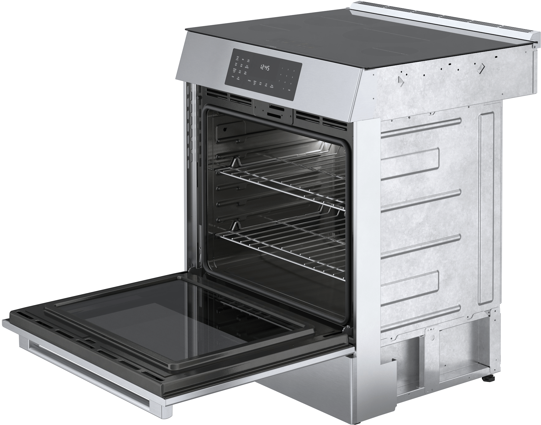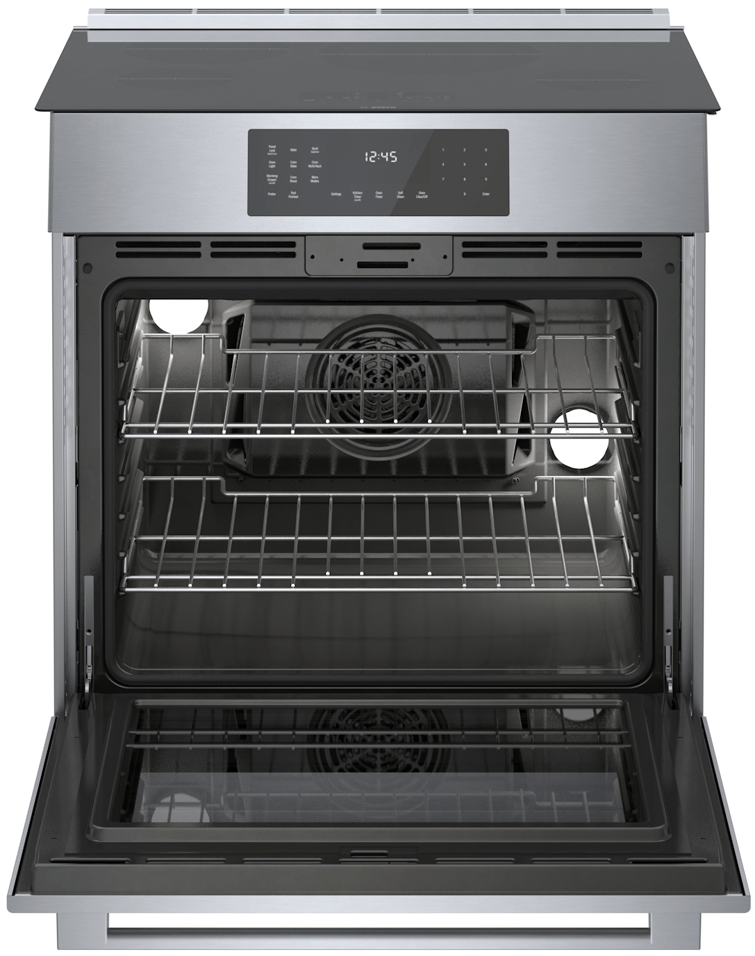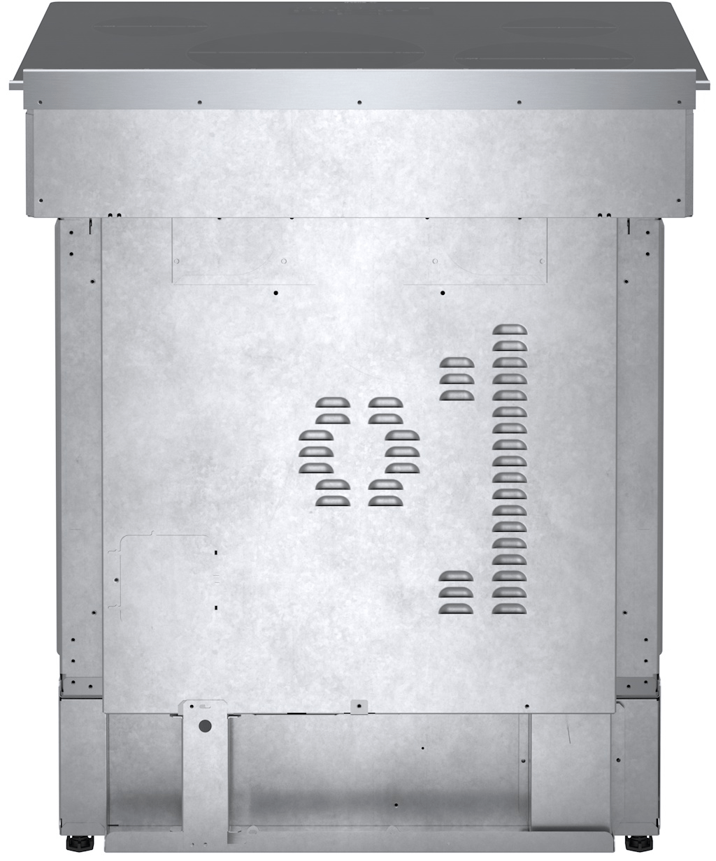 The slide-in design can replace a freestanding range cutout and slides back against the wall for a sleek built-in look.