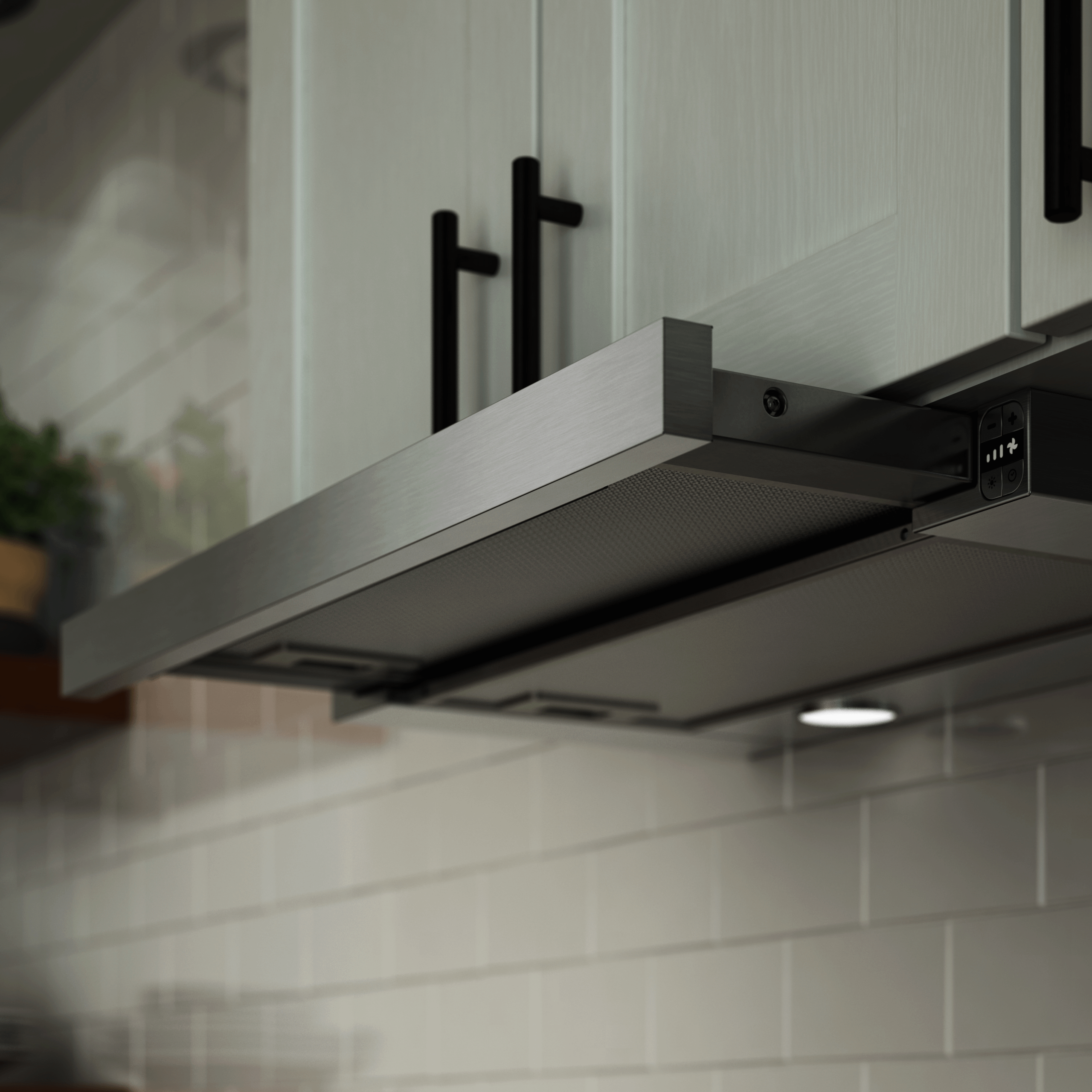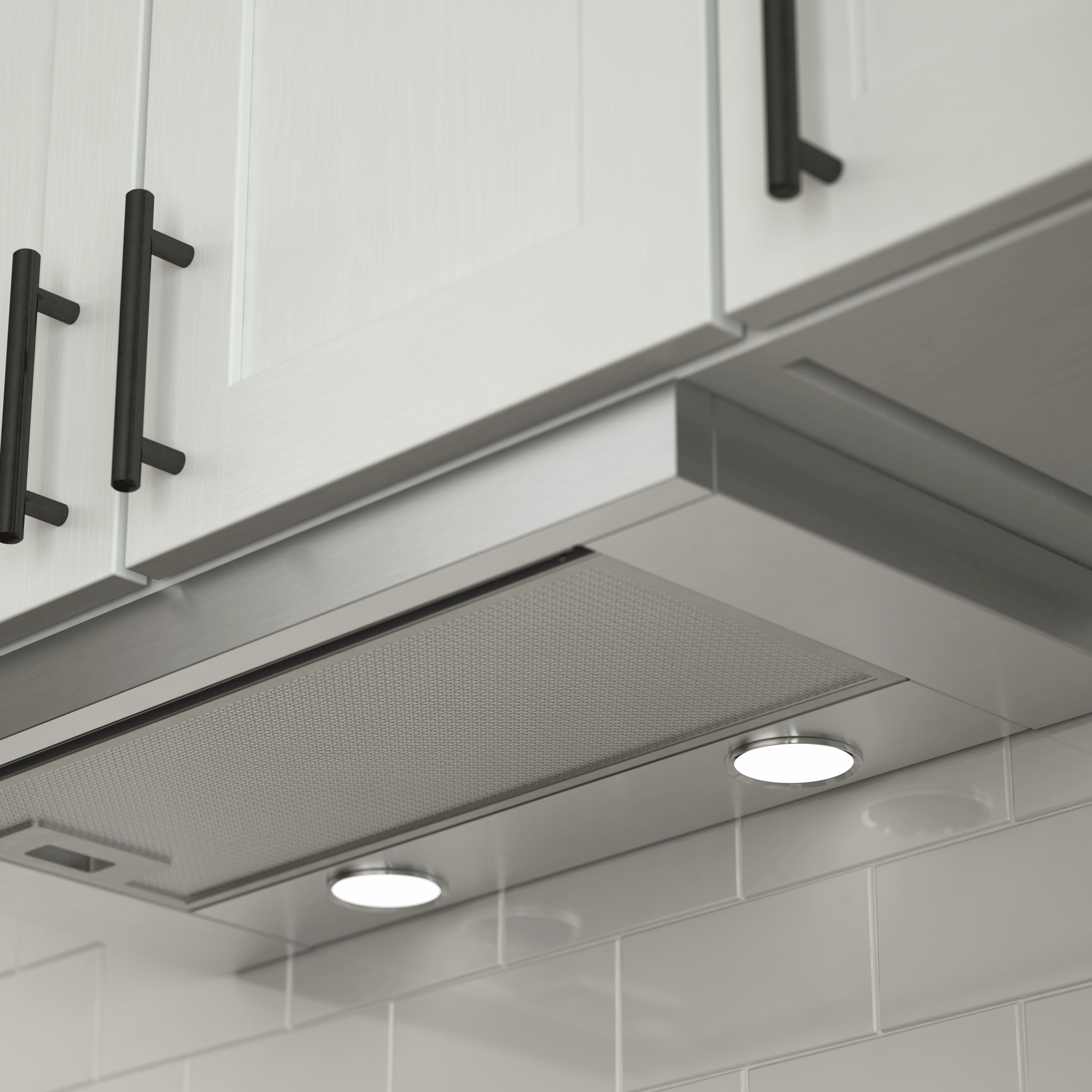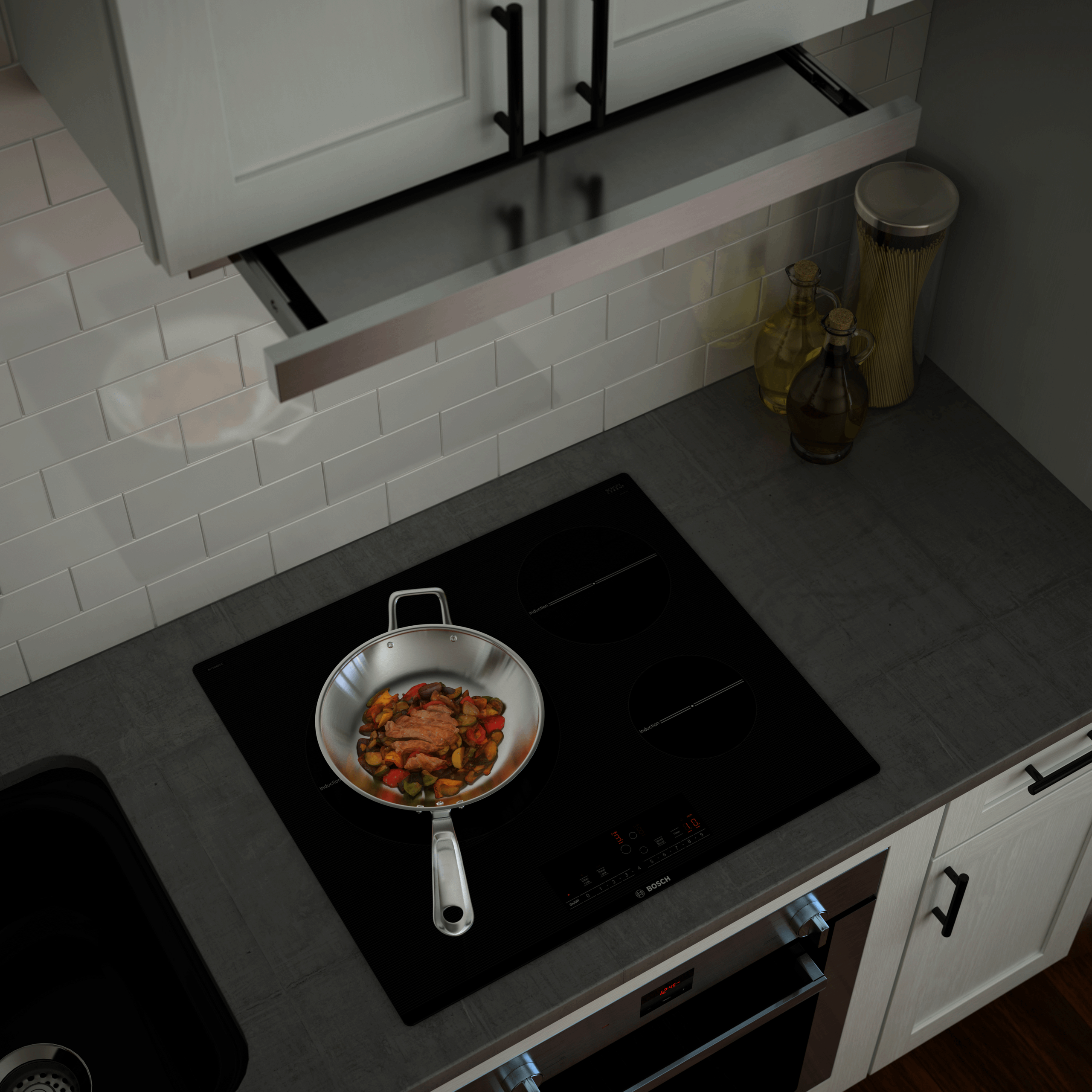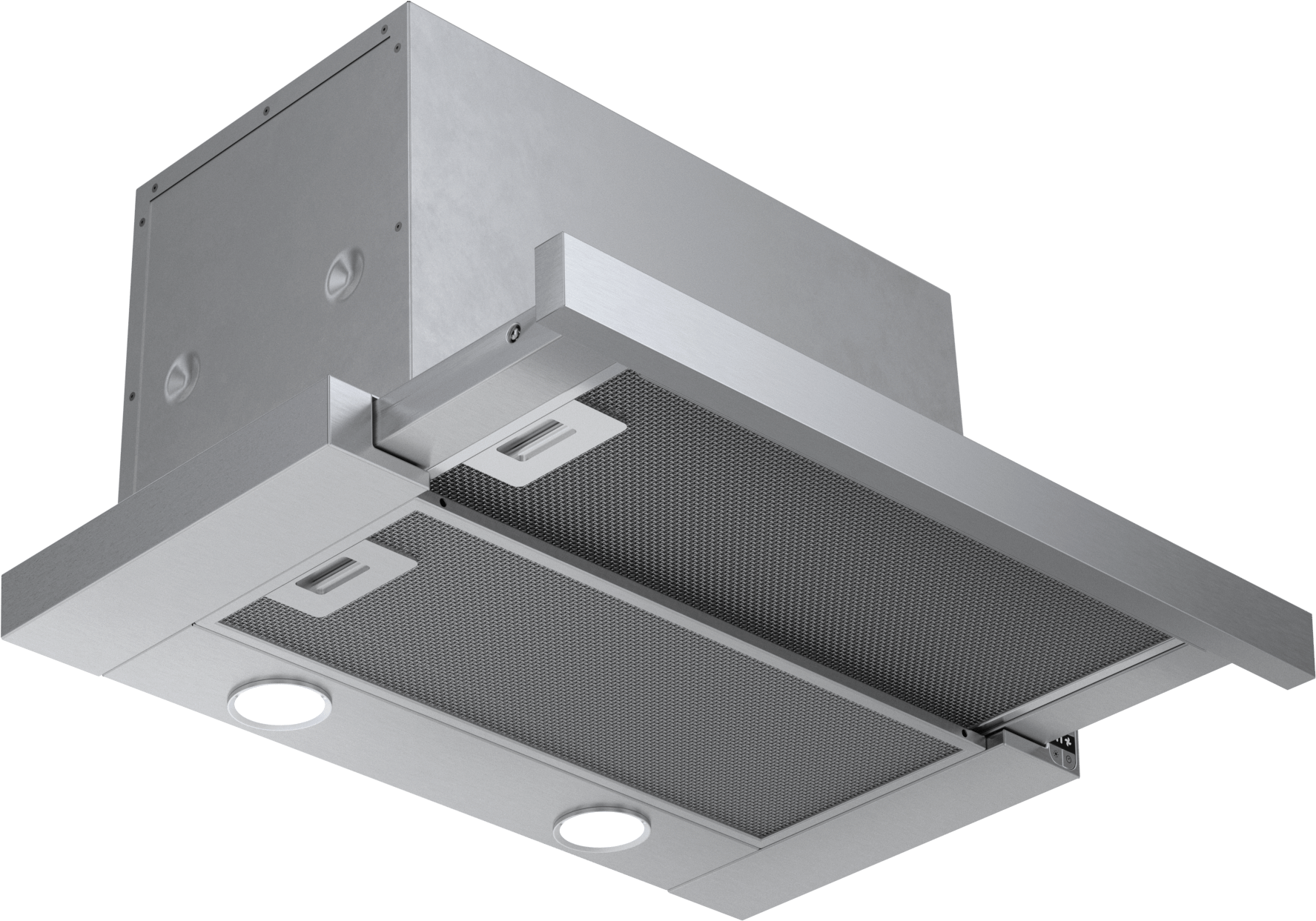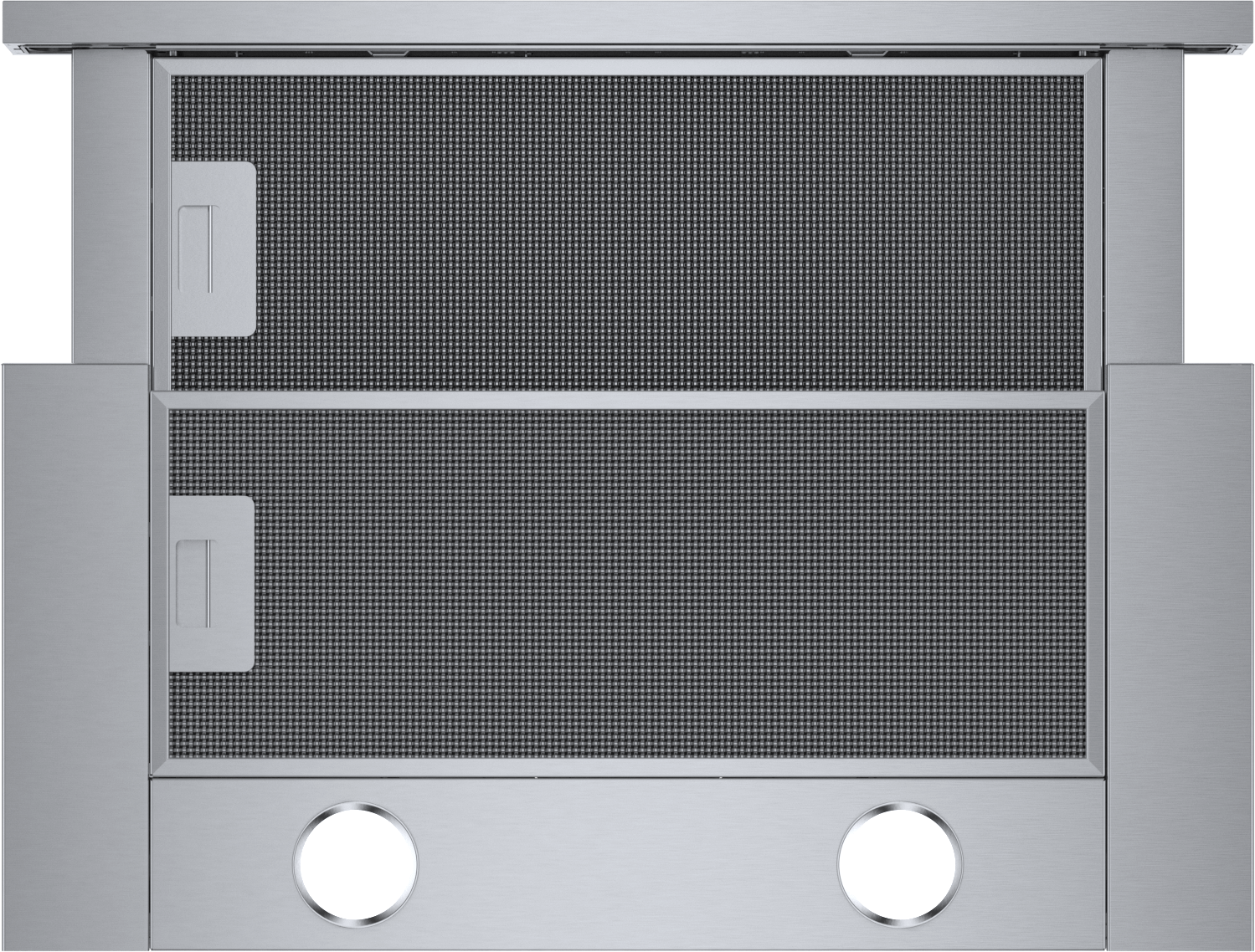 The Bosch HUI54452UC is a 24-inch pull-out under-cabinet range hood that combines functionality with a minimalist design. Part of Bosch's 500 Series, this hood offers a 400 CFM blower to effectively remove smoke, odors, and grease from your cooking area. The four-speed fan control allows you to adjust ventilation intensity to match your cooking needs, while the bright LED lighting ensures optimal visibility of your cooktop. The dishwasher-safe aluminum mesh filters make maintenance simple and convenient. When not in use, the pull-out visor retracts to create a flush appearance with your cabinetry, maintaining the sleek aesthetics of your kitchen.