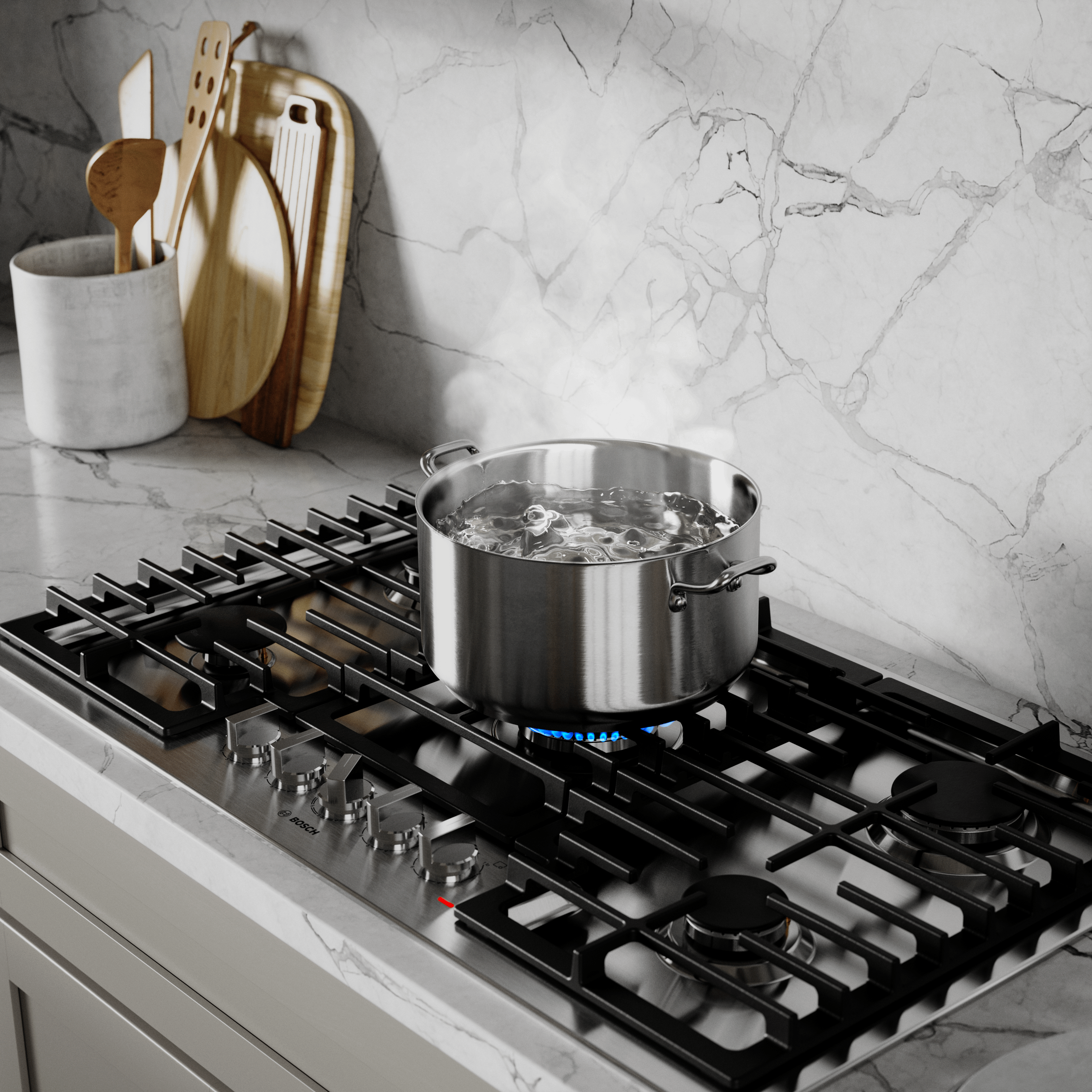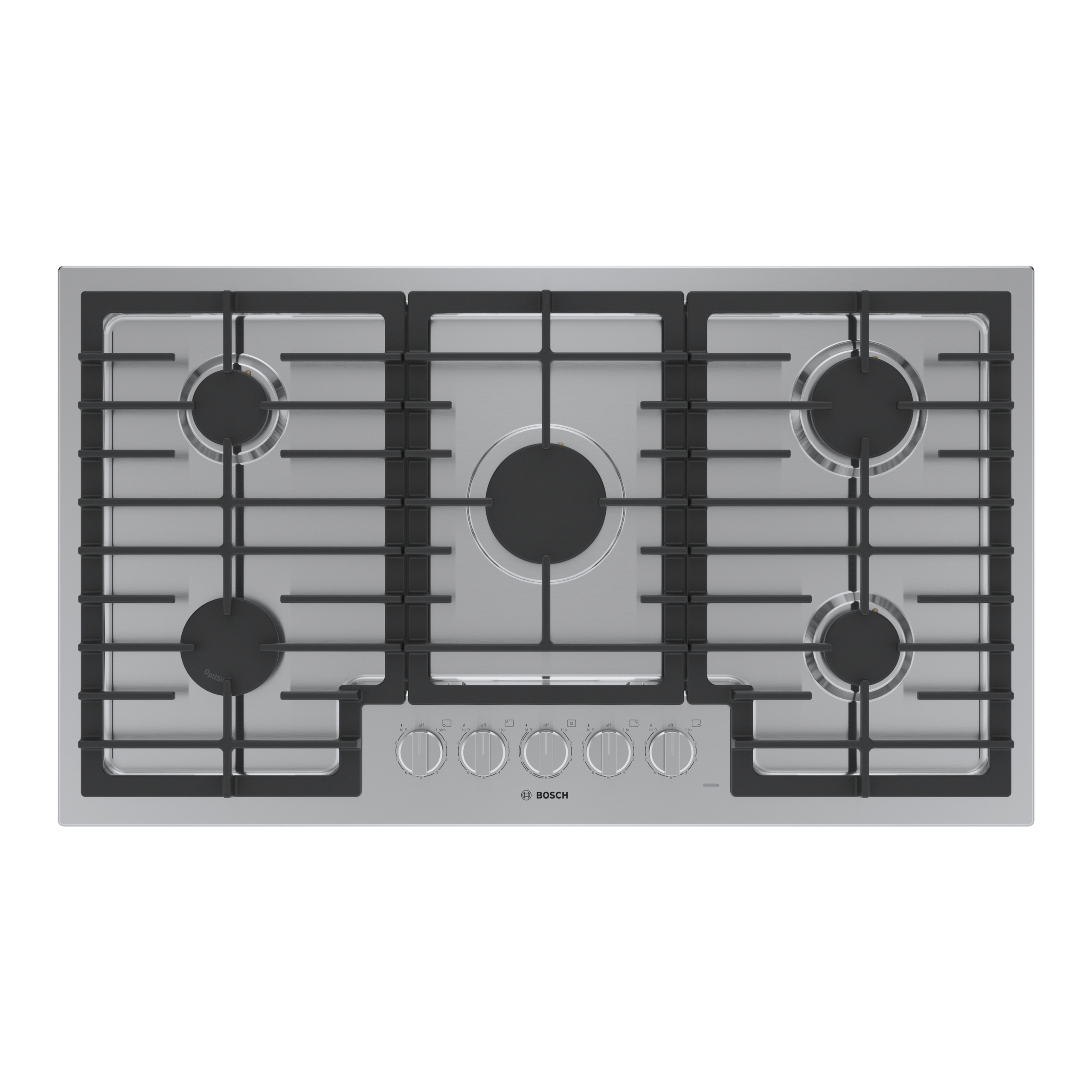 The Bosch NGM5659UC 30-inch gas cooktop offers a blend of style and performance for any modern kitchen. The five sealed burners include an 18,000 BTU high-output burner for quick boiling, searing, and stir-frying, along with simmer burners for delicate cooking. The continuous cast-iron grates offer stability and facilitate smooth movement of pots and pans across the cooktop.