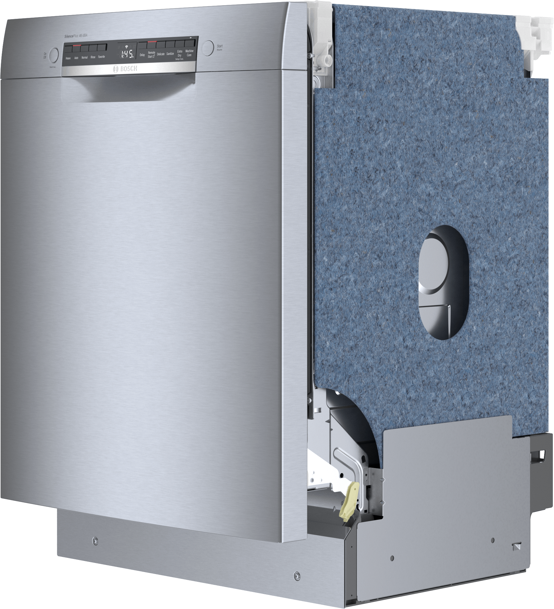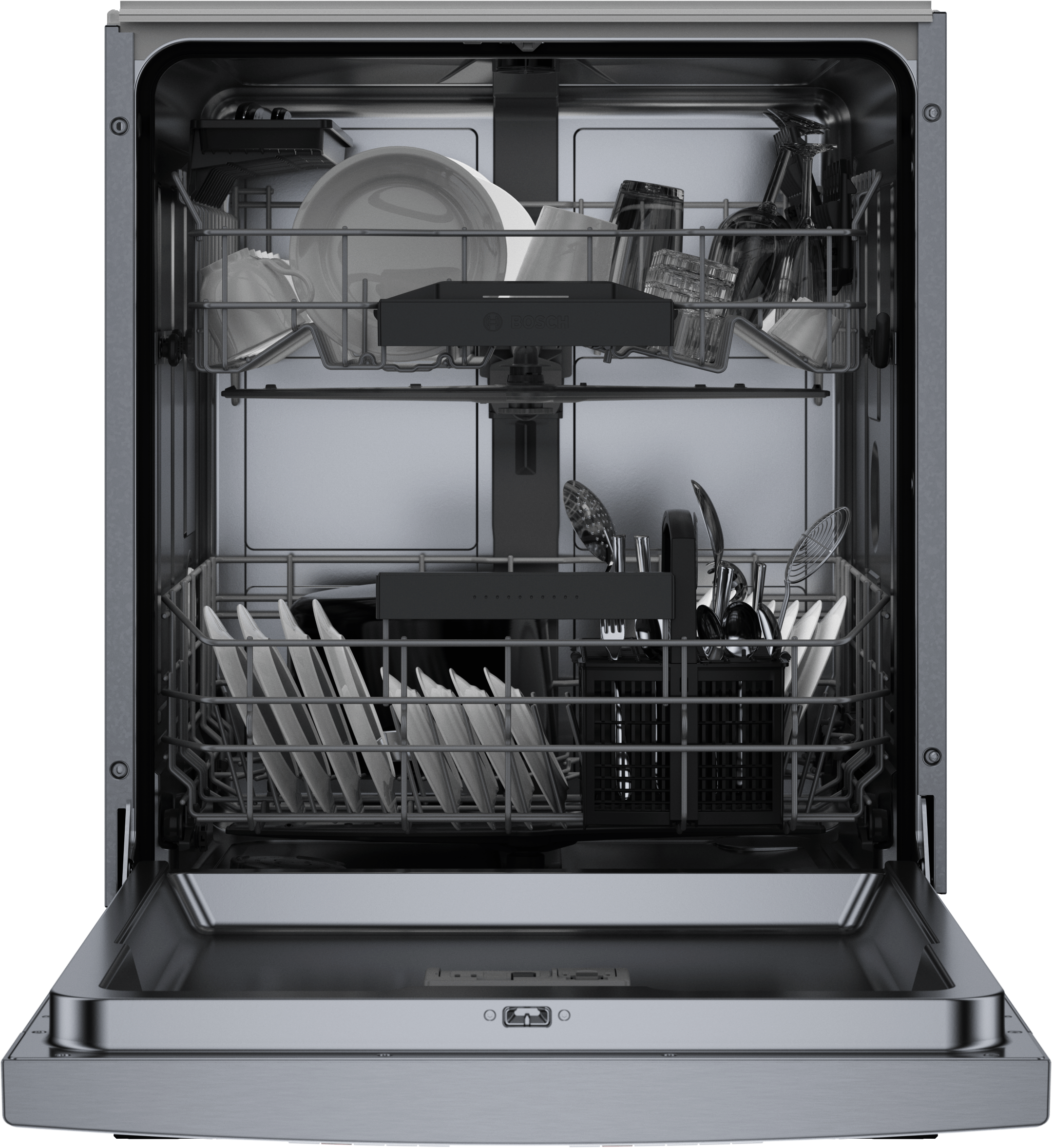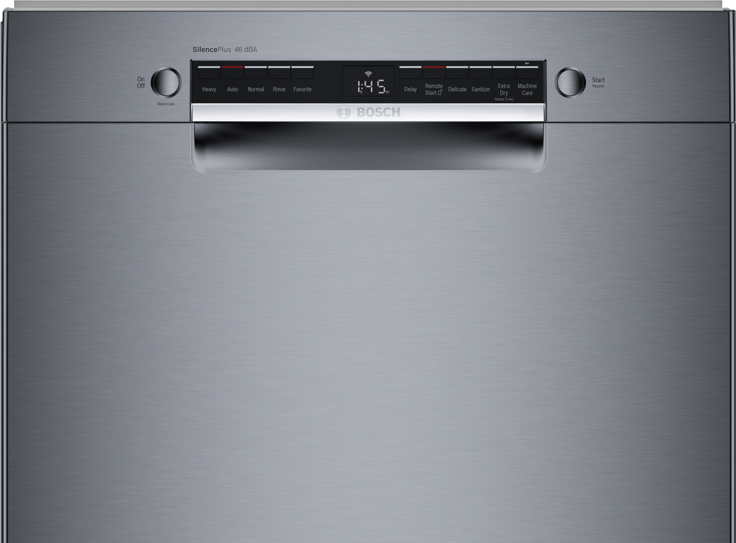 The Bosch SGE53C55UC dishwasher combines advanced technology with user-friendly features to deliver exceptional cleaning performance. Its PrecisionWash® system utilizes intelligent sensors to monitor wash water and automatically adjust the cycle, ensuring a thorough clean for every load. The PureDry® system is an energy-efficient drying method that safely dries dishes, including plastics, without the need for a rinse aid. Operating at a quiet 46 dBA, this dishwasher maintains a peaceful kitchen environment. The RackMatic® adjustable upper rack offers nine different positions, accommodating taller items like stemware or providing space for pots and pans below. With Home Connect™ integration, users can enjoy hands-free voice operation with Amazon Alexa or Google Assistant, and benefit from smart reordering of detergent tabs via the Amazon Alexa app. The Favorite button allows for easy access to preferred cycle and option combinations with a single touch. Additionally, the AquaStop Plus® system detects leaks with a dual sensor setup and contains them for premium protection. This dishwasher is ENERGY STAR® certified, ensuring energy efficiency, and its ADA-compliant design makes it suitable for users with specific height requirements.