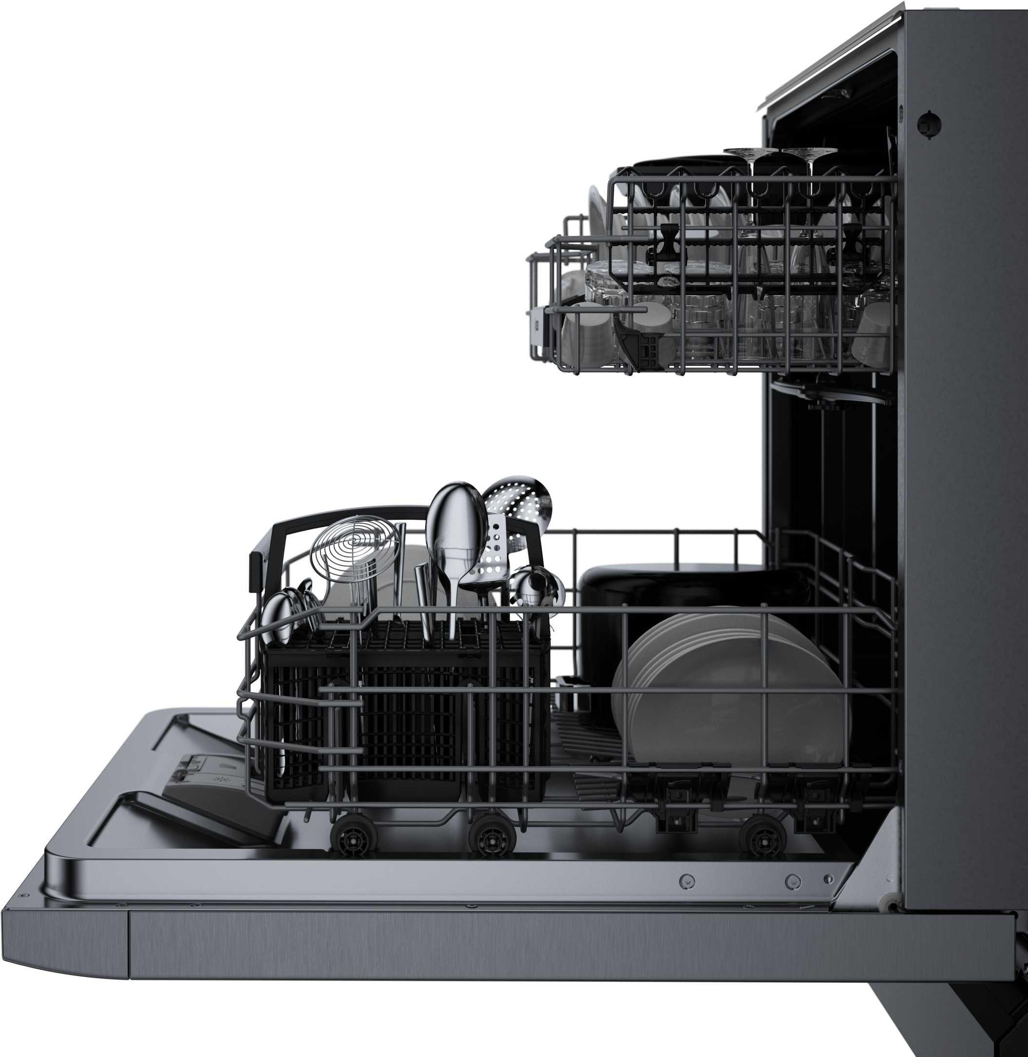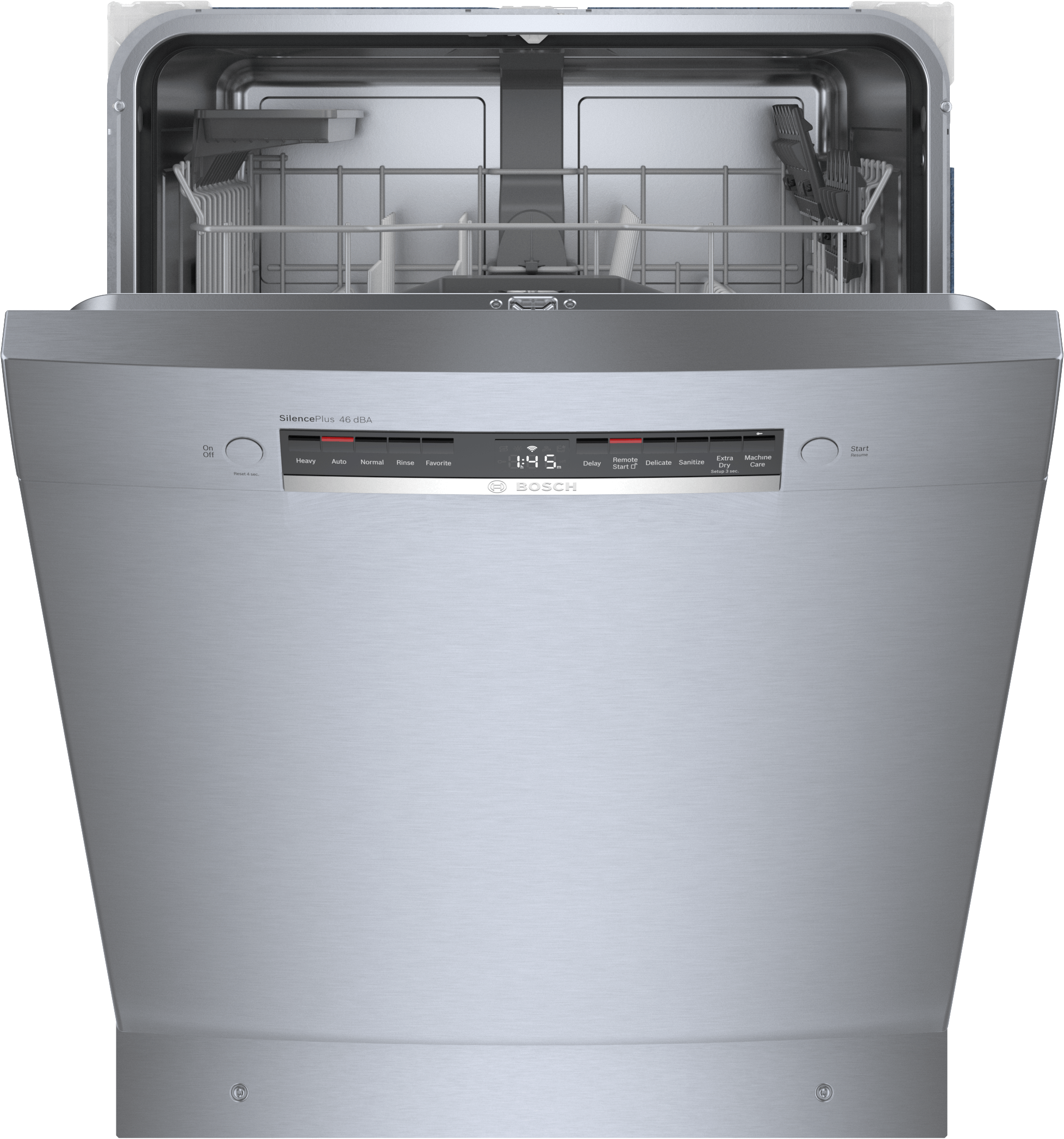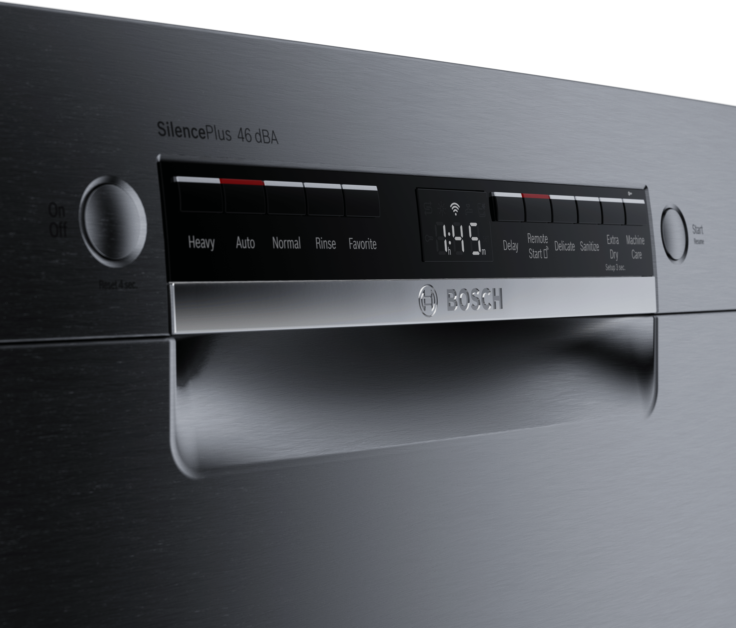 The Bosch SGE53C55UC dishwasher combines advanced technology with user-friendly features to deliver exceptional cleaning performance. Its PrecisionWash® system utilizes intelligent sensors to monitor wash water and automatically adjust the cycle, ensuring a thorough clean for every load. The PureDry® system is an energy-efficient drying method that safely dries dishes, including plastics, without the need for a rinse aid. Operating at a quiet 46 dBA, this dishwasher maintains a peaceful kitchen environment. The RackMatic® adjustable upper rack offers nine different positions, accommodating taller items like stemware or providing space for pots and pans below. With Home Connect™ integration, users can enjoy hands-free voice operation with Amazon Alexa or Google Assistant, and benefit from smart reordering of detergent tabs via the Amazon Alexa app. The Favorite button allows for easy access to preferred cycle and option combinations with a single touch. Additionally, the AquaStop Plus® system detects leaks with a dual sensor setup and contains them for premium protection. This dishwasher is ENERGY STAR® certified, ensuring energy efficiency, and its ADA-compliant design makes it suitable for users with specific height requirements.