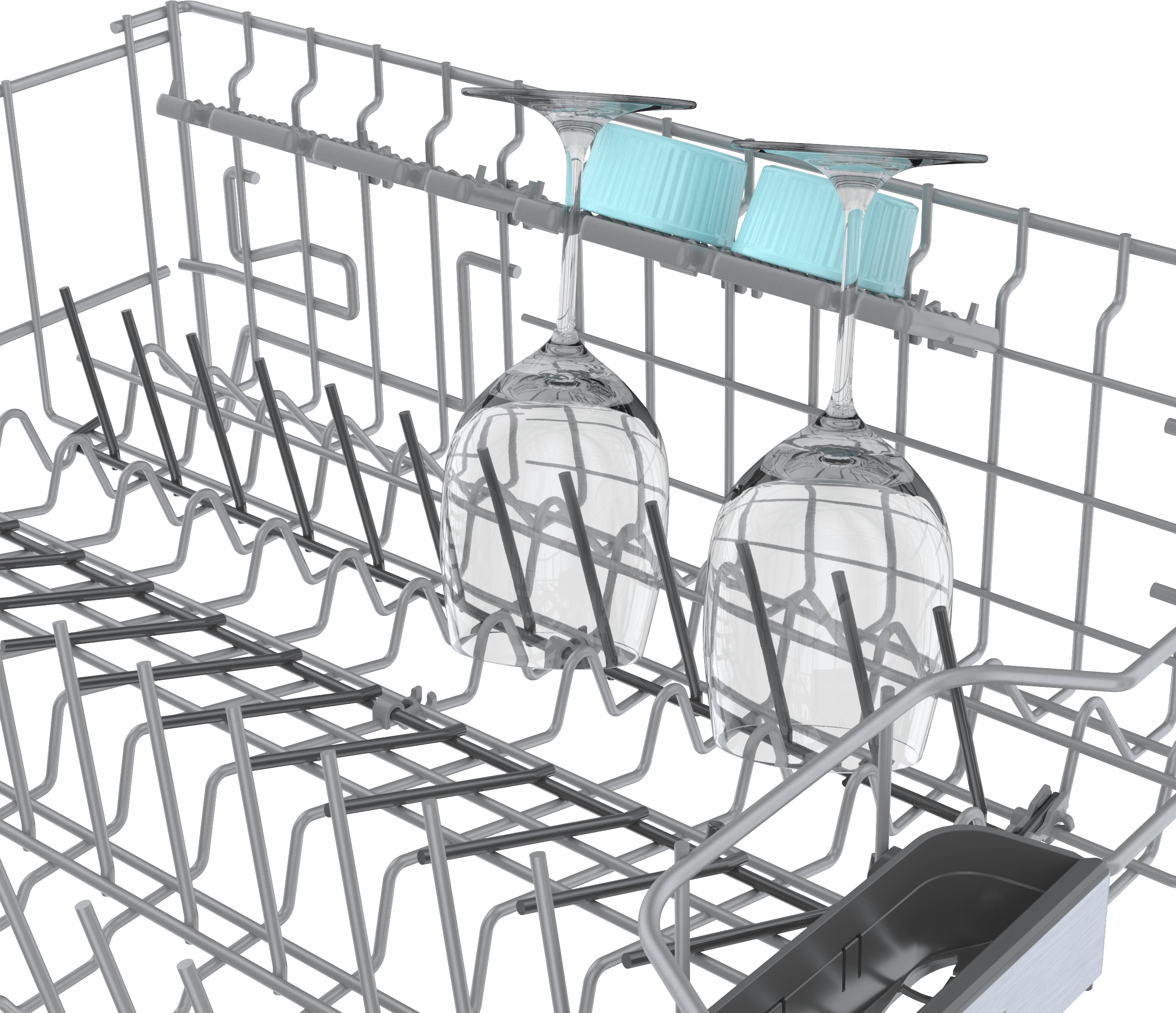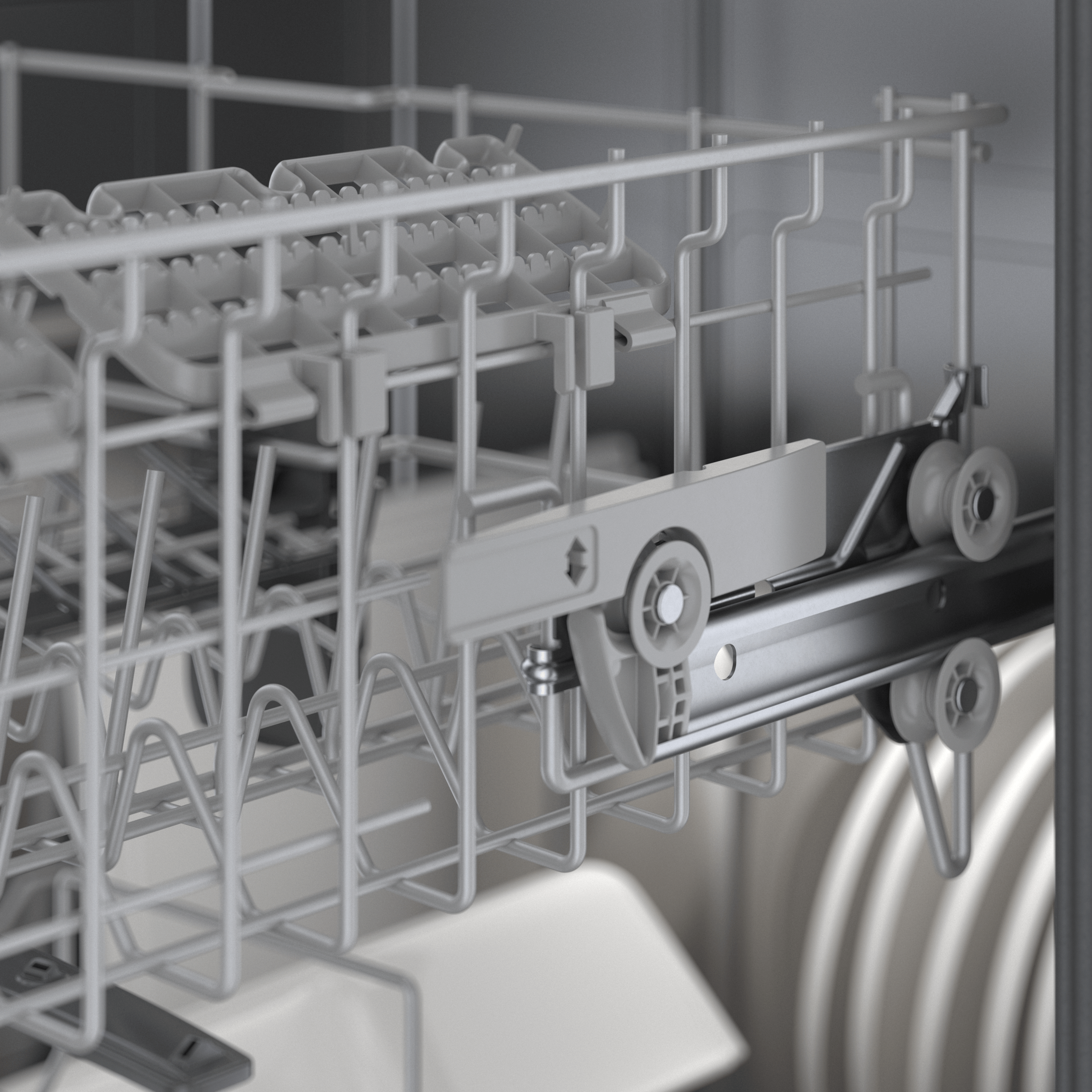 The dishwasher's PureDry® system provides energy-efficient drying, allowing you to safely place plastics anywhere, even on the bottom rack, without fear of melting. The RackMatic® adjustable upper rack offers nine different positions, accommodating taller items like stemware or making space for pots and pans below. The Standard 3rd Rack provides a convenient top rack for your utensils, giving the other racks more space for dishes.