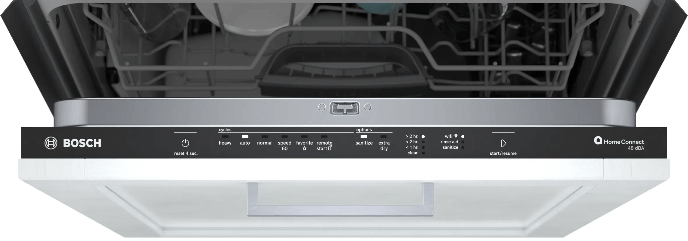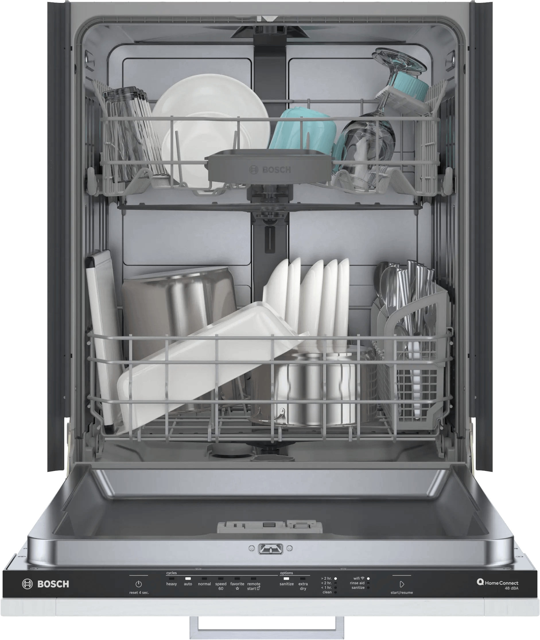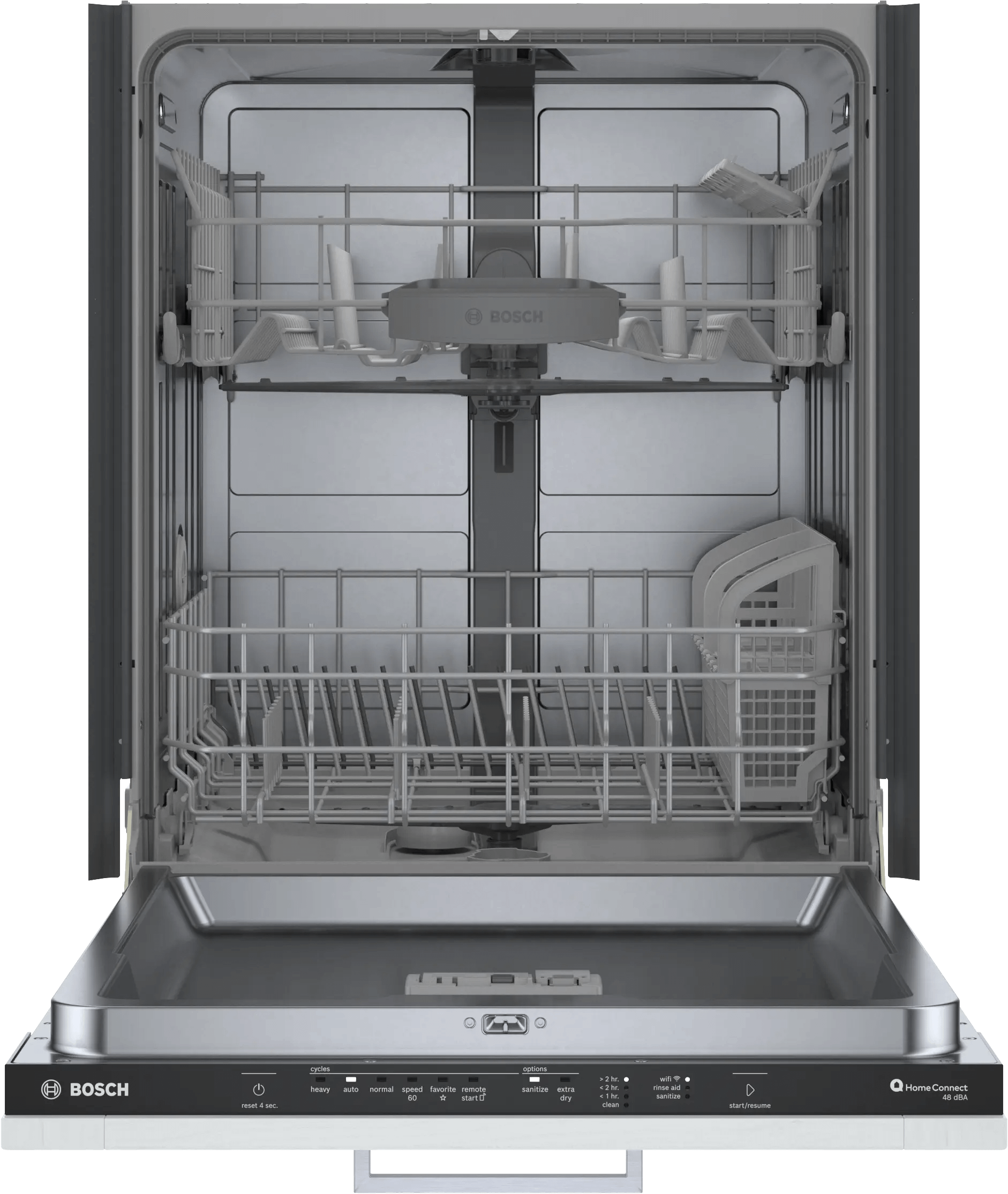 The Bosch SHV4AEB3N 100 Plus Series dishwasher offers a customizable panel-ready design, seamlessly integrating into your kitchen cabinetry for a sleek, uniform look. Its spacious interior accommodates up to 14 place settings, making it suitable for both daily use and entertaining. The RackMatic® system provides three height levels and nine possible rack positions, allowing for flexible loading of various dishware sizes. PrecisionWash® technology utilizes intelligent sensors to monitor the wash water and automatically adjust the cycle for a smarter clean, while PureDry® ensures energy-efficient drying without the use of an exposed heating element, making it safe for plastics. Operating at a quiet 48 dBA, this dishwasher won't disrupt your household activities. With Home Connect® integration, you can monitor and control your dishwasher remotely, access additional wash cycles, and receive notifications, enhancing your overall user experience.