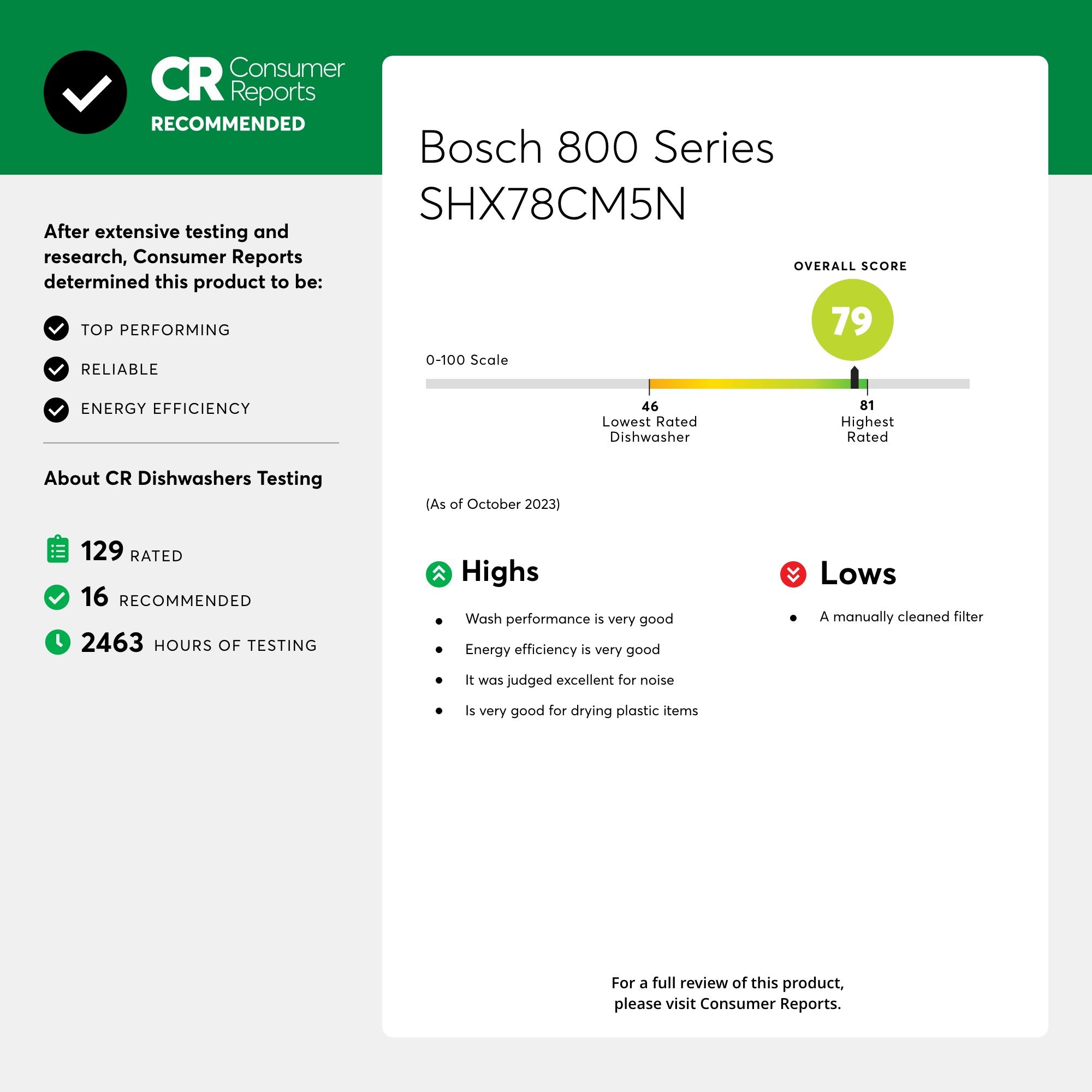 The Bosch SHX78CM5N 800 Series dishwasher combines advanced technology with sleek design to deliver superior cleaning performance. Its spacious interior accommodates up to 16 place settings, making it ideal for families and entertaining. The flexible third rack provides 30% more loading area, perfect for utensils and small dishes. With PrecisionWash® and PowerControl™ spray arms, it targets even the dirtiest dishes for a thorough clean. The CrystalDry™ feature transforms moisture into heat, achieving 60% better drying results, even on plastics. Operating at a whisper-quiet 42 dBA, it won't disrupt your household. The dishwasher is Wi-Fi enabled with Home Connect®, allowing you to monitor and control it remotely, access additional wash cycles, and receive notifications. The stainless steel exterior with an anti-fingerprint finish ensures it remains smudge-free, maintaining its elegant appearance.