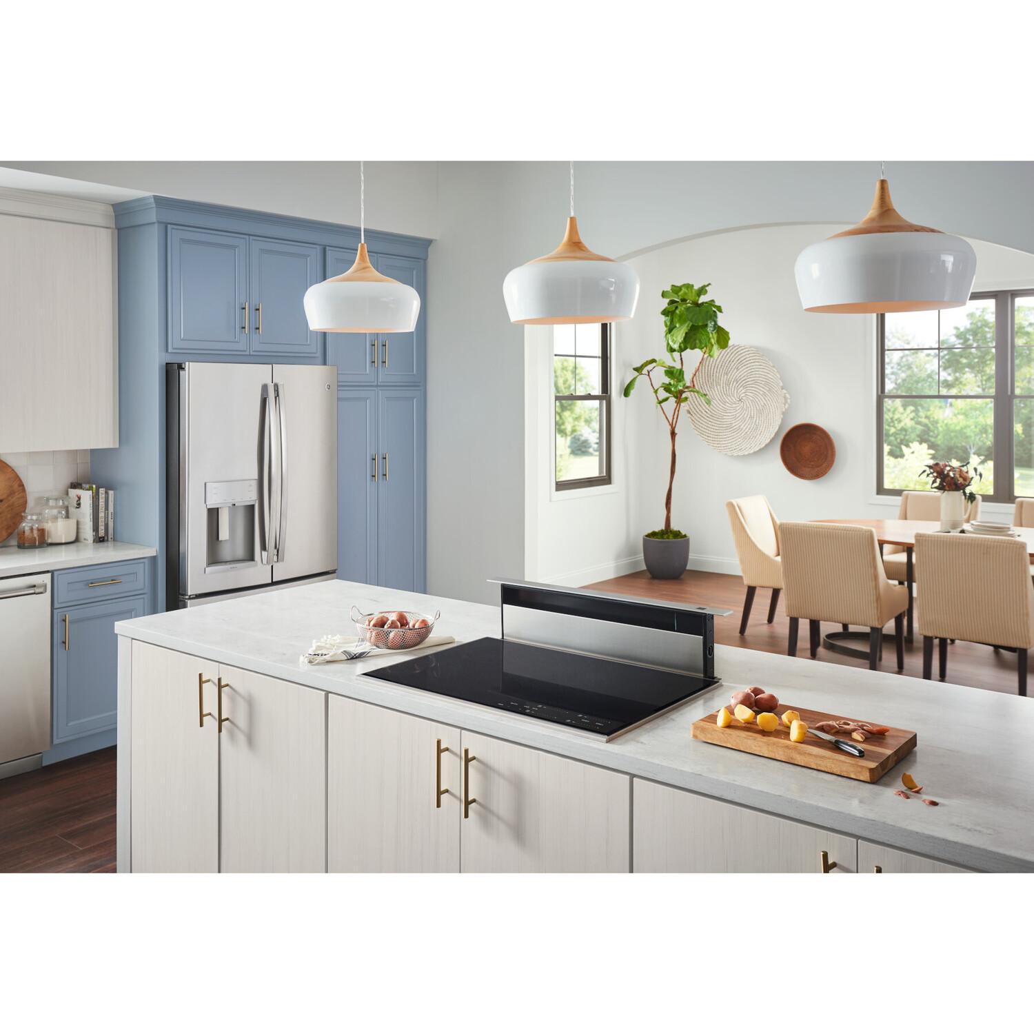 Innovative downdraft system compatible with virtually all self-contained cooktops. Sleek, trim styling complements any cooktop style or color. Automatically raises into position with the touch of a button. Disappears flush with cooktop surface. Space-saving design lets you make the most of precious, under-counter cabinet space. Infinitely adjustable speed control is flush with the side of the unit; inconspicuous, yet easy to reach and simple to use. Blower discharges right, left or down and slides side-to-side to ease installation (insufficient space for built-in ovens). Front access panel allows easy cleaning.