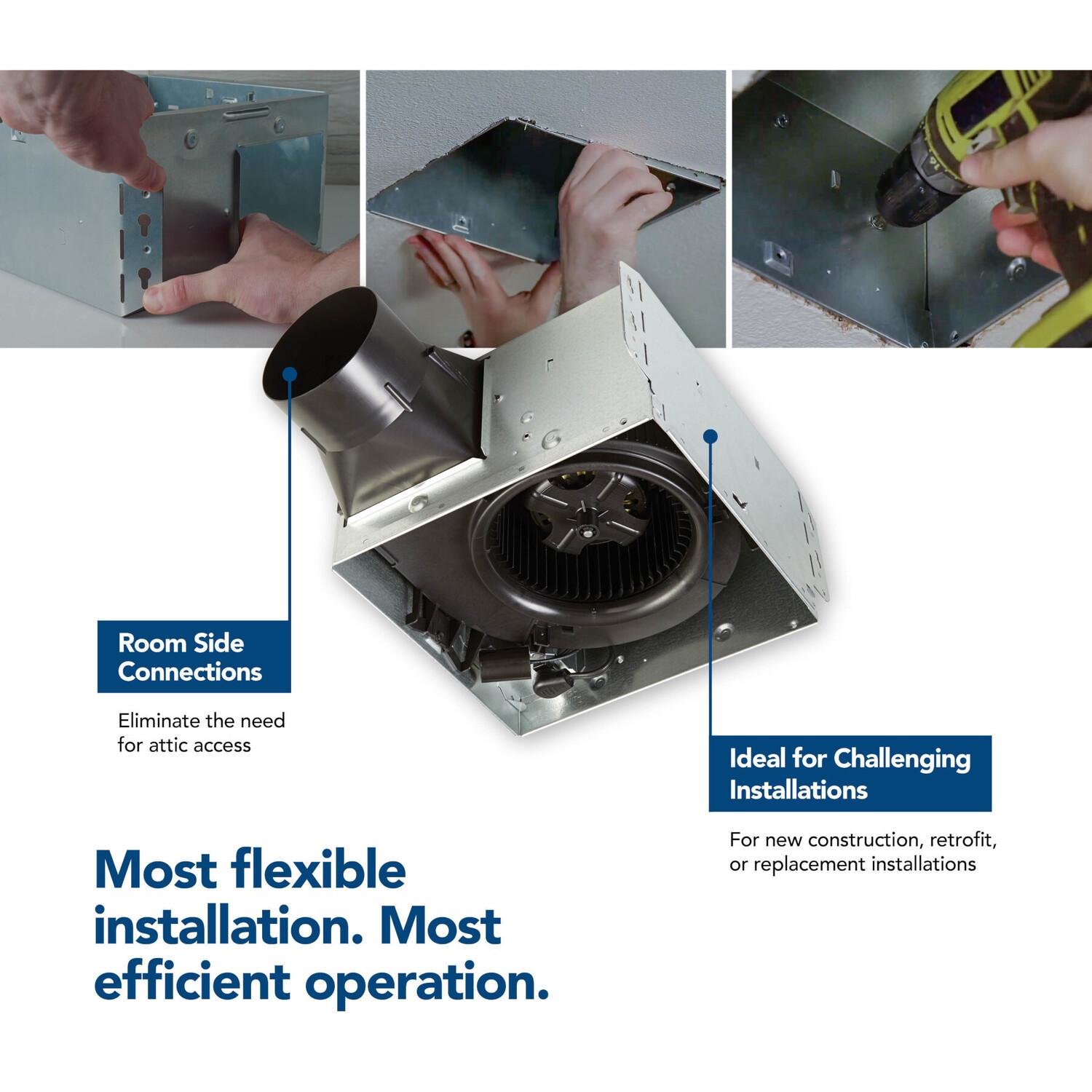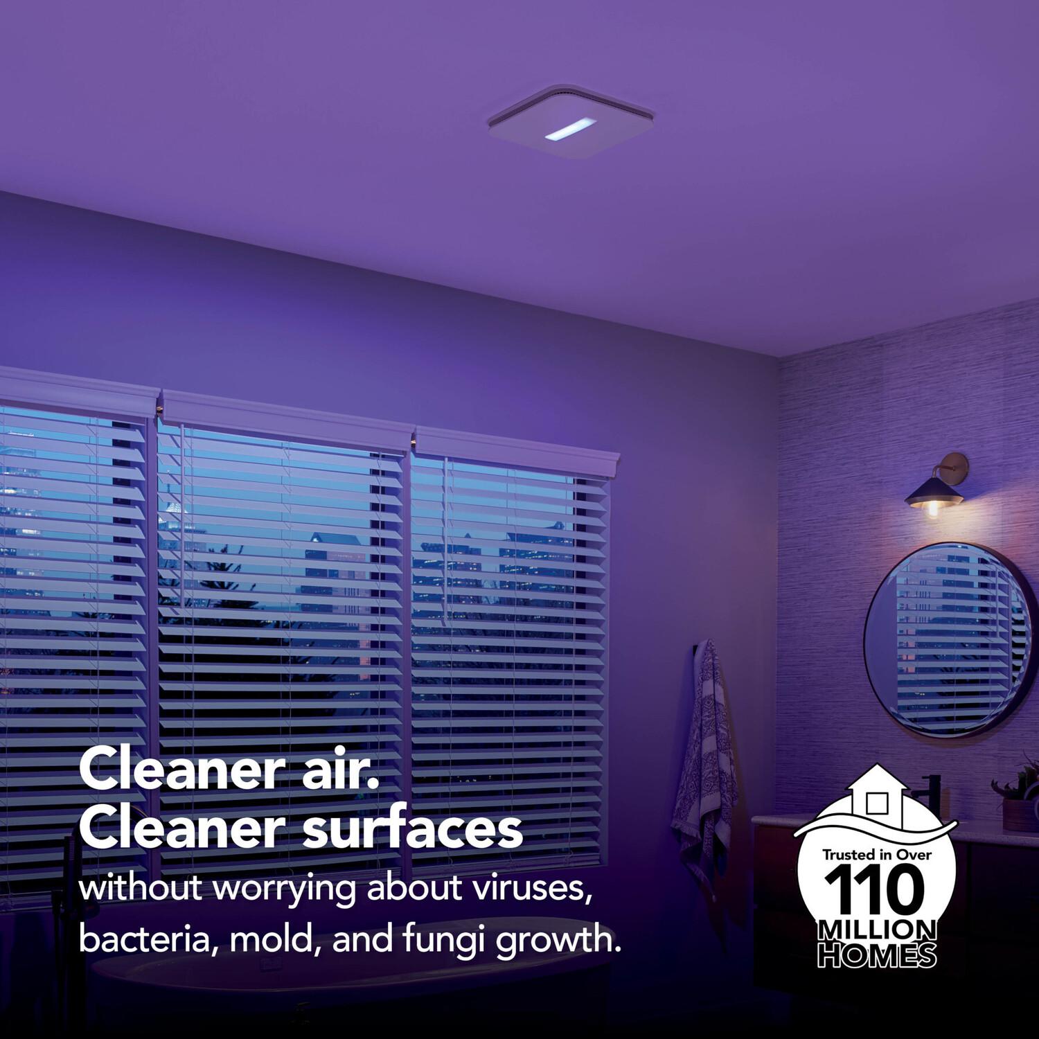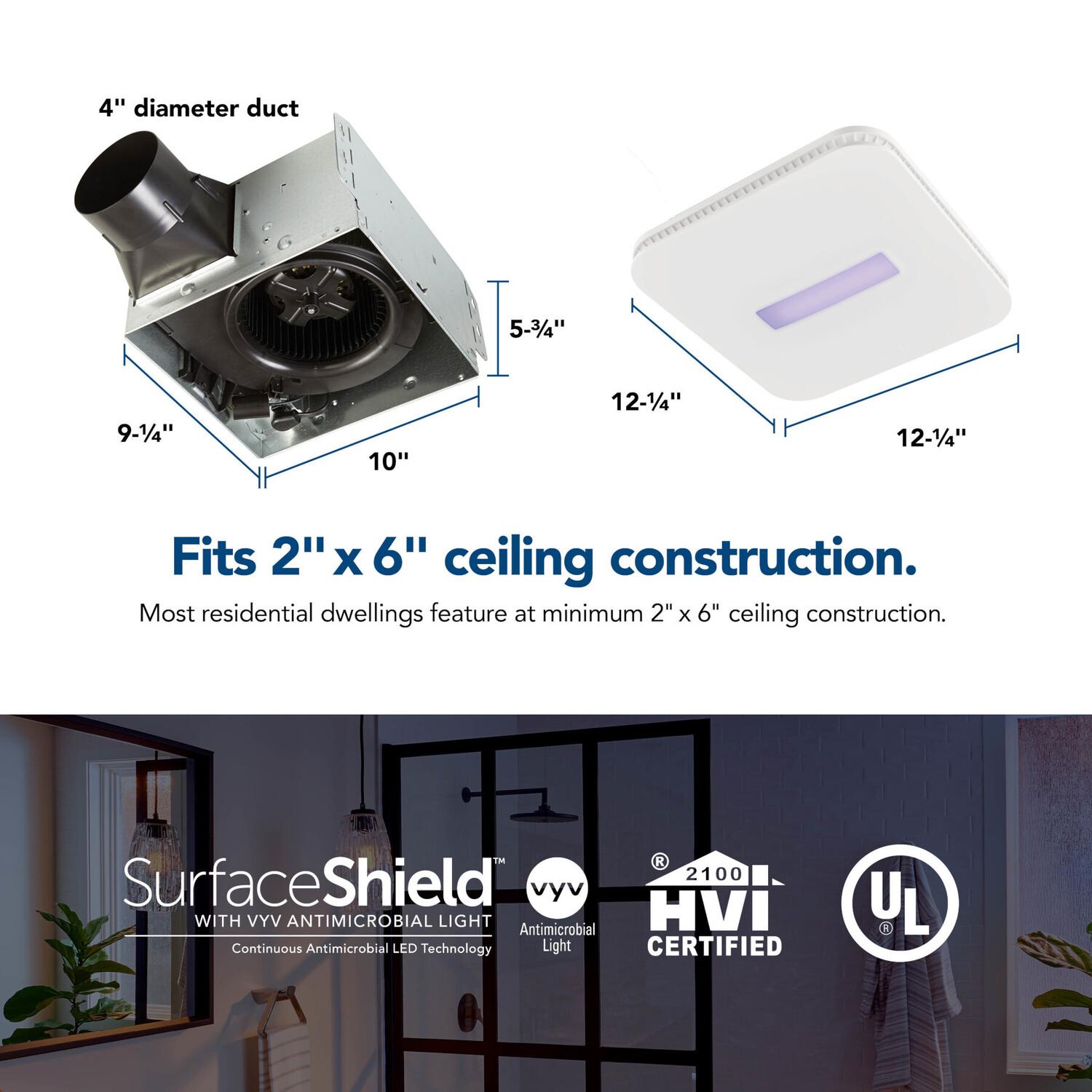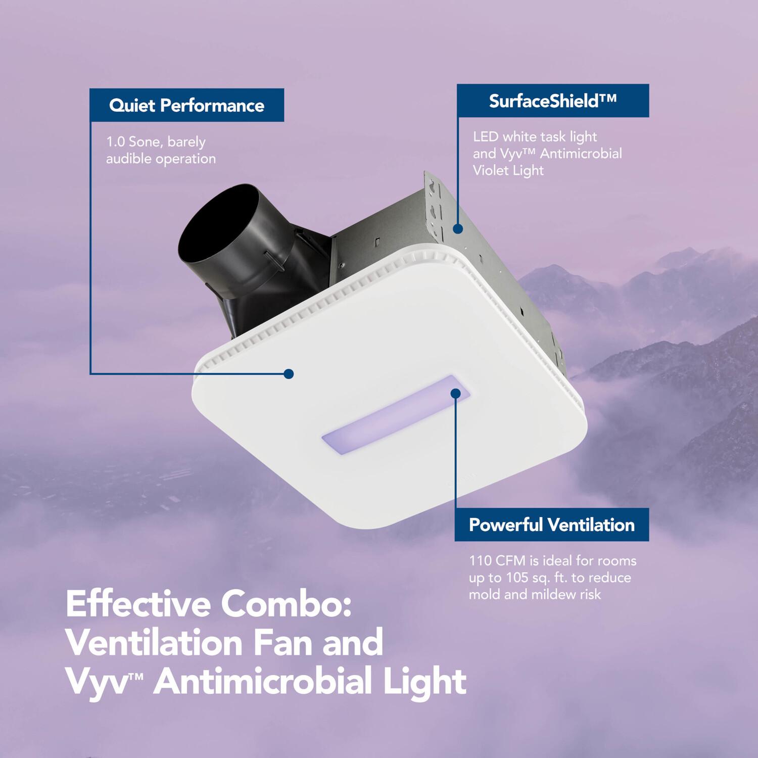 SurfaceShield(TM) technology combined with Broan-NuTone s powerful ventilation Kills* Viruses and offers effective protection against bacteria, mold, and fungi growth in your bathroom or other humidity prone environments. Offering super-quiet sound rating of 1.0 sone, the Broan-NuTone(R) SurfaceShield(TM) 110 CFM Exhaust Bath Fan generates powerful air circulation with minimal background noise. There are two lighting modes in the SurfaceShield(TM) LED light, an everyday white light perfect for task lighting and the SurfaceShield(TM) continuous antimicrobial mode. Broan-NuTone(R) Roomside Series fans offer an EzDuct(TM) connector for hassle-free room-side installation with no attic access needed. With the addition of the EzDuct(TM) connector, other new additions have been added including foldable mounting ears, a new damper and housing technology that improves airtightness like never before. This bath fan includes soft white LED lighting for energy savings and a grille that compliments any decor.