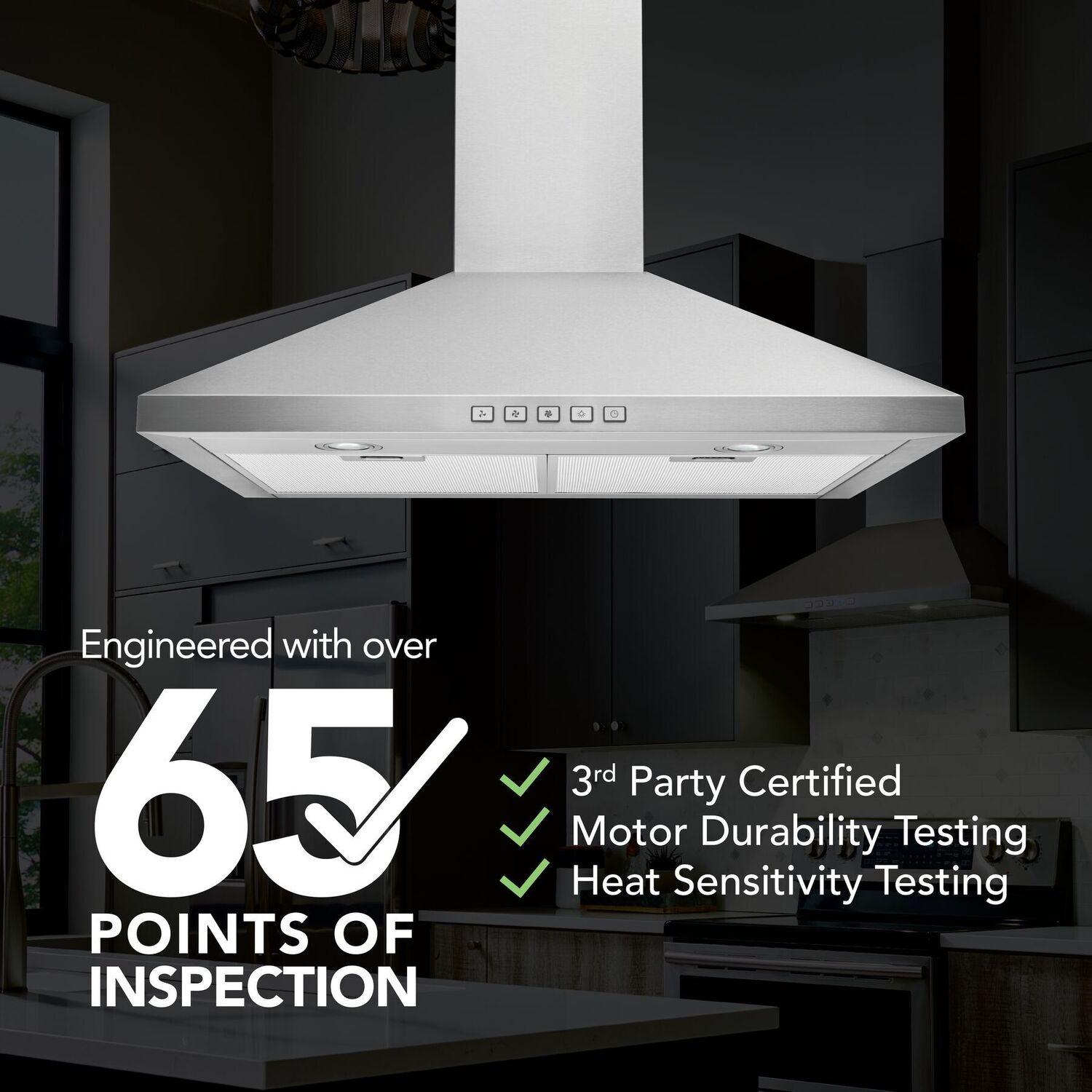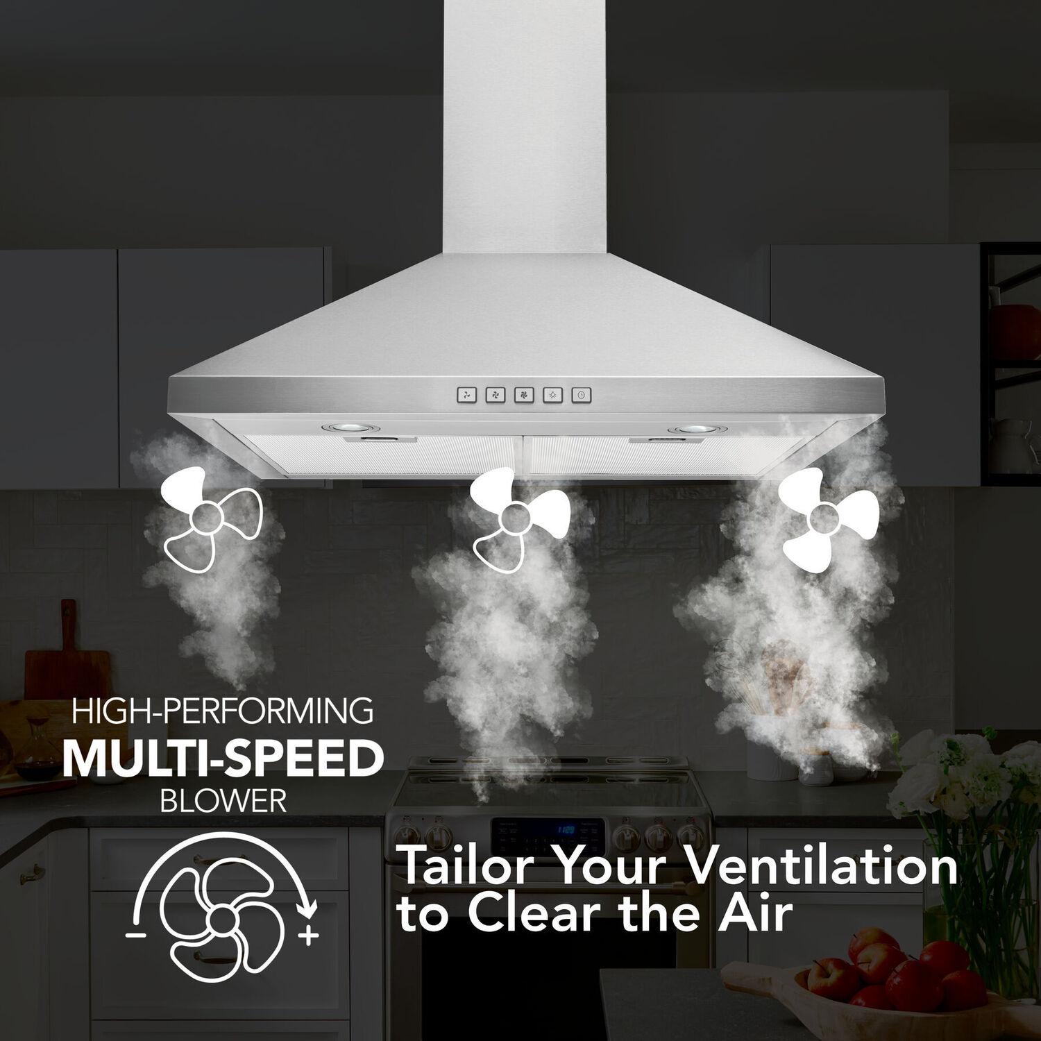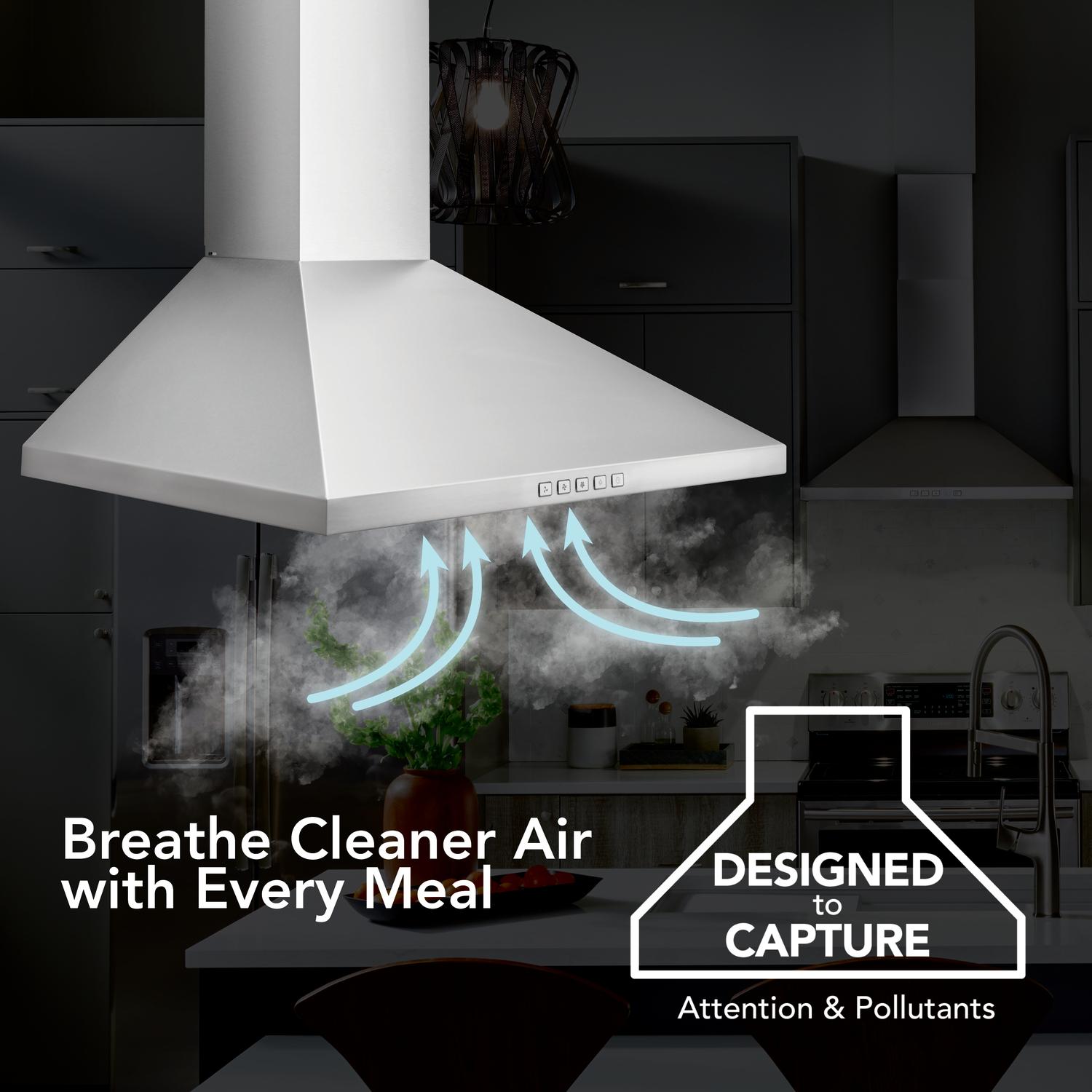 From the leader in residential indoor air quality, this Broan(R) traditional European designed range hood is the perfect solution for today's modern kitchen, available in stainless steel and accommodating of 8 to 9 foot ceilings with its telescopic flue. The kitchen is the most polluted room in the house regardless of type of cooking appliance; everything from smoke, odors and chemicals is in the air. The range hood is often forgotten as the primary and most effective way to get the pollutants out of your home. This range hood is HVI certified - guaranteed to provide efficient ventilation with 450 Max Blower CFM to remove the pollutants and improve the air you breathe. While ventilating the kitchen air, this range hood is still quiet at a sound level of 3 sones on normal speed, which is as loud as normal conversation. The bright 1-level, heat resistant LED lighting makes even the worst cook's recipe look great, while also featuring a 5 minute delay off timer and quick-release dishwasher safe filters to aid in better ventilation practices. At Broan-NuTone we believe that better quality of air means better quality of life.