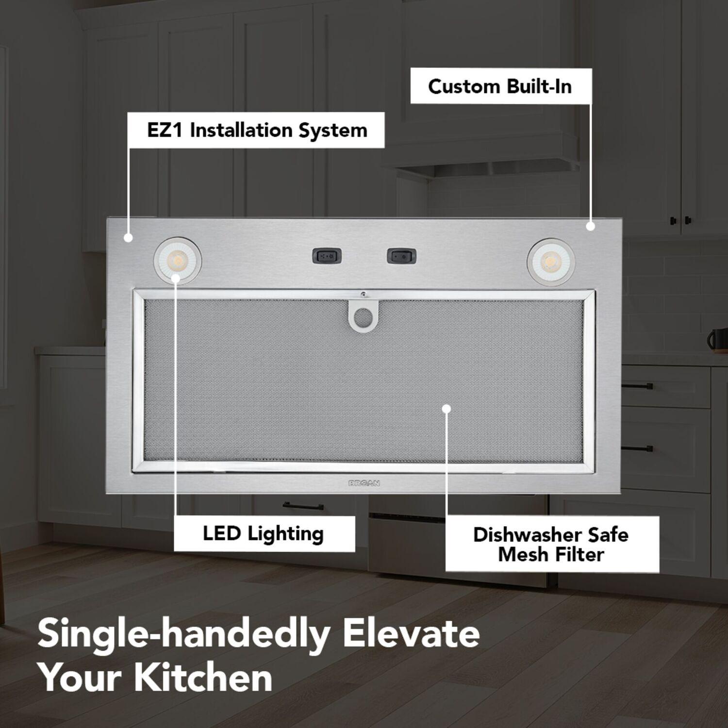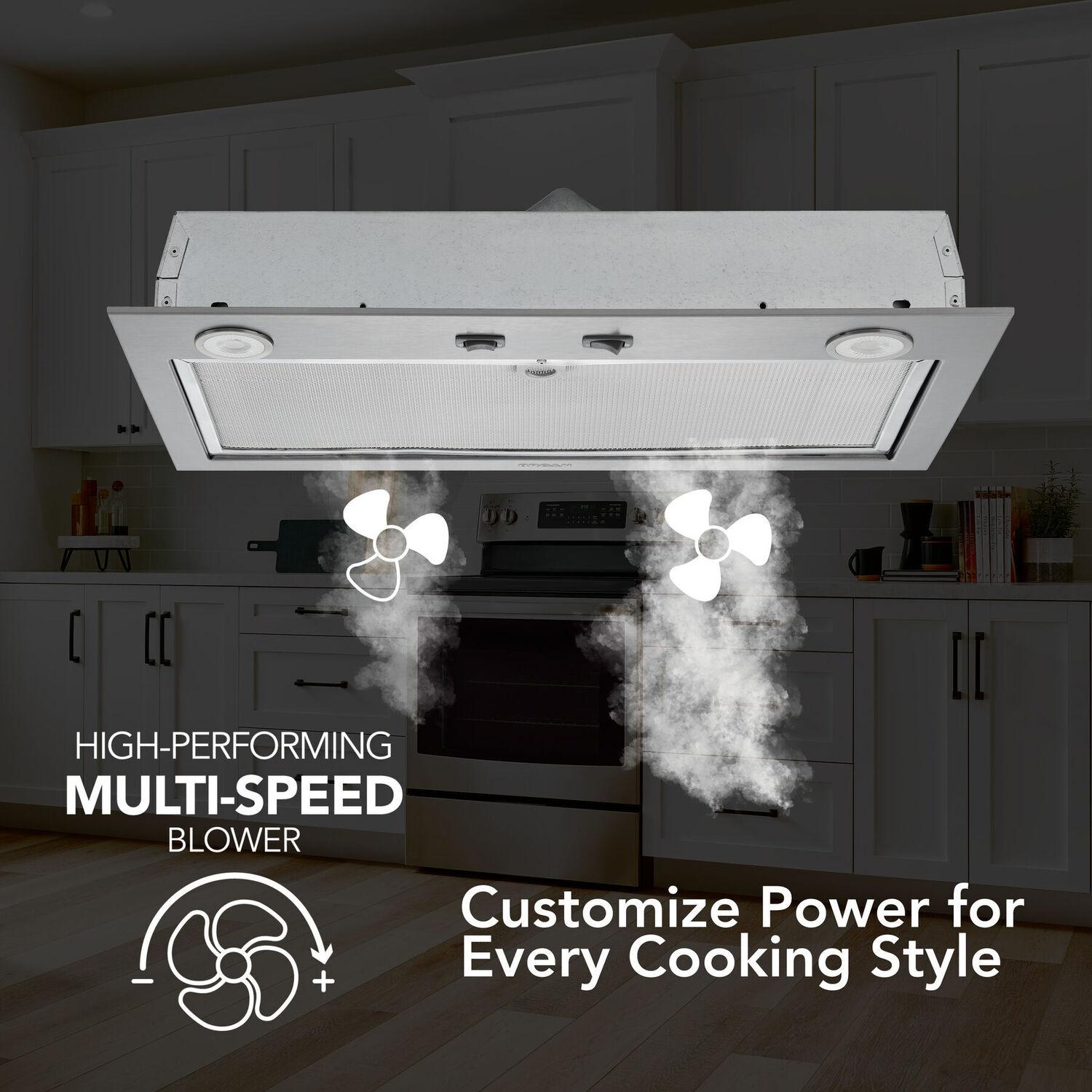 From the leader in residential indoor air quality, this Broan(R) custom range hood insert is the perfect solution for cabinet installations and custom kitchen designs featuring a smooth, stainless-steel surface that is easy to clean with quick-release dishwasher-safe filters.